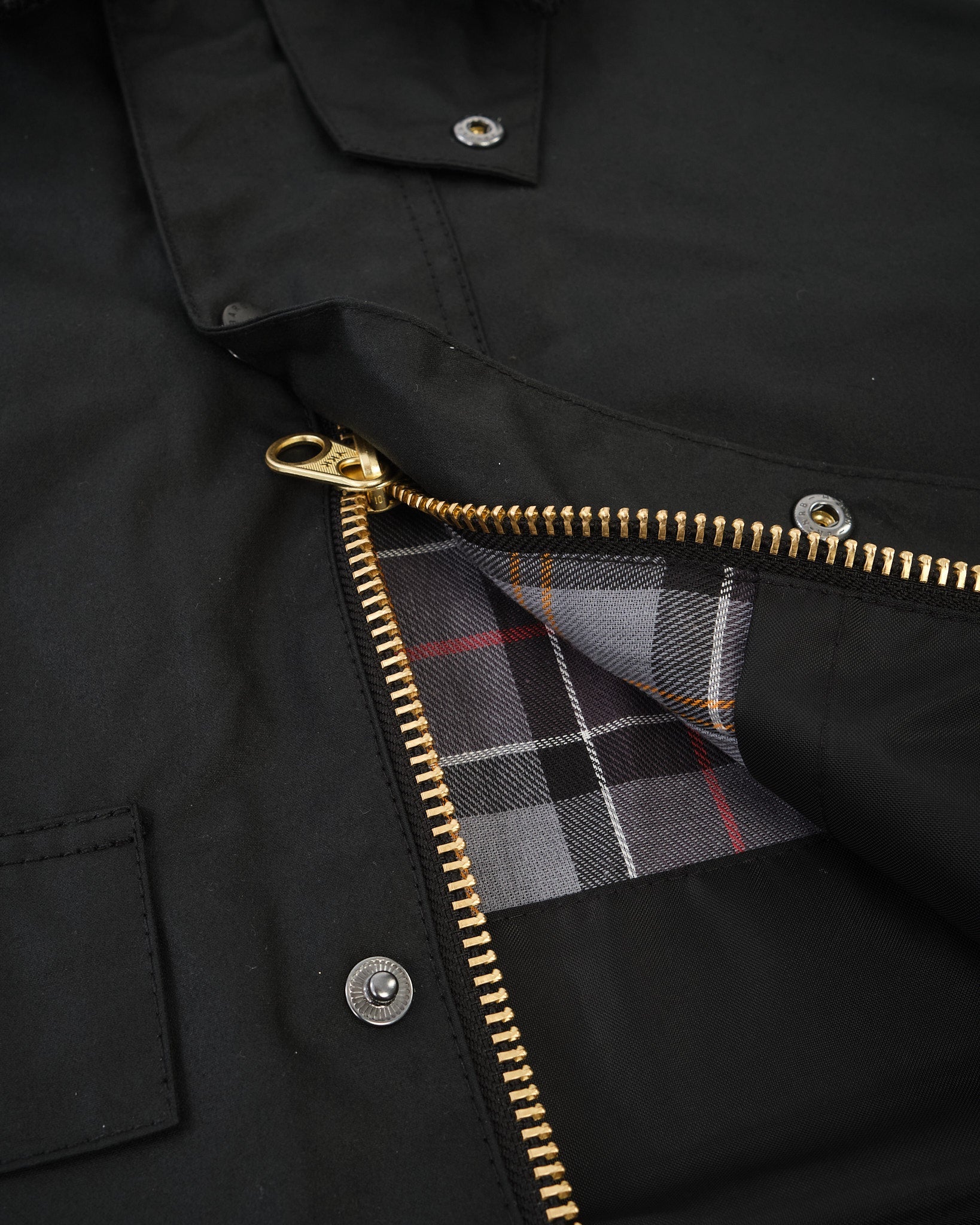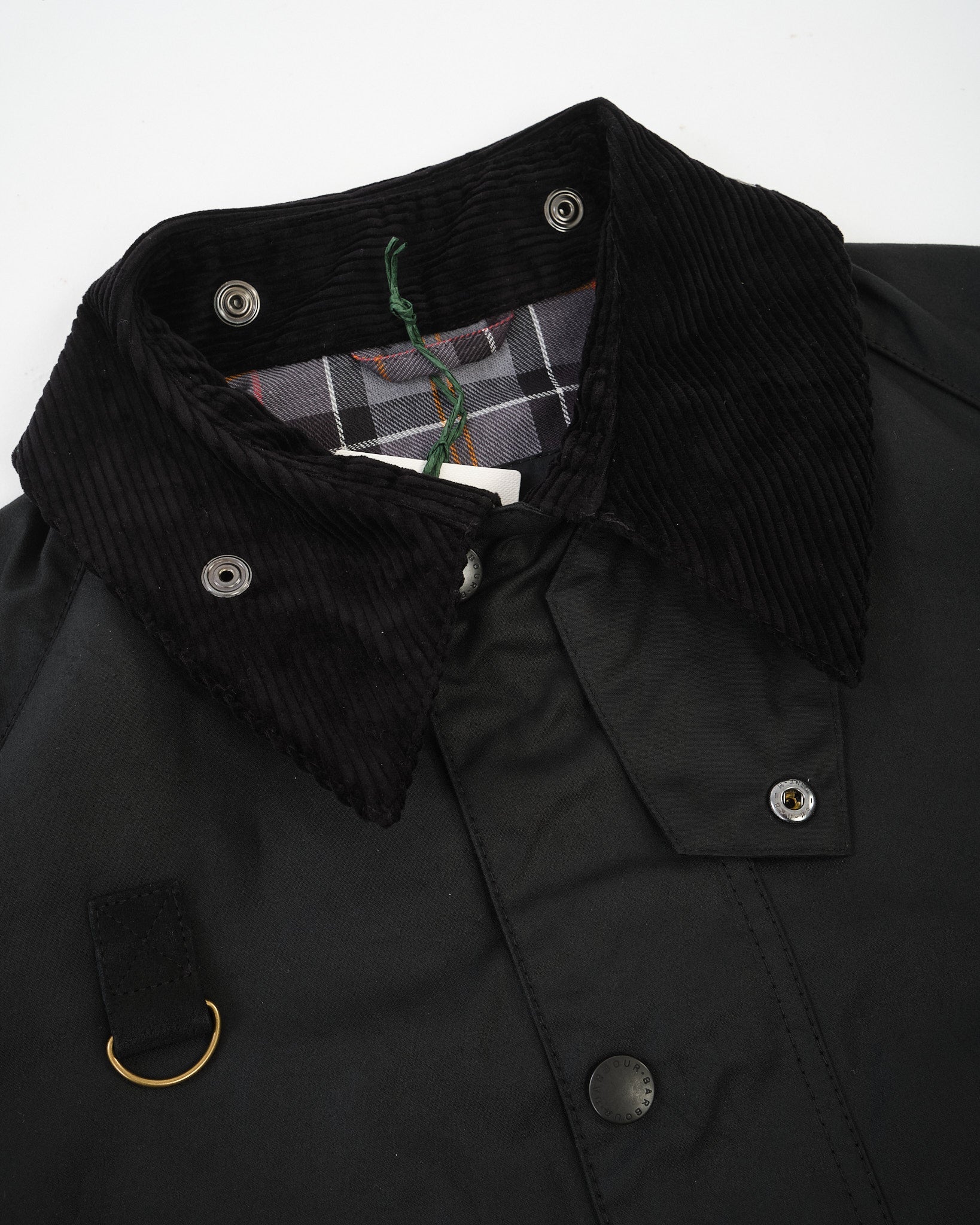 The Barbour Spey Wax Jacket in Black is a true icon of British outerwear, originally designed for fly-fishing in the Scottish Highlands. Its signature cropped fit, raglan sleeves, and boxy silhouette offer freedom of movement and timeless functionality. Made from 6oz Sylkoil waxed cotton, it provides dependable weather resistance with a slightly worn-in matte finish. Details like the corduroy collar with throat strap, storm flap over the brass zip, and two press-stud bellows pockets stay true to its heritage, while Barbour’s classic tartan lining adds a refined touch. Durable, practical, and unmistakably Barbour — a jacket built to last through seasons of use.