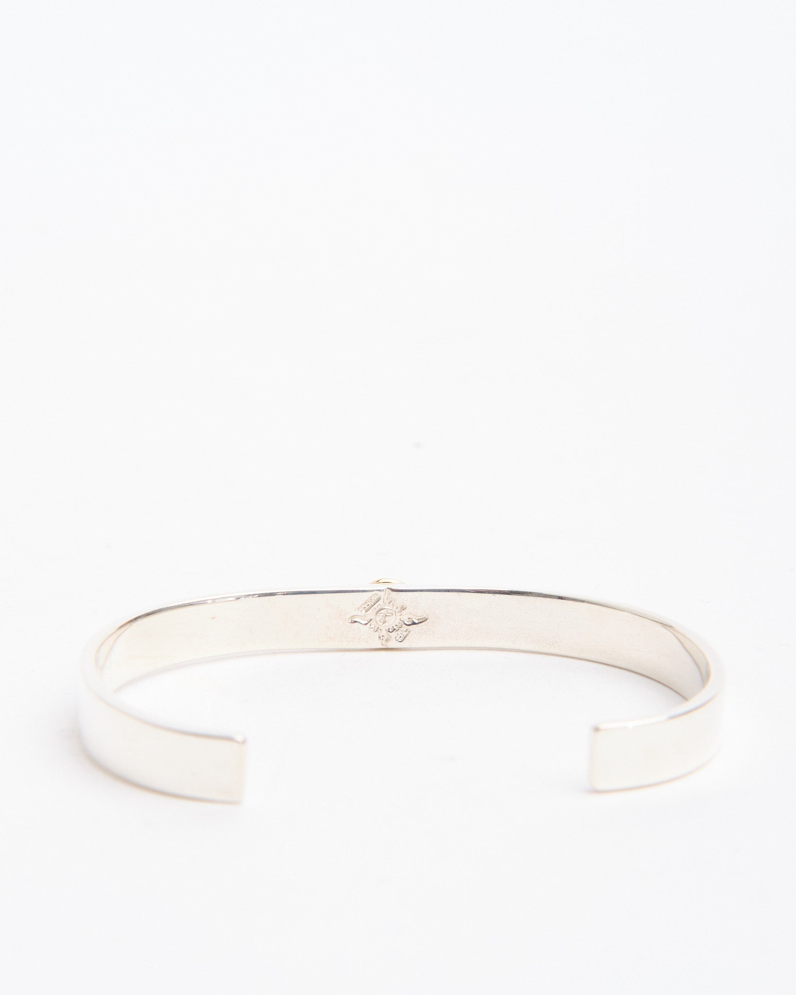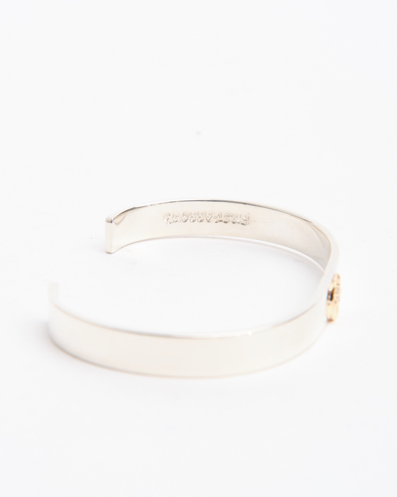 The Flat Hammered 8mm Plane Bungle with K18 in M size balances bold craftsmanship with everyday wearability. Handcrafted in Japan from Britannia Silver 950, this bracelet features a slimmer 8mm profile that still carries the character of a hammered surface, each mark adding depth and reflection. A touch of 18k yellow gold brings warmth and contrast, highlighting the beauty of mixed metals. Reinforced with First Arrows’ special heat-treatment process, the silver is bright yet durable, designed to age gracefully as its tone darkens and plays against the gold’s enduring glow. Inspired by Native American jewelry but refined for modern life, this bungle is versatile enough to stand alone or to be layered with other pieces.