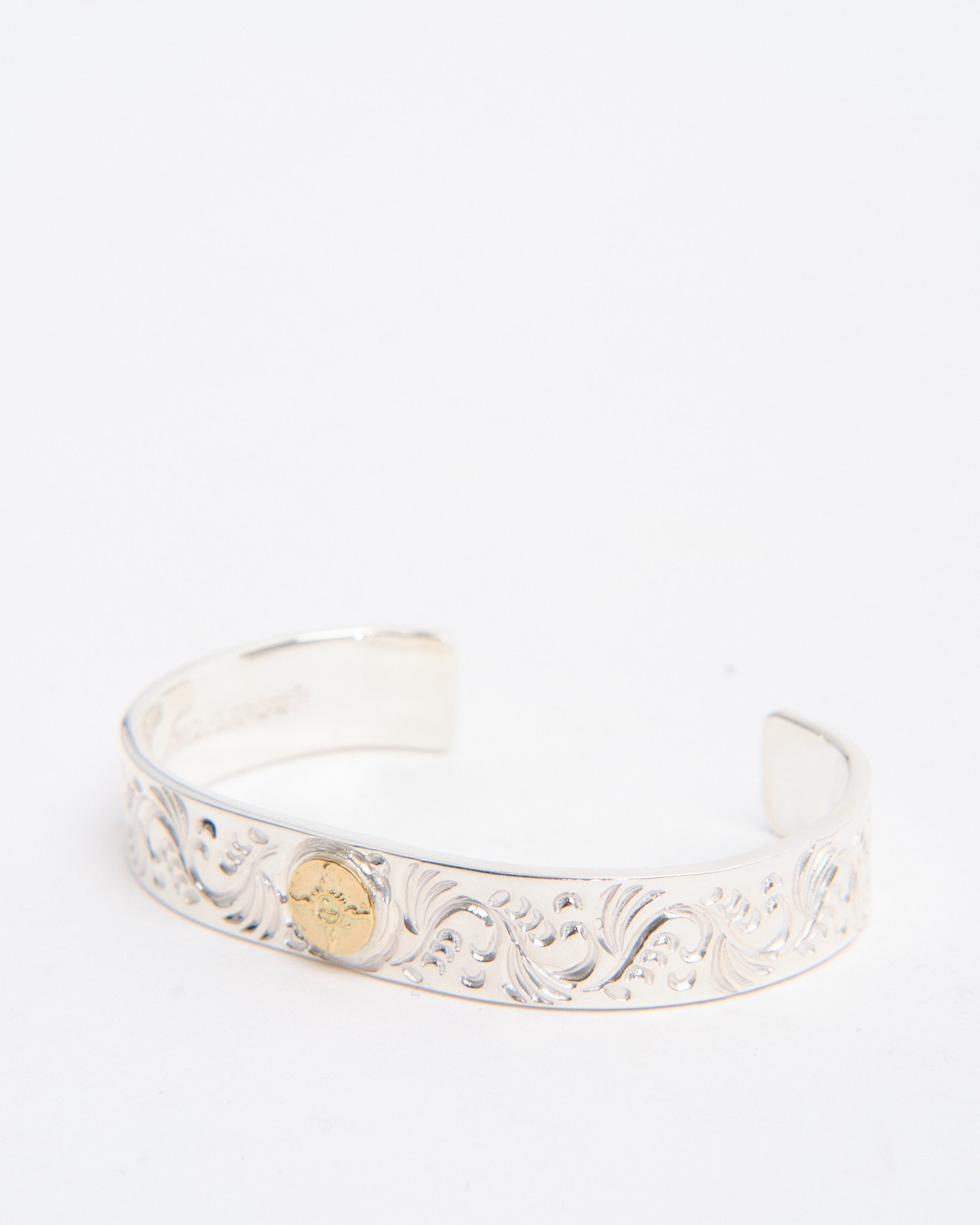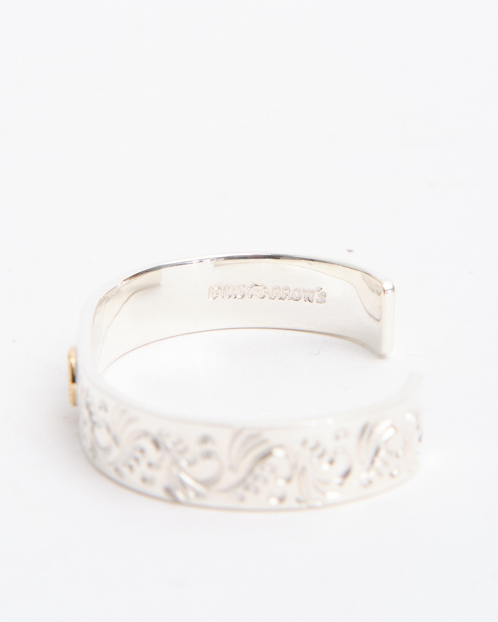 The Flat Hammered 12mm Arabesque Carving Bungle with K18 (M size) is a bold and intricate bracelet from First Arrows. Handcrafted in Japan from Britannia Silver 950, the bungle features a wide 12mm profile with a hammered surface that reflects light beautifully. Alongside the hammer work, detailed arabesque carvings add depth and artistry, showcasing traditional Japanese craftsmanship. A touch of 18k yellow gold brings warmth and contrast, highlighting the bungle’s refined character. Treated with First Arrows’ exclusive heat process, the silver is durable while retaining its brilliance. Over time, the silver darkens naturally, making the carvings and gold detail stand out even more. Symbolic, refined, and powerful, this bracelet balances cultural artistry with modern wearability.