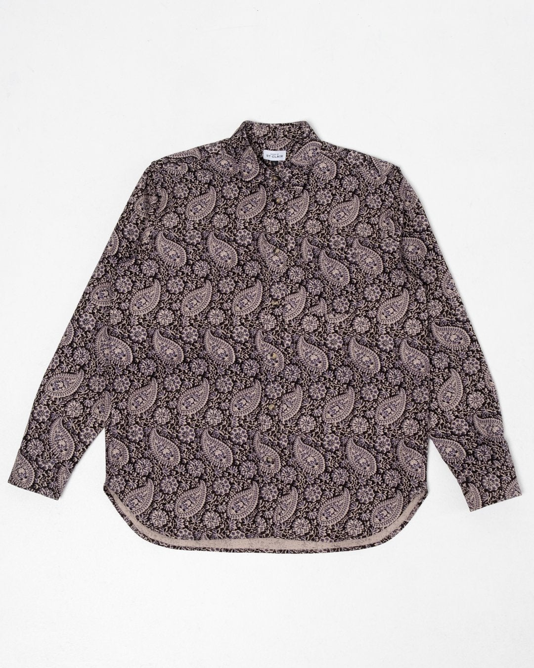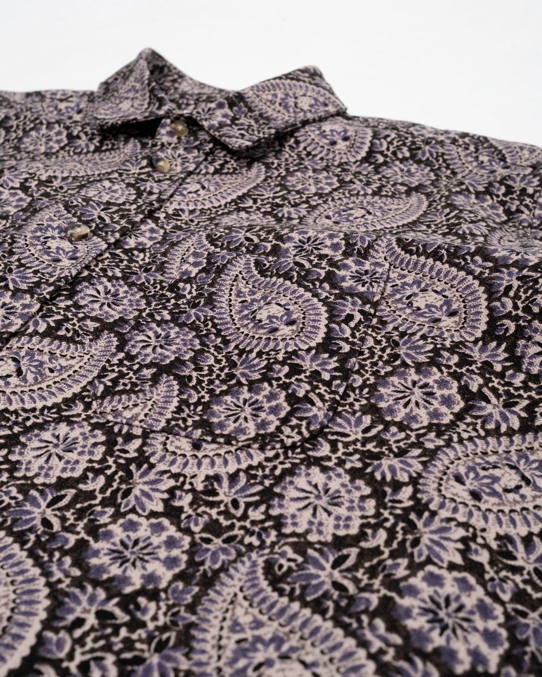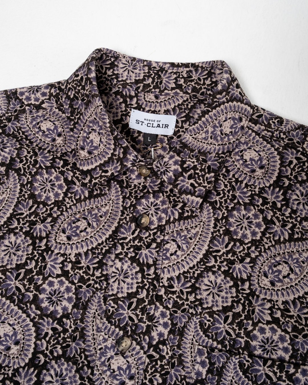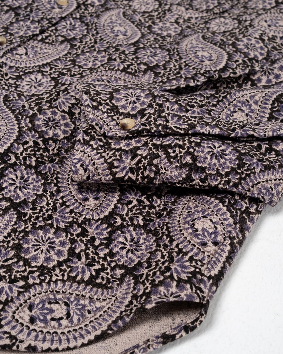 Camisa Broadway Morada Paisley de House of St. Clair. Camisa con botones en tela de algodón japonés 100% melocotón. Un bolsillo en el pecho, dobladillo recto con aberturas laterales. Botones de cuerno auténtico. Hecho en EE.UU.