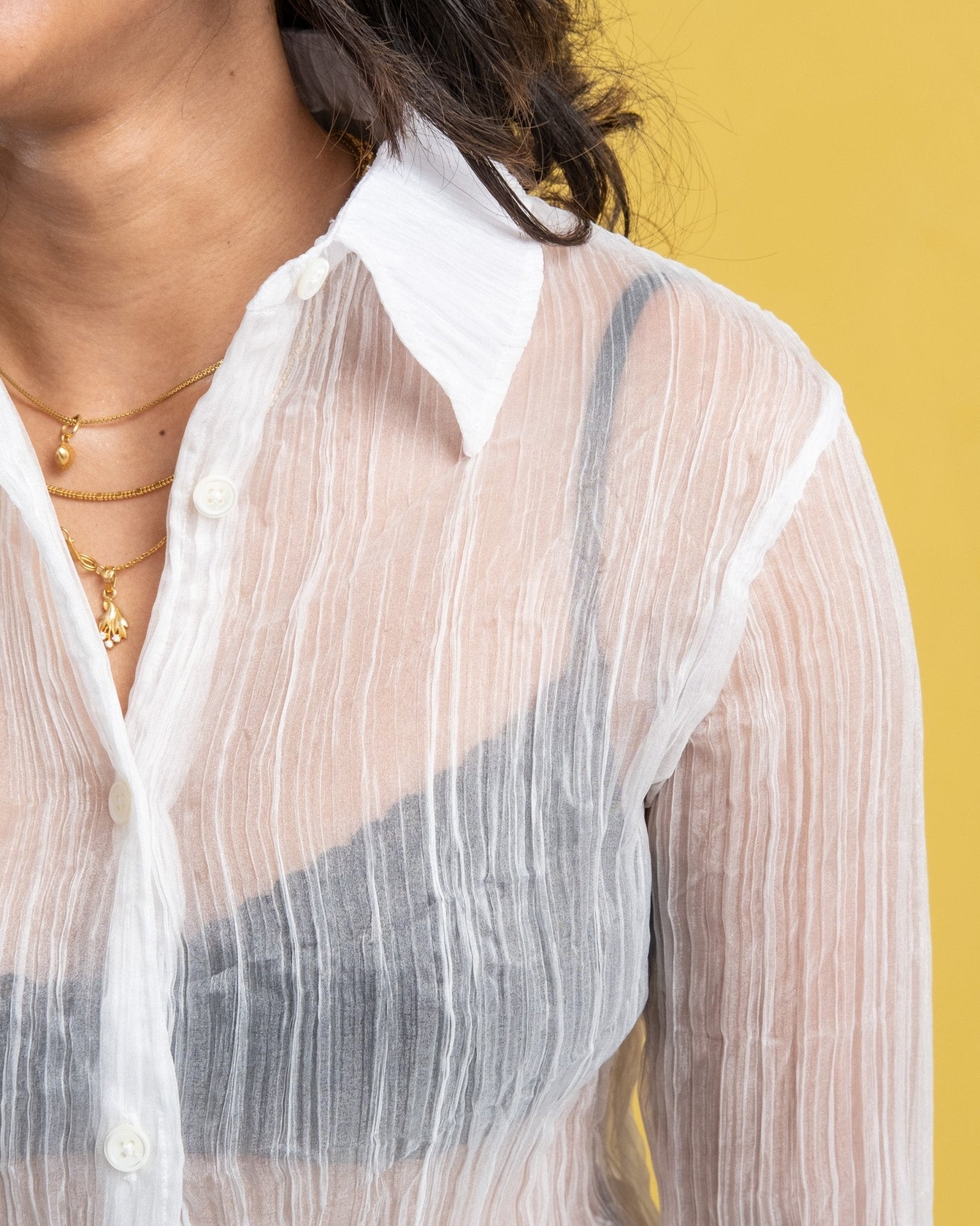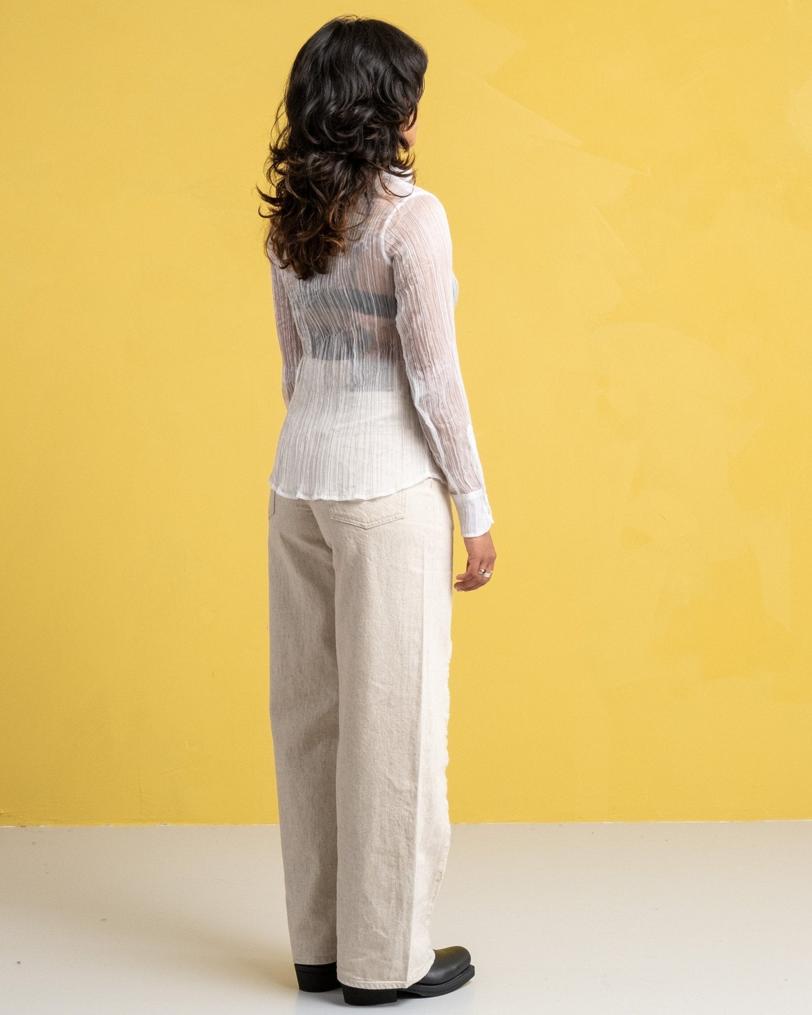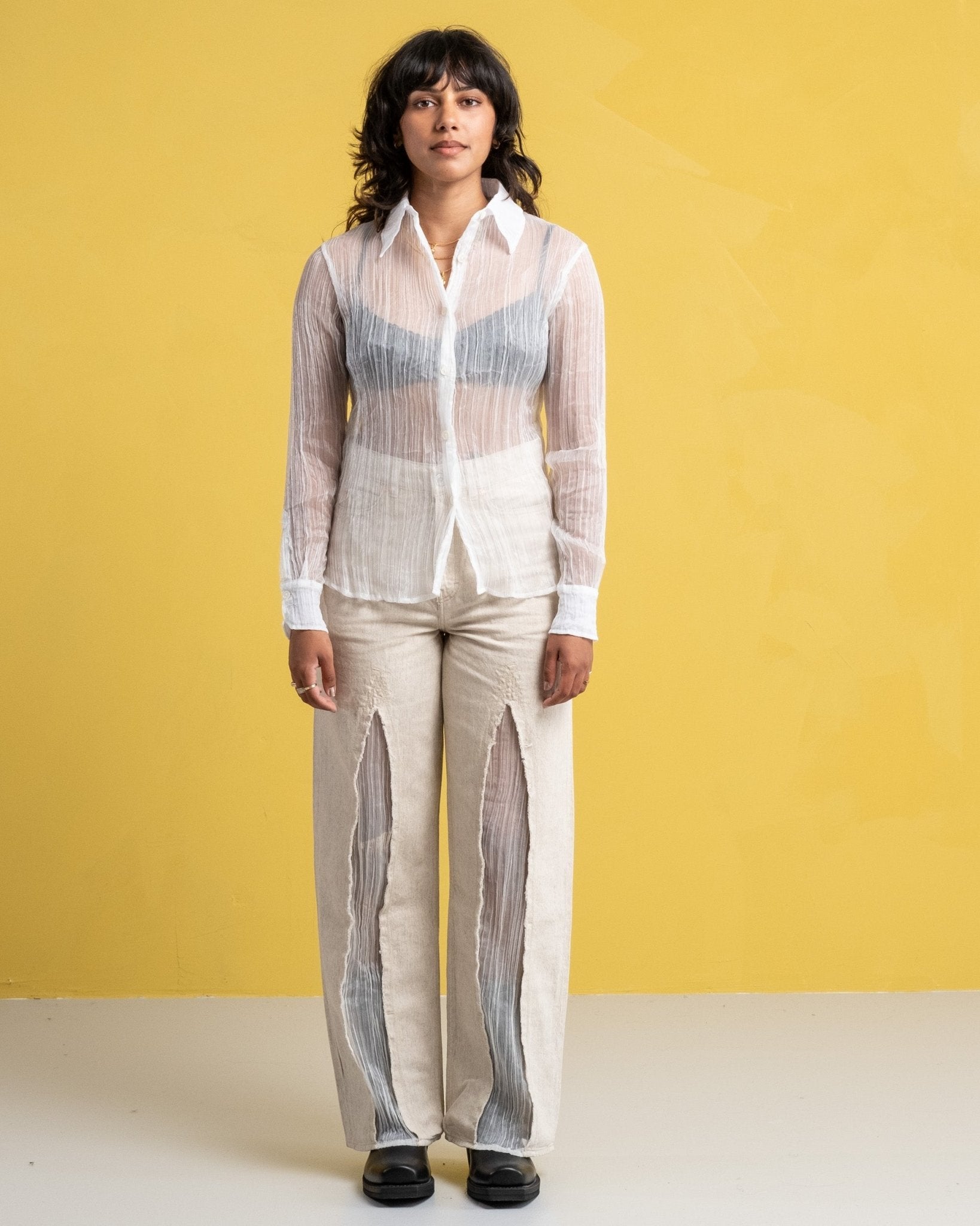 La camisa de línea de los 70s Milky Quartz Pleat de Our Legacy está cortada de una hermosa tela francesa transparente con textura plisada. Cuenta con el dobladillo curvado, botones de madreperla y un generoso cuello de los 70s.