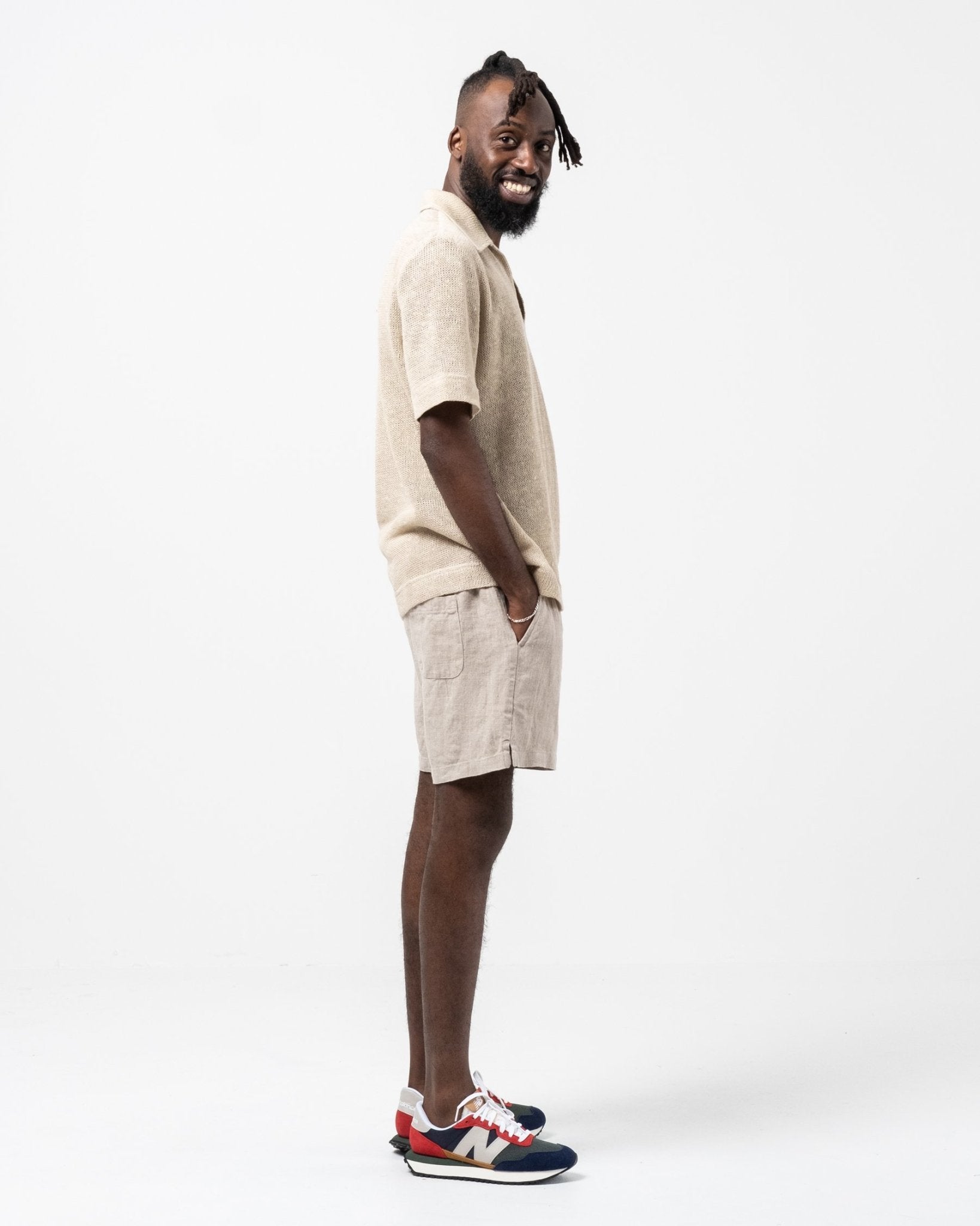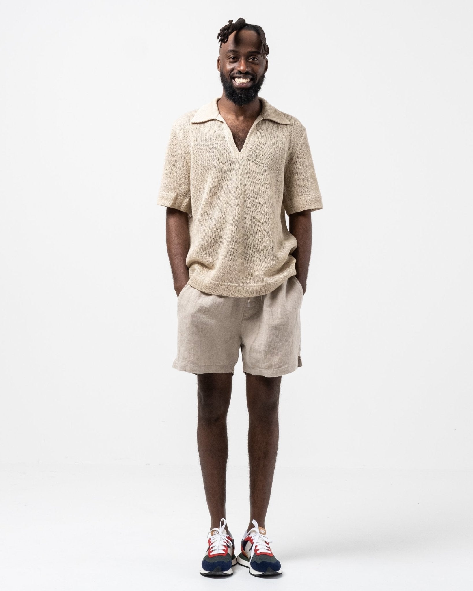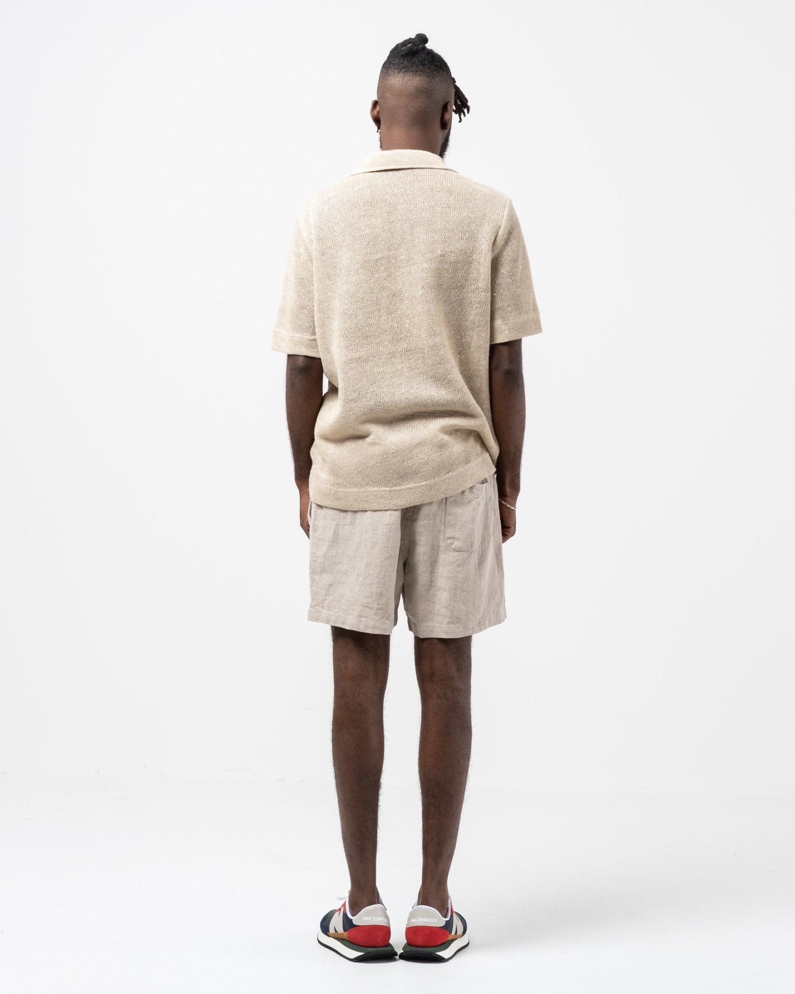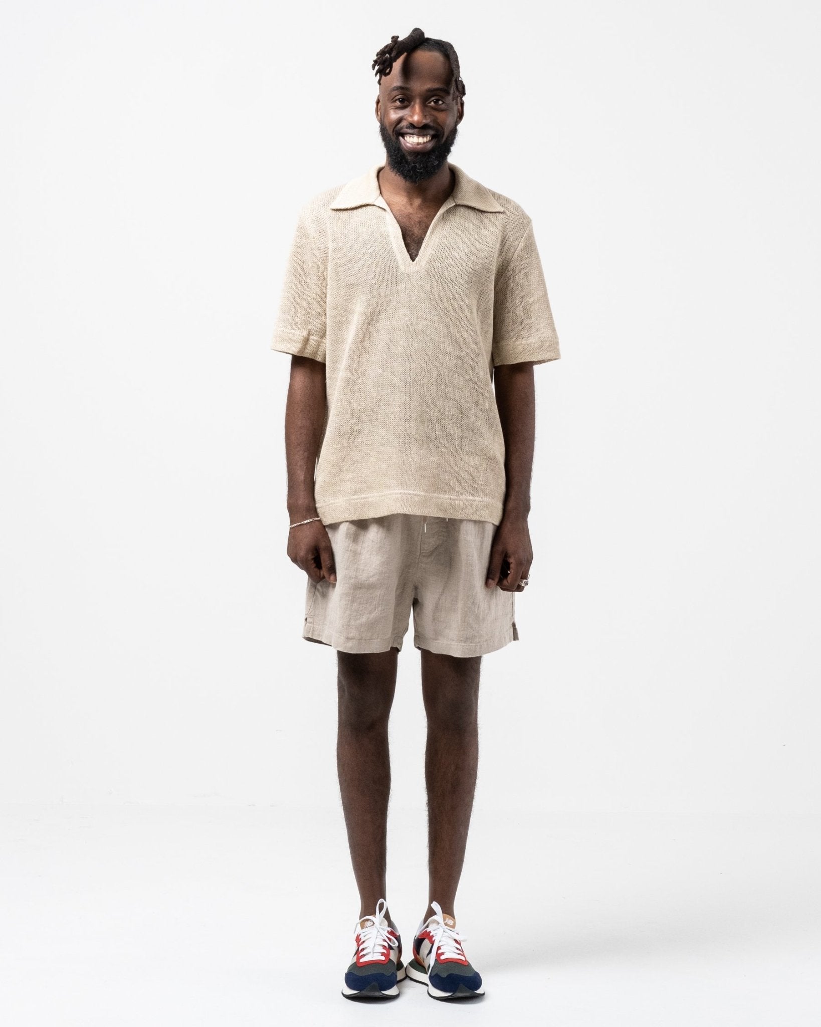Camisa Mate SS en color beige avena de Séfr. Camisa de manga corta con cuello amplio. Ajuste relajado con dobladillo recto. 100% lino. Hecha en Letonia.