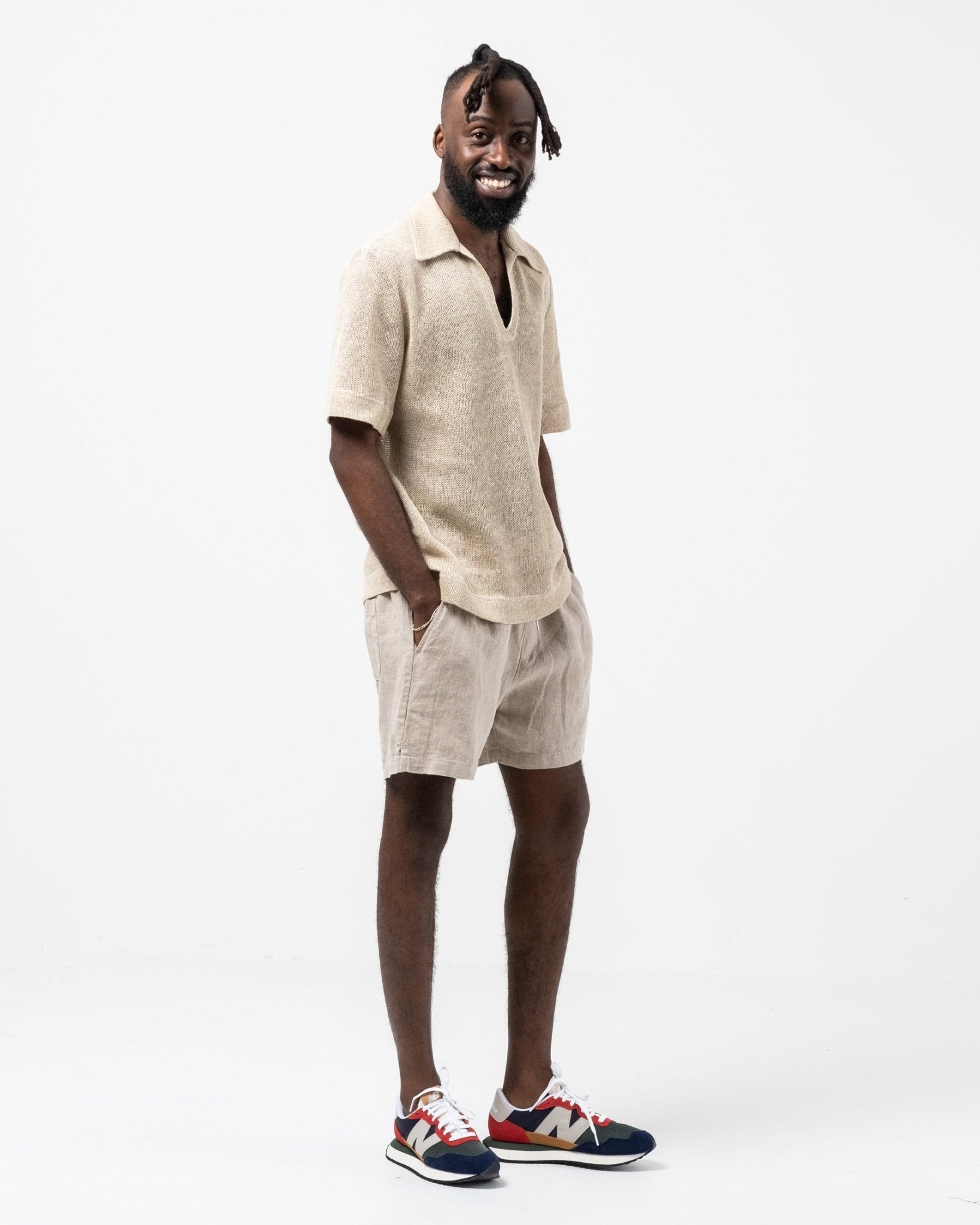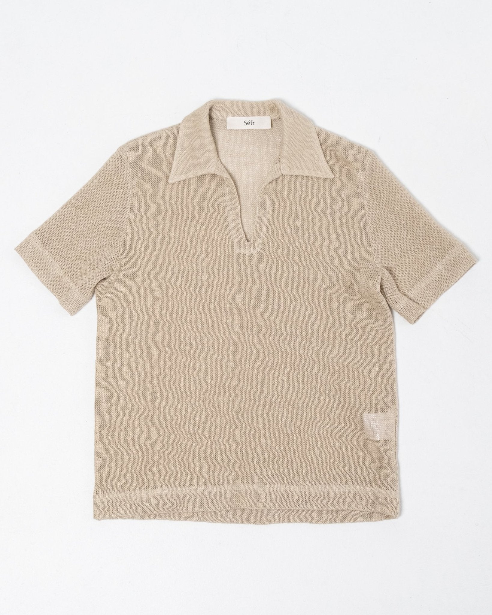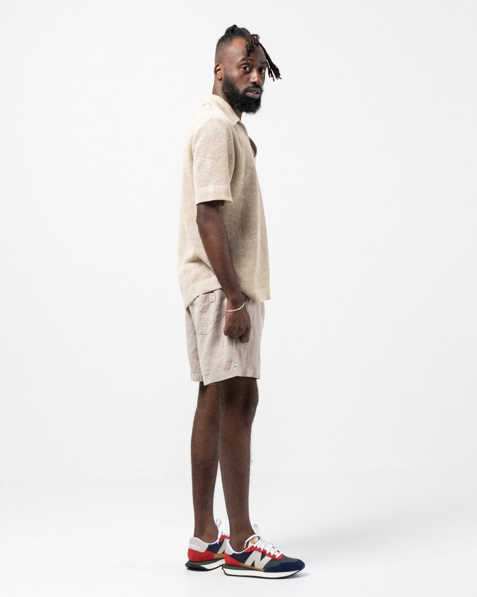 Camisa Mate SS en color beige avena de Séfr. Camisa de manga corta con cuello amplio. Ajuste relajado con dobladillo recto. 100% lino. Hecha en Letonia.