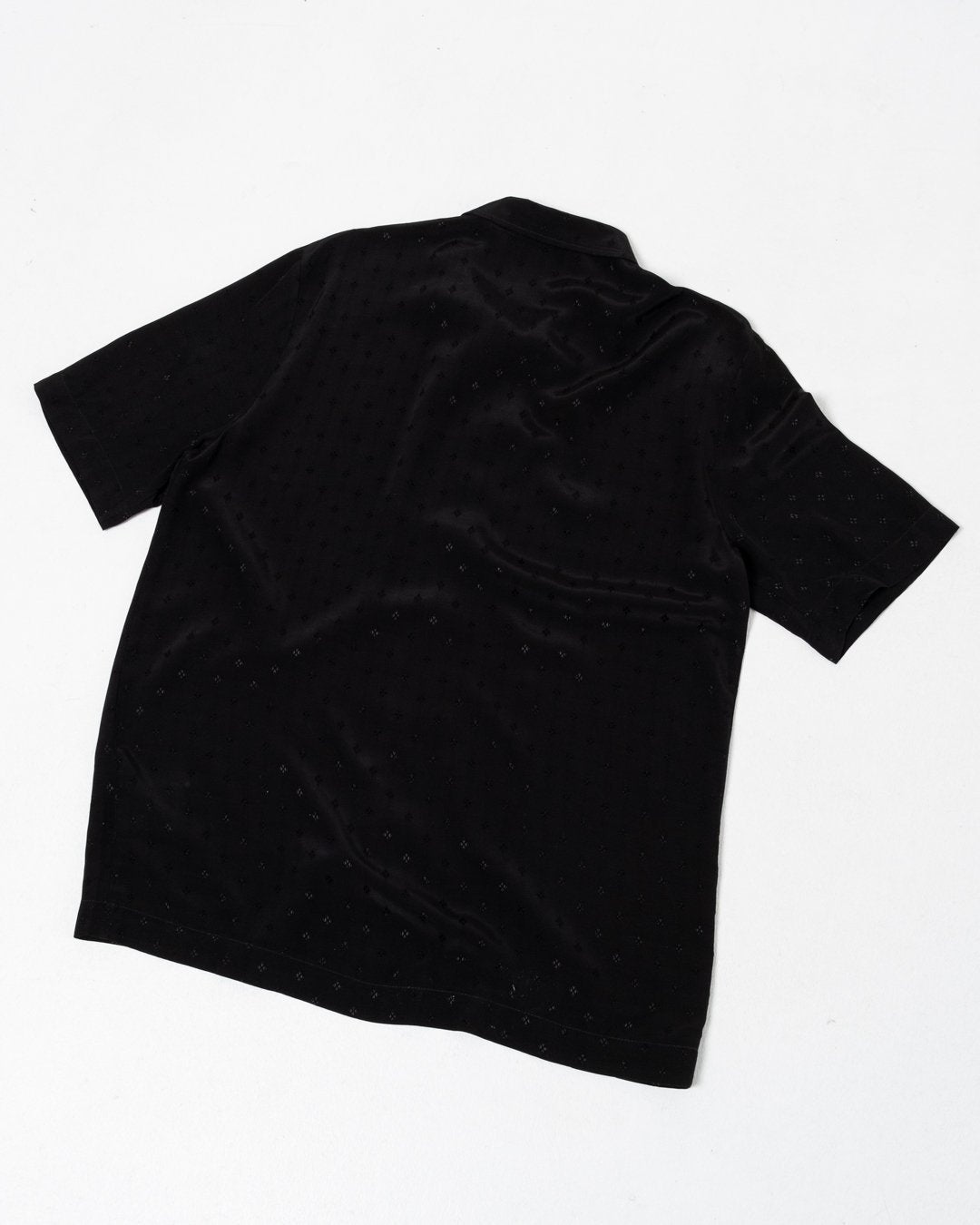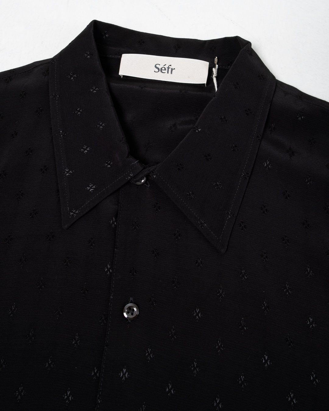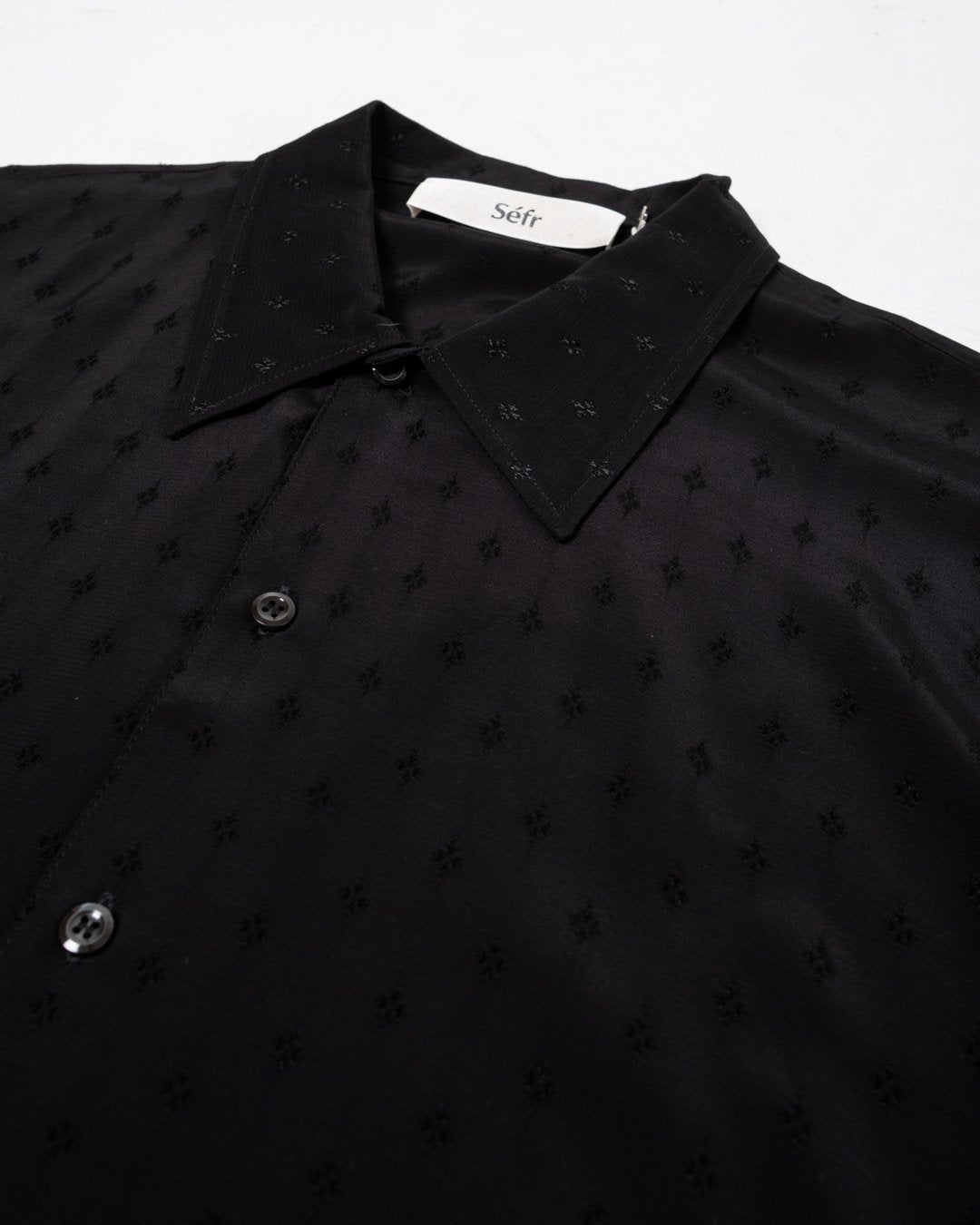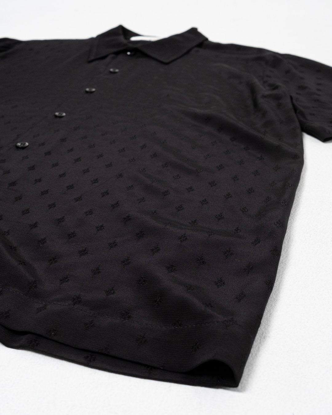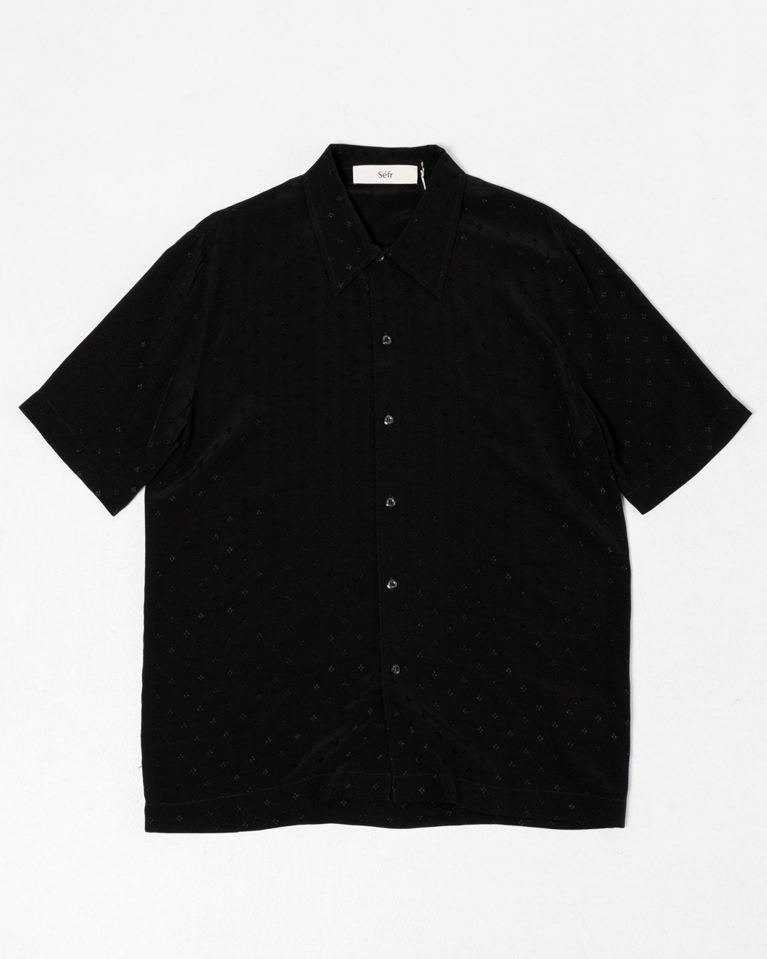 Camisa Suneham Estampado Negro de Séfr. Camisa de manga corta con un ajuste relajado y cuello ancho. Botones de madreperla de Italia, y la tela en 100% viscosa. Hecho en Letonia.