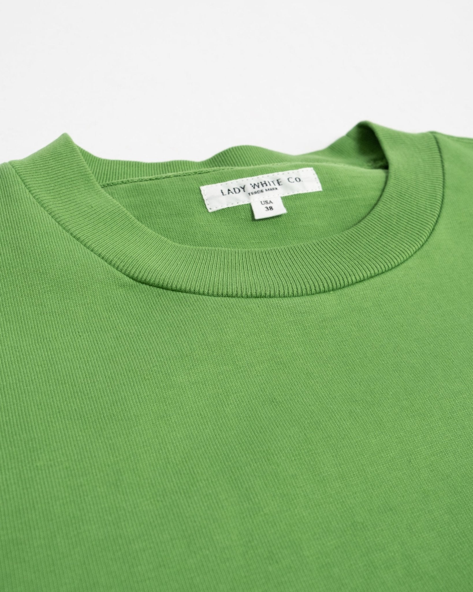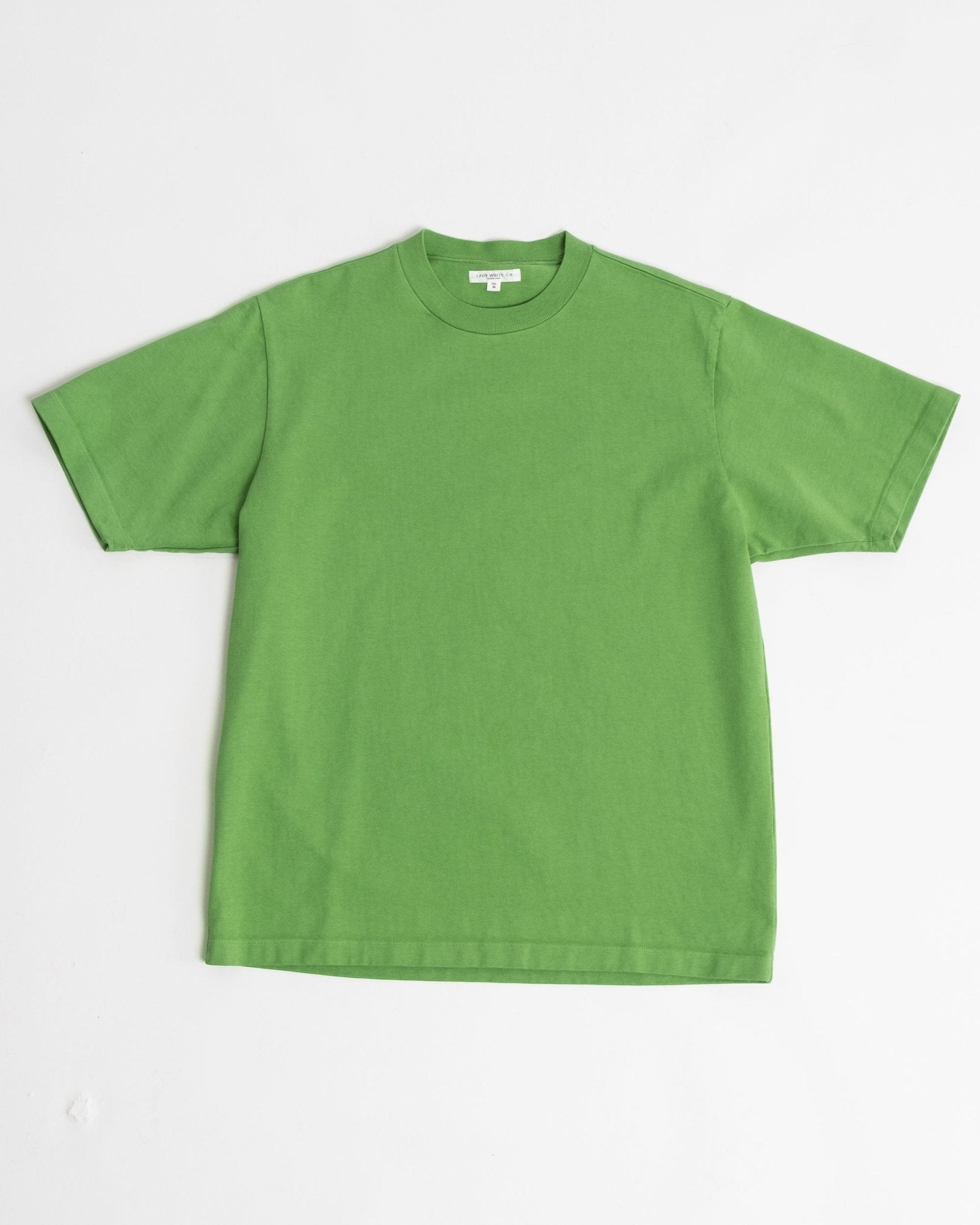 Camiseta de Rugby Verde Brillante de la marca de Los Ángeles Lady White Co. Una camiseta de ajuste cuadrado en una tela duradera y súper cómoda de 10 oz. Tejida, cortada, cosida y teñida en Los Ángeles. La trama está sanforizada, por lo que el encogimiento es casi nulo. Probablemente una de las mejores camisetas jamás hechas. Hecho en EE.UU.