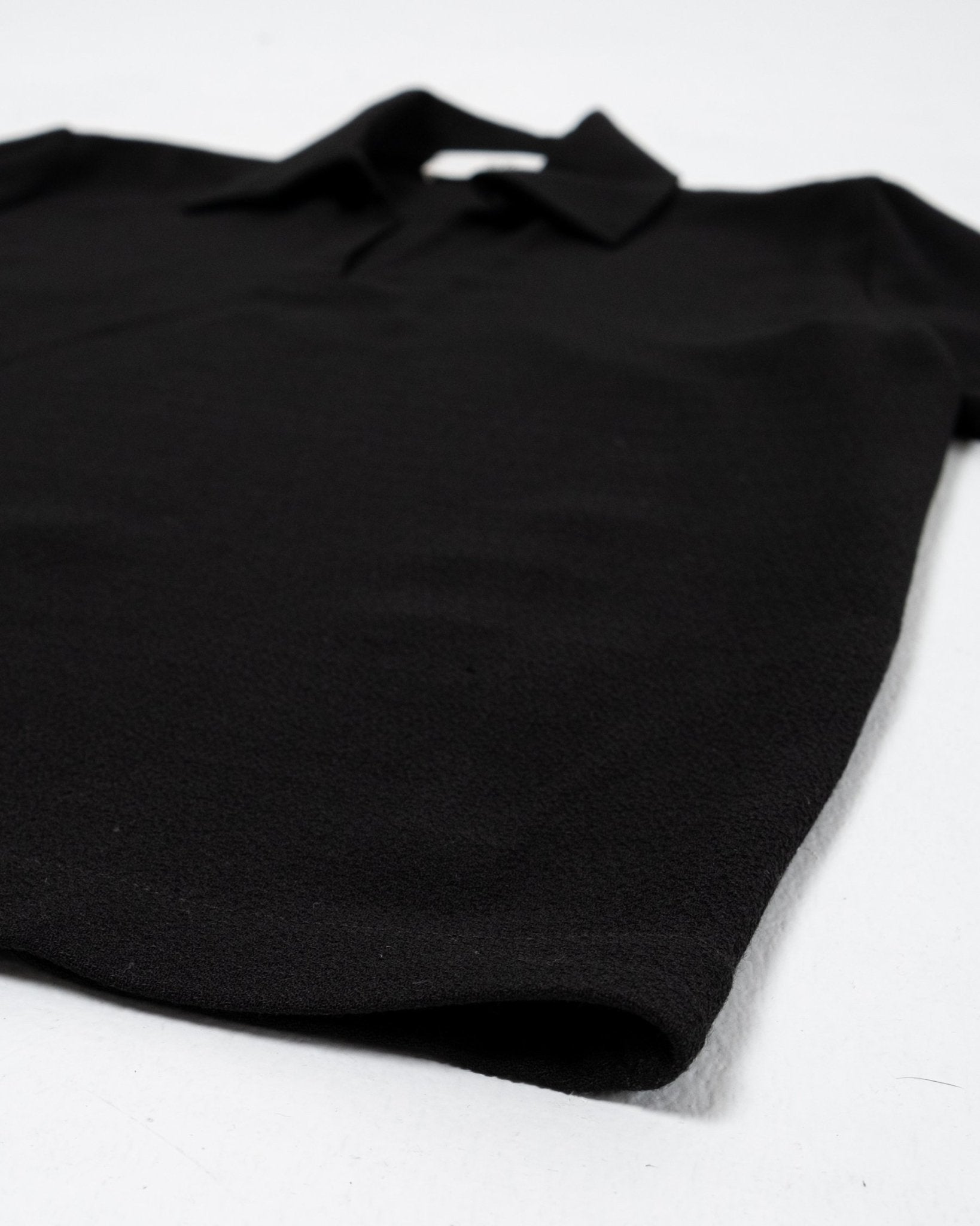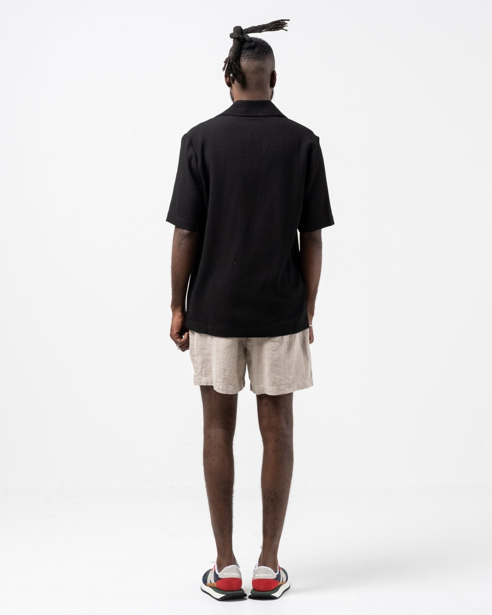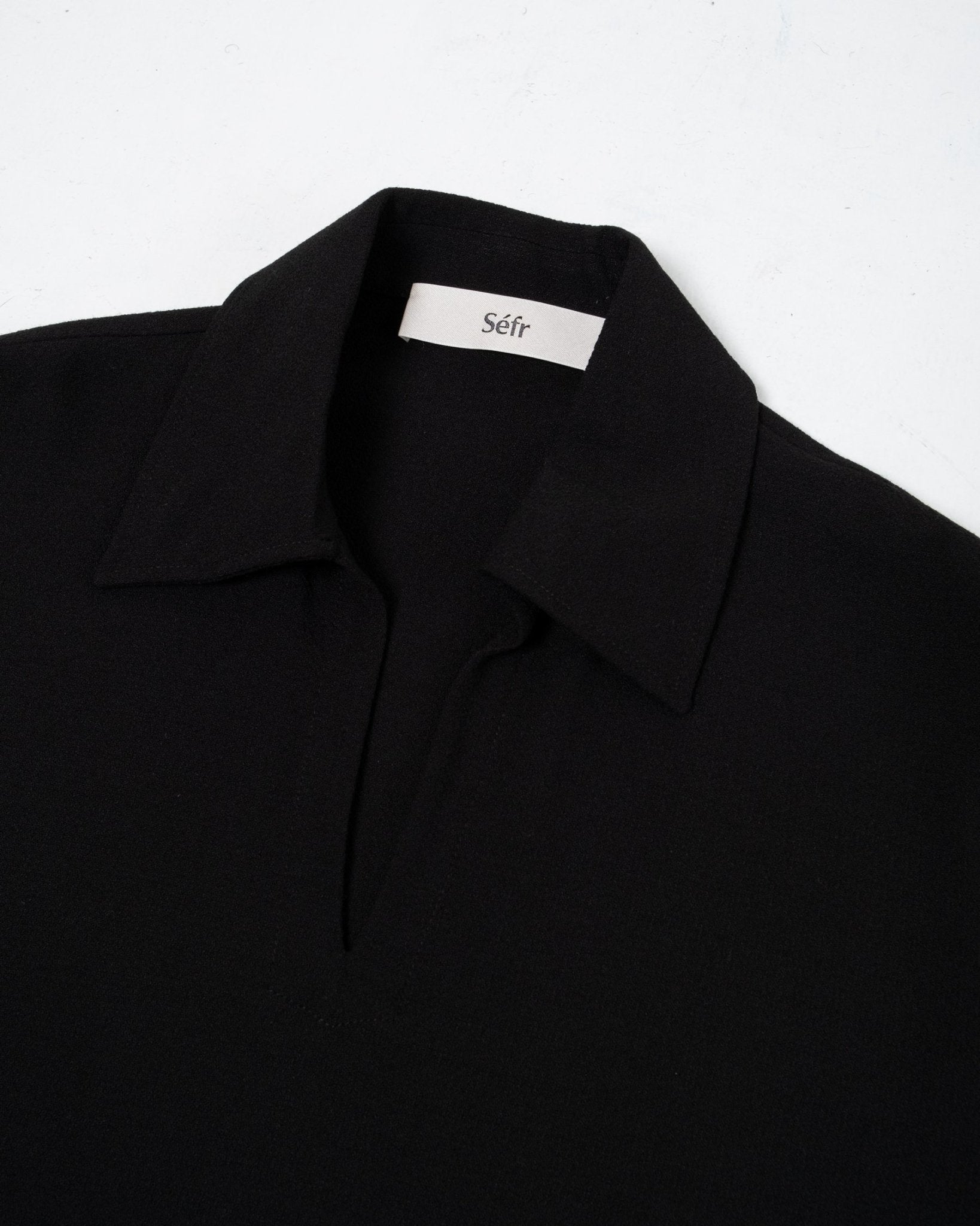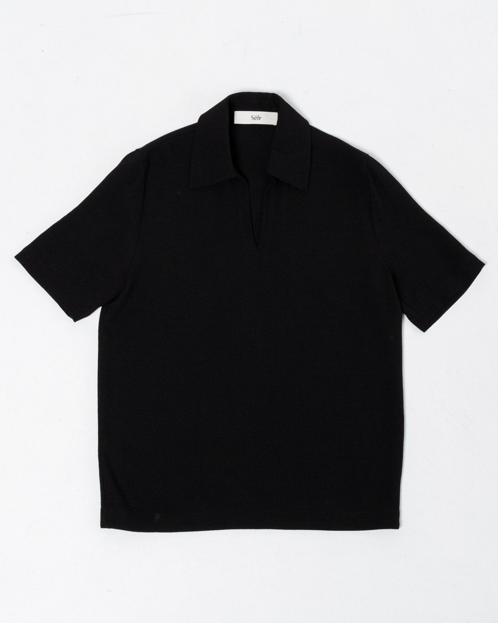 Camisa Mate SS Negra de Séfr. Camisa de manga corta con cuello ancho. Ajuste relajado con un dobladillo recto. 60% viscosa y 40% lana. Hecho en Letonia.