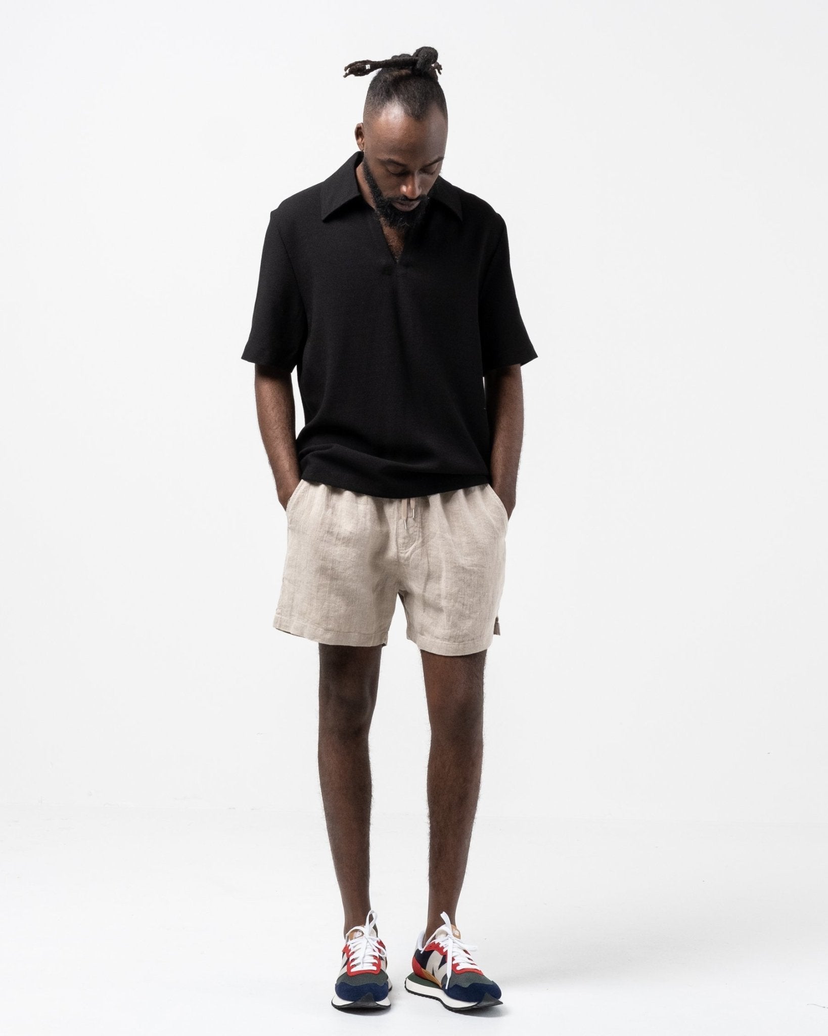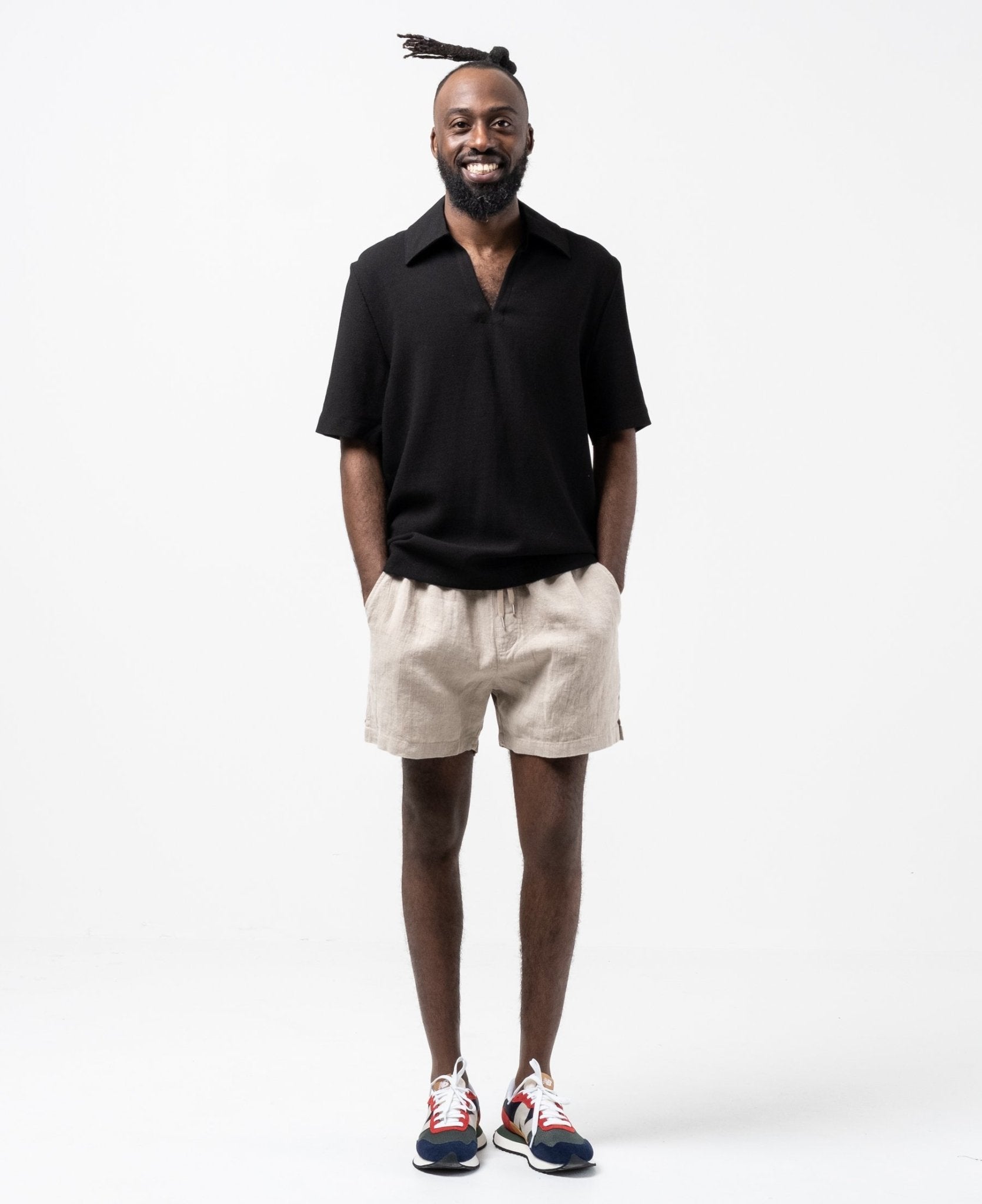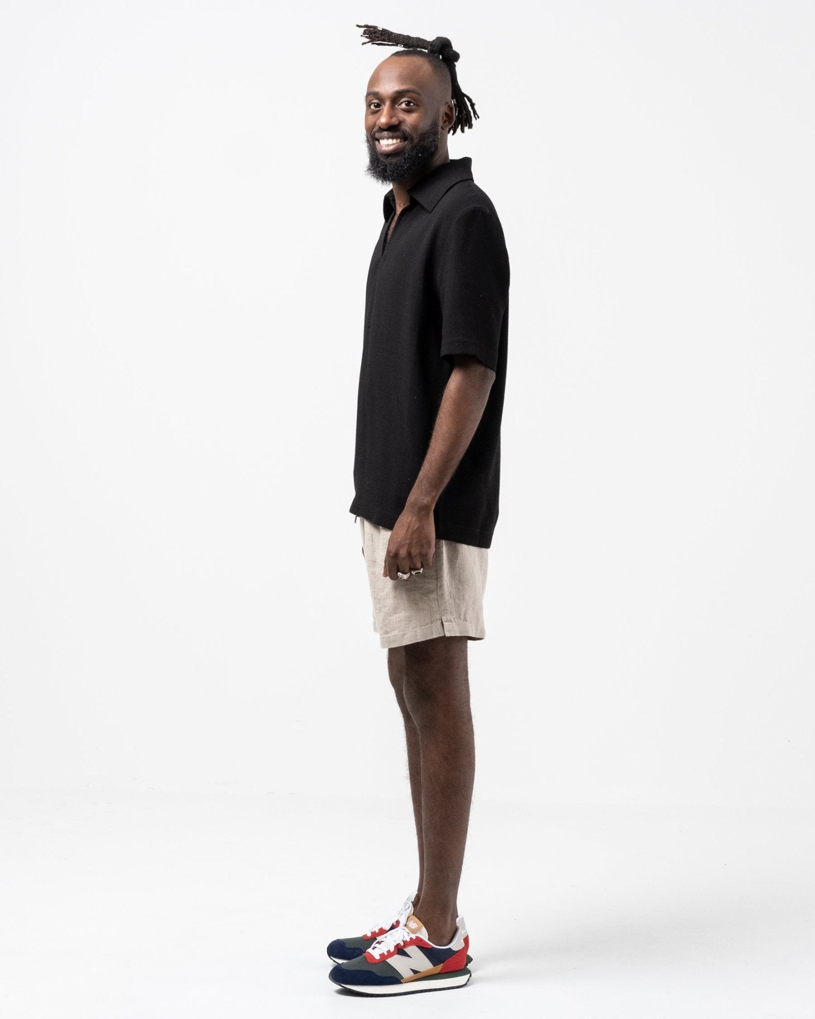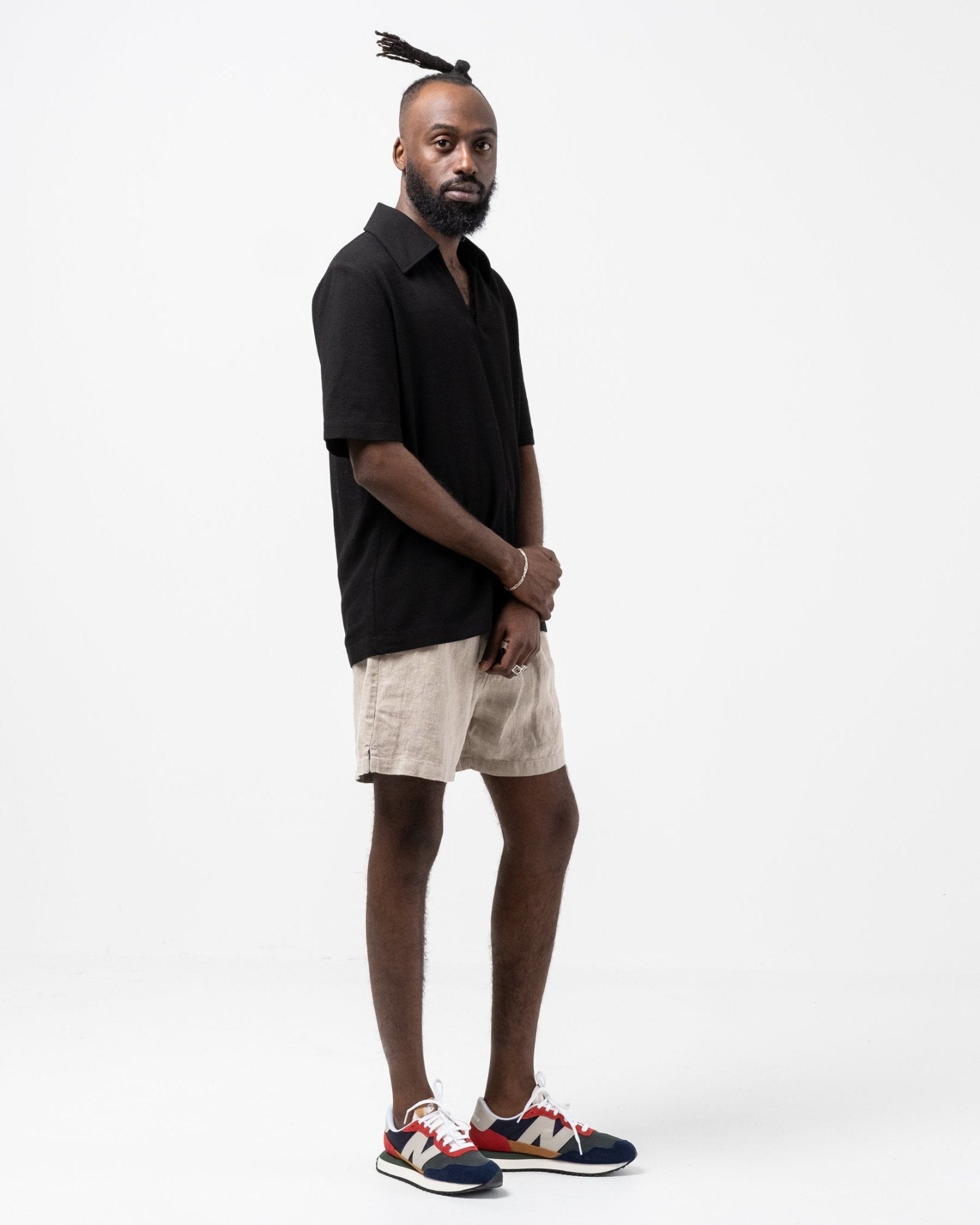 Camisa Mate SS Negra de Séfr. Camisa de manga corta con cuello ancho. Ajuste relajado con un dobladillo recto. 60% viscosa y 40% lana. Hecho en Letonia.