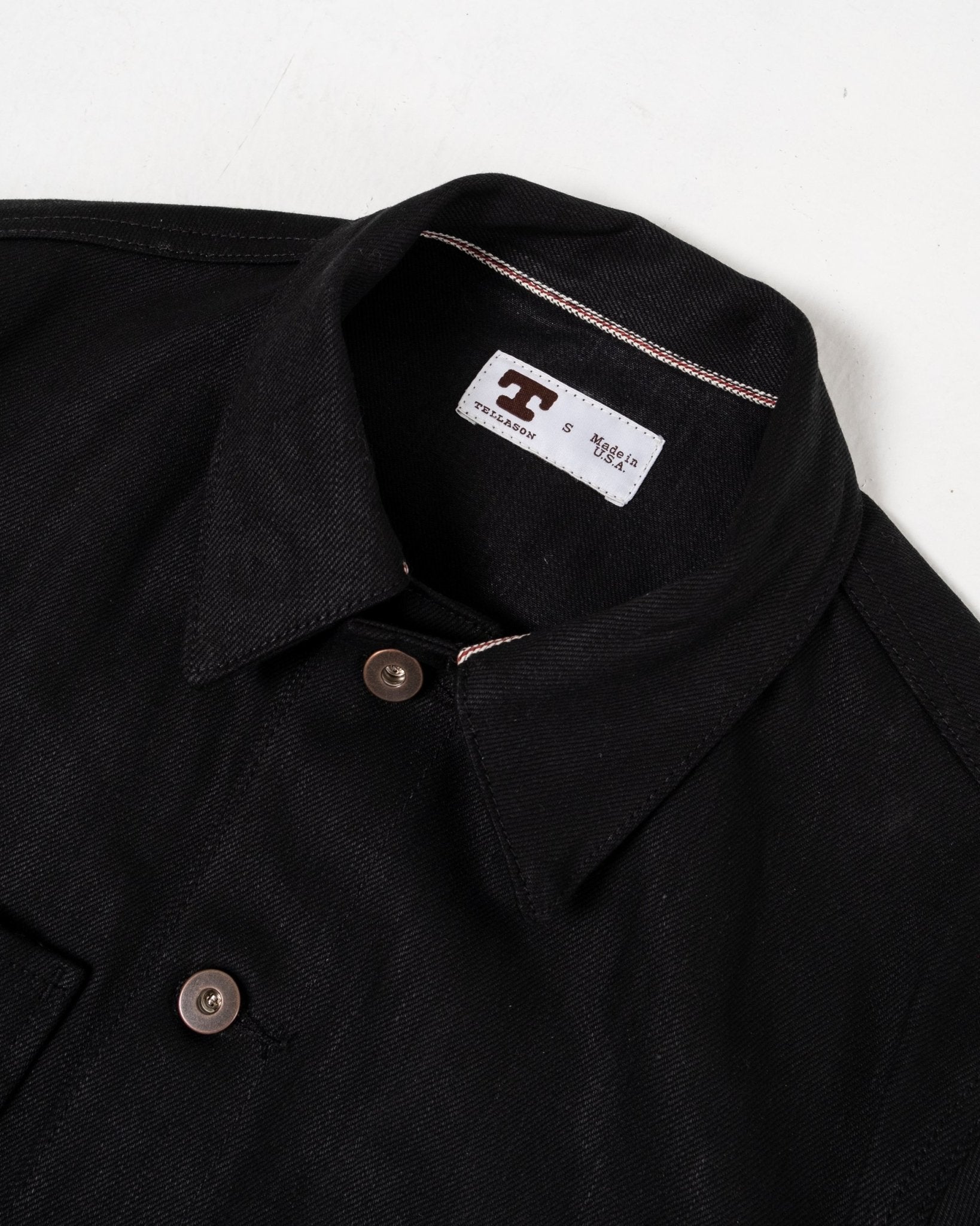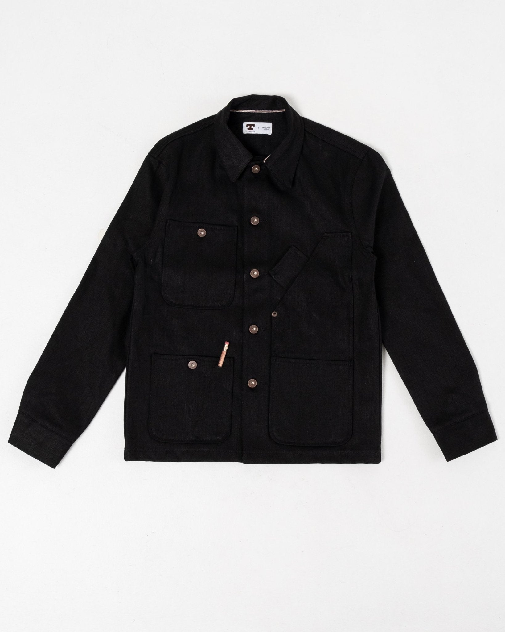Chaqueta Coverall de Tellason hecha de un buen denim de orillo japonés de 13.5 oz, cosida en San Francisco. Cuatro bolsillos exteriores grandes y un bolsillo para gafas en el frente junto con un bolsillo interior. Se adapta muy bien y se ve mejor cuanto más la usas. Botones metálicos en el frente y en los puños. Hecho en EE. UU.