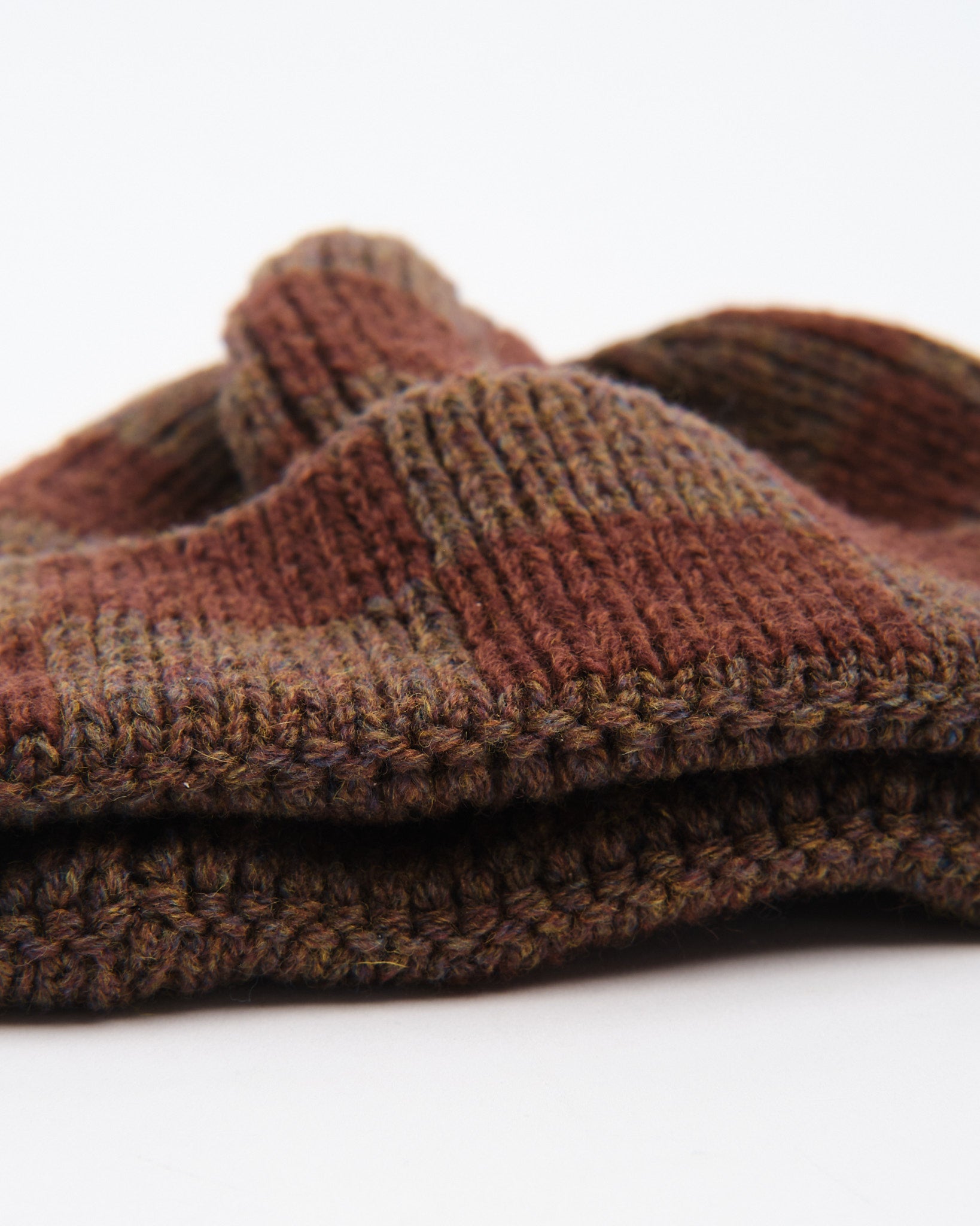 The Checker Beanie in Brown from Found Feather brings earthy tones and elevated texture to your winter rotation. Made in Japan using soft, washable Italian Donegal wool, it features a jacquard knit construction that gives it both visual depth and comfortable structure. A stretch yarn blend ensures a secure unisex fit, while the regular 7 cm brim and clean one-panel design keep the shape classic. Subtle, warm, and designed to last — this is a heritage-inspired beanie with modern ease.