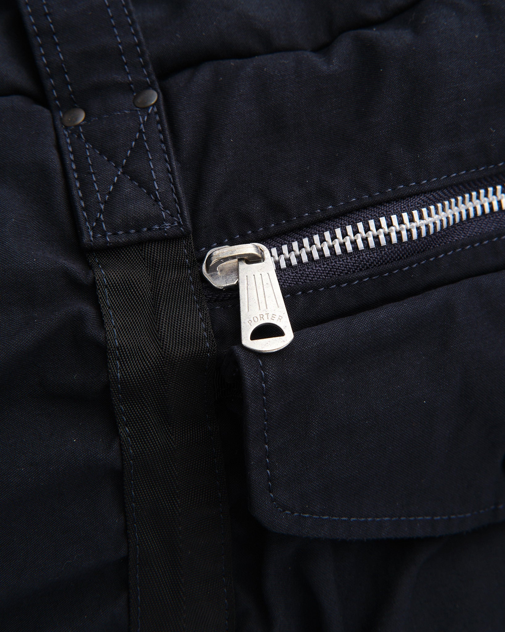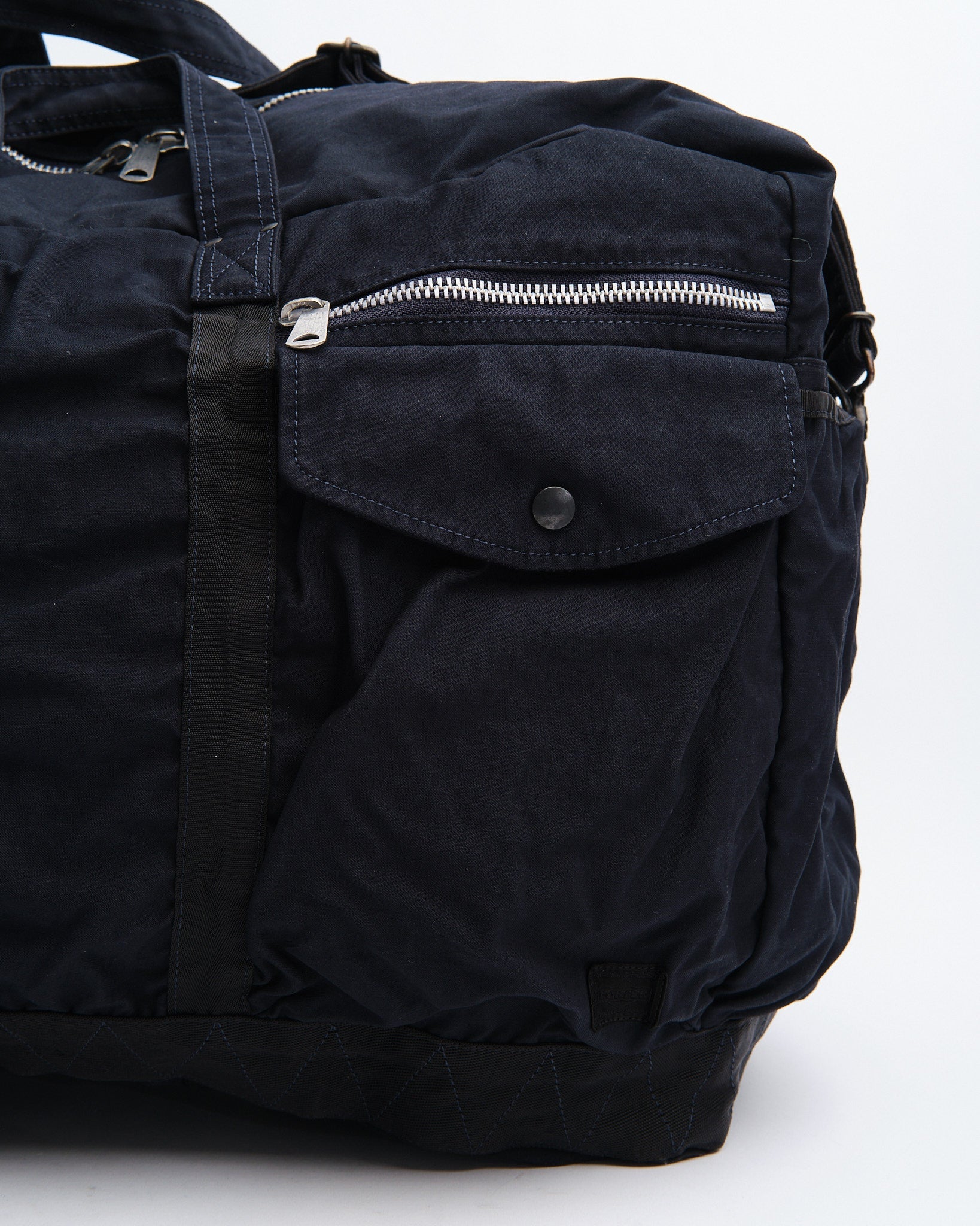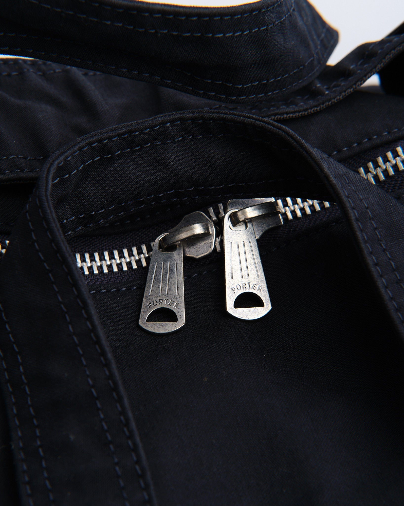 El Bolso Boston 2-Way PORTER BY YOSHIDA Crag (L) en Azul Marino es parte de la serie PORTER CRAG, conocida por su proceso de teñido de productos que resulta en colores profundos, ricos y una textura distintiva. El bolso está hecho de tela de satén de espalda, una mezcla de alta densidad de nylon y algodón, que proporciona tanto durabilidad como una textura suave y firme. La técnica de teñido en dos baños realza la profundidad del color y crea variaciones sutiles en cada bolso, asegurando que cada pieza sea única.