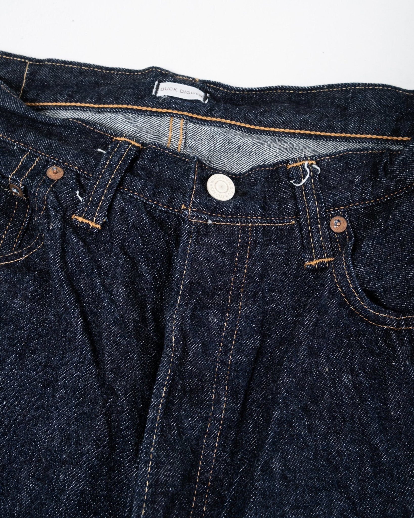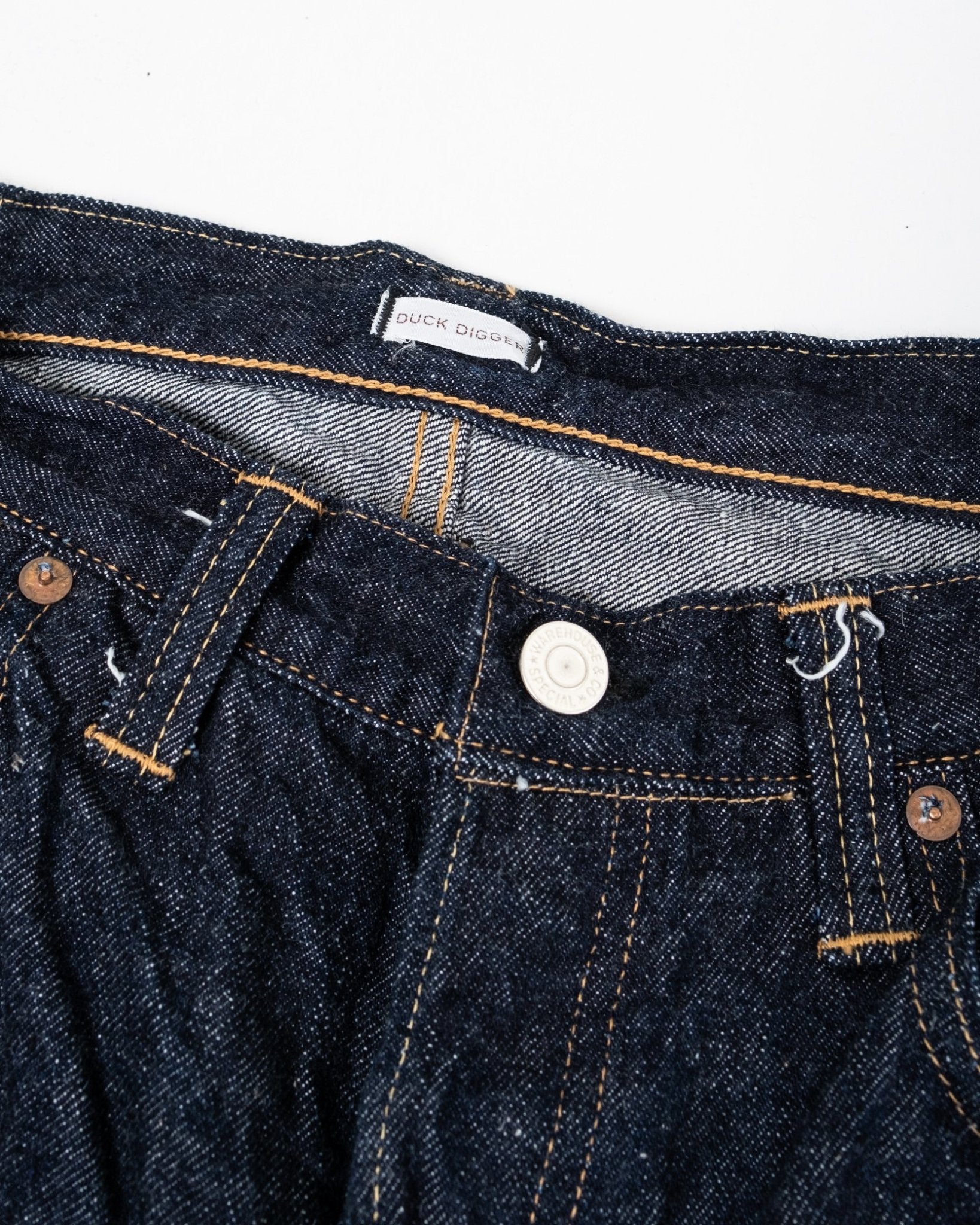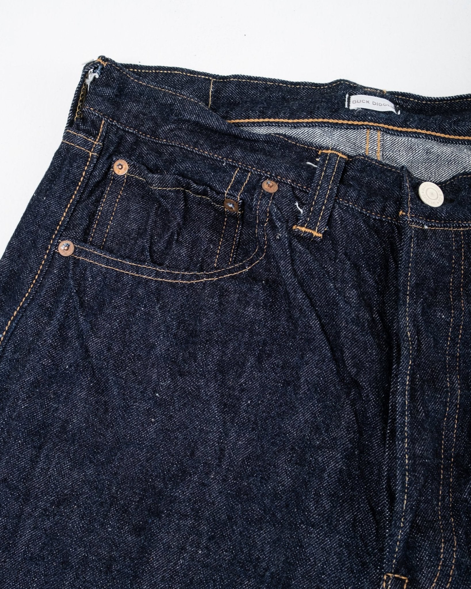Duck Digger 1001XX One Wash de Warehouse & Co. Este jean es un corte de 1947, con una subida profunda y un estrechamiento suave. Warehouse los cose en su denim Banner de 13.5 oz. Este par de ajuste recto se basa en un modelo de los años 1947 en una mezcla de algodón de Arizona, Tennessee y Texas, recreando la característica de hilo desigual natural de la época. Denim no sanforizado que ha sido lavado una vez para un bonito aspecto vintage, además de que te libera de todos los problemas de encogimiento. Hecho en Japón.