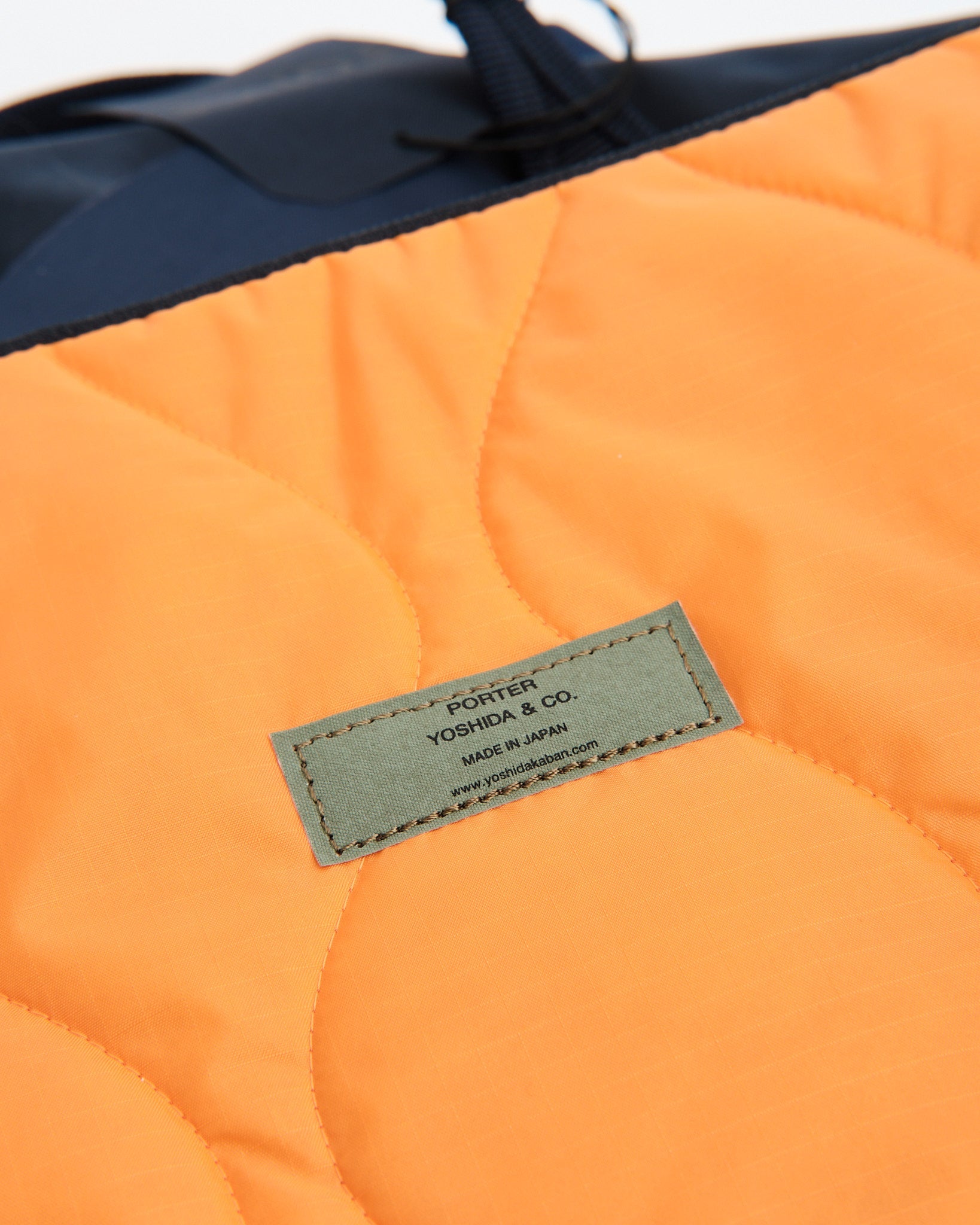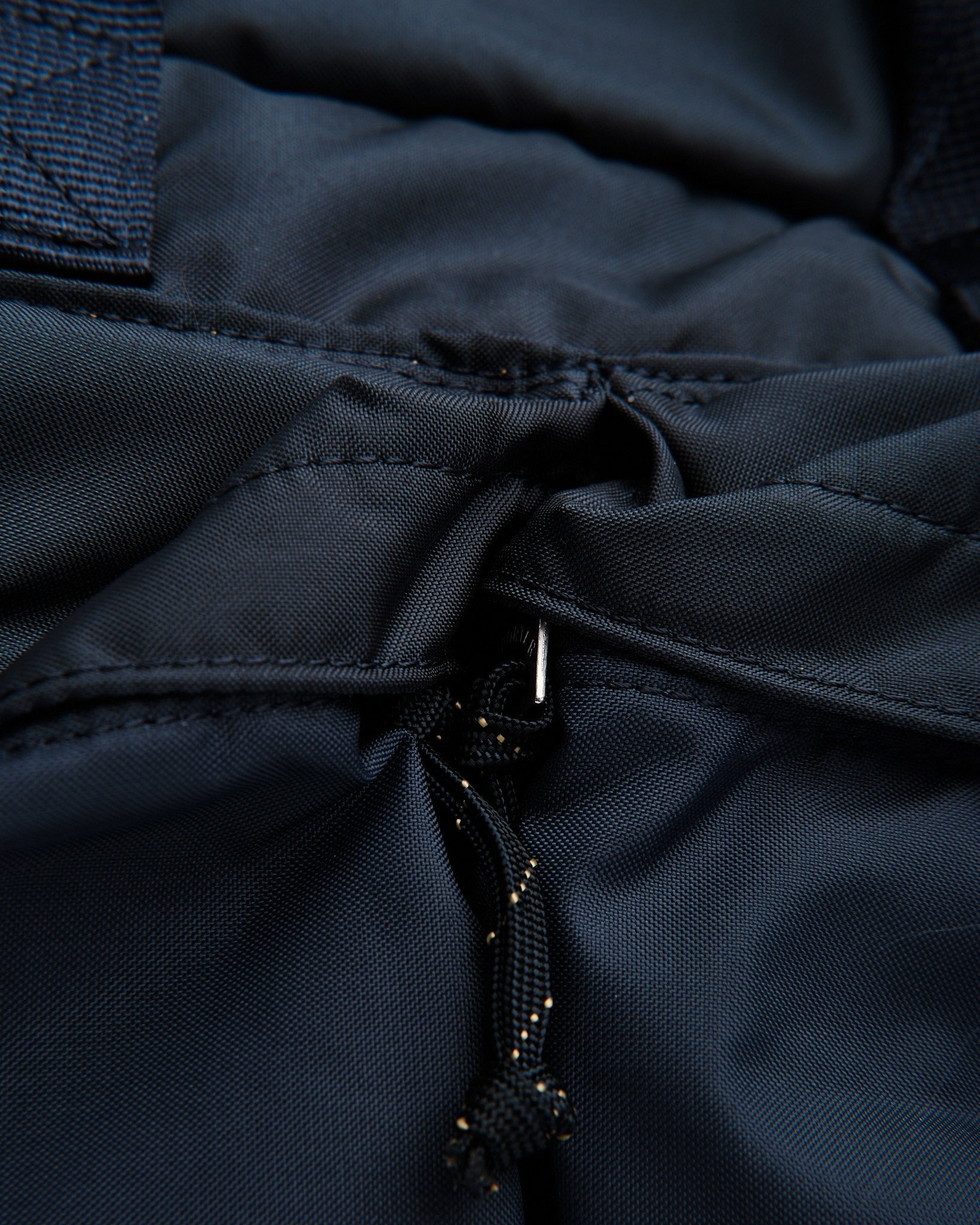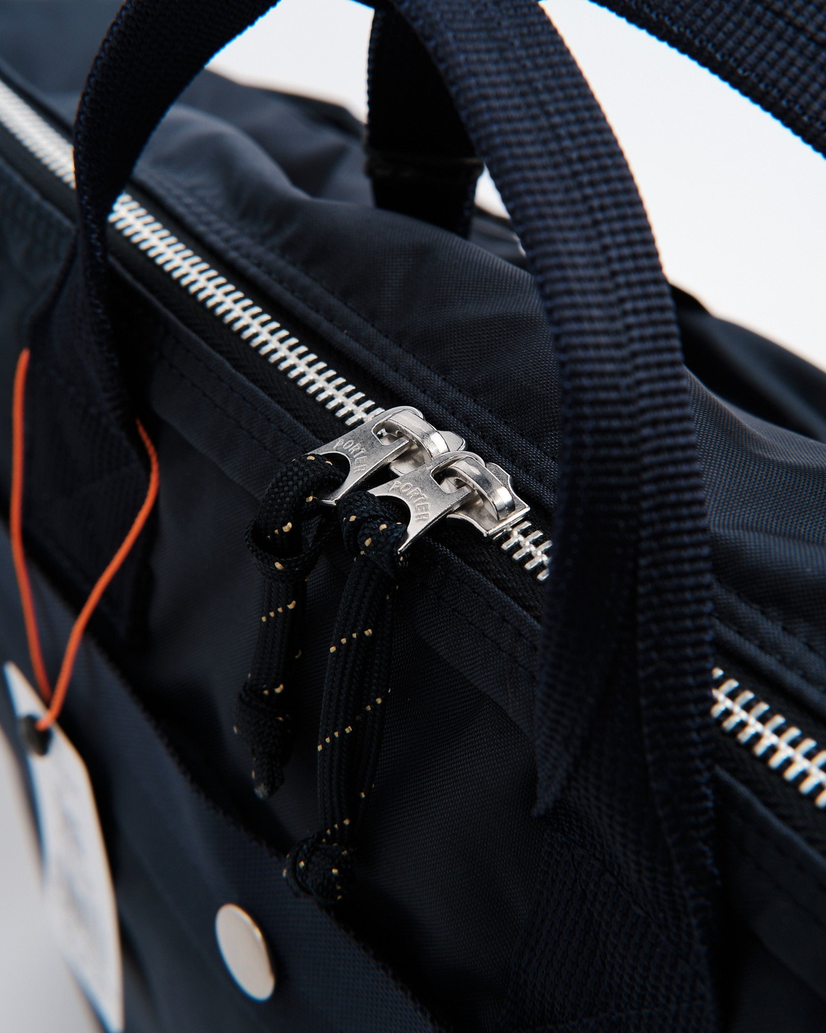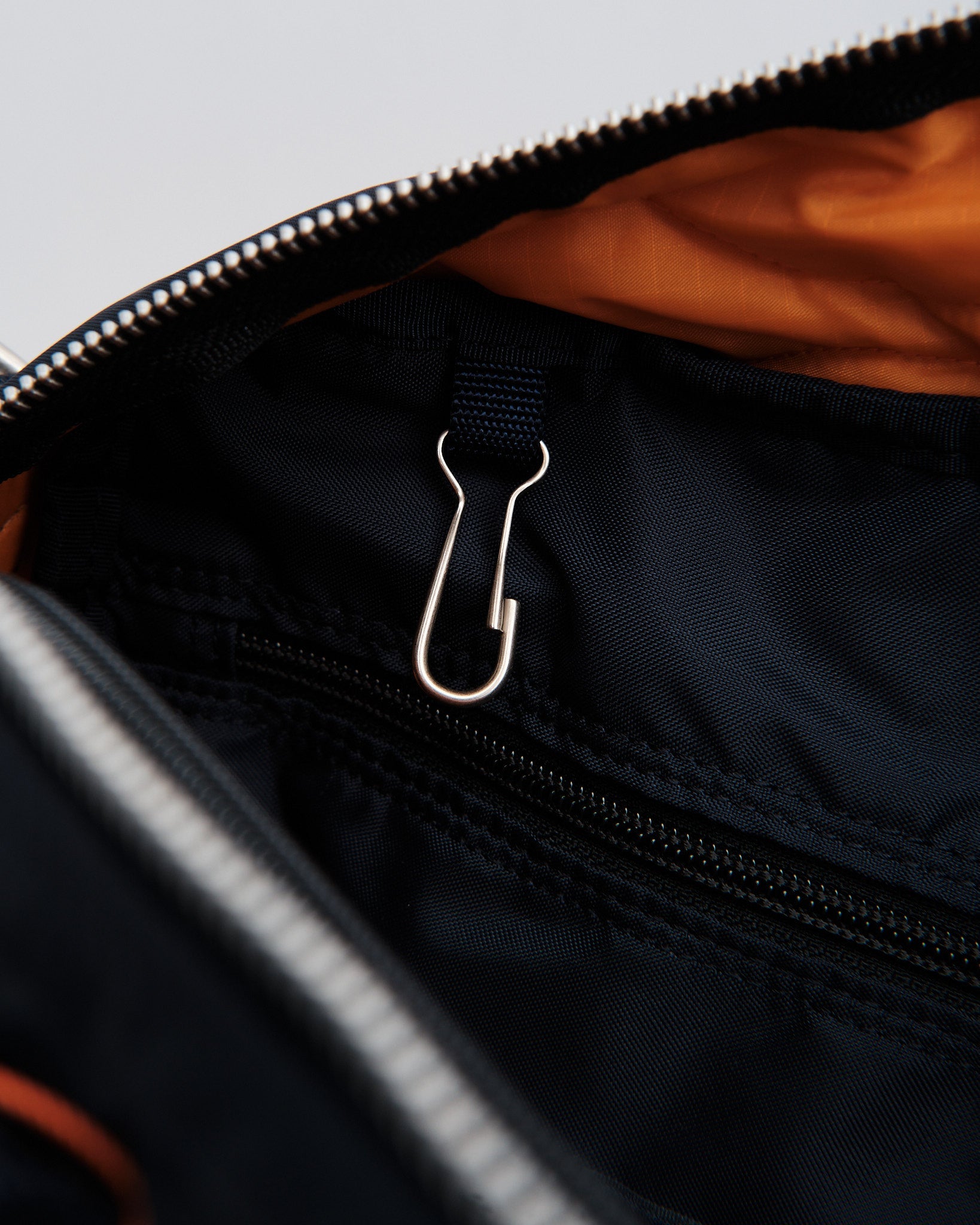 Fabricado con tela de grado industrial tejida con hilo fuerte de nylon 210 denier 6, originalmente utilizado para botes de goma, la bolsa es excepcionalmente duradera. El interior presume de un forro color naranja de emergencia, inspirado en los forros de chaquetas militares, y cuenta con nylon acolchado ripstop para una mayor resiliencia.