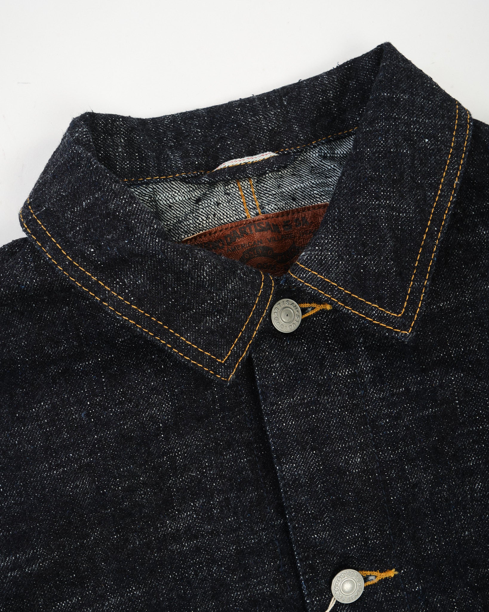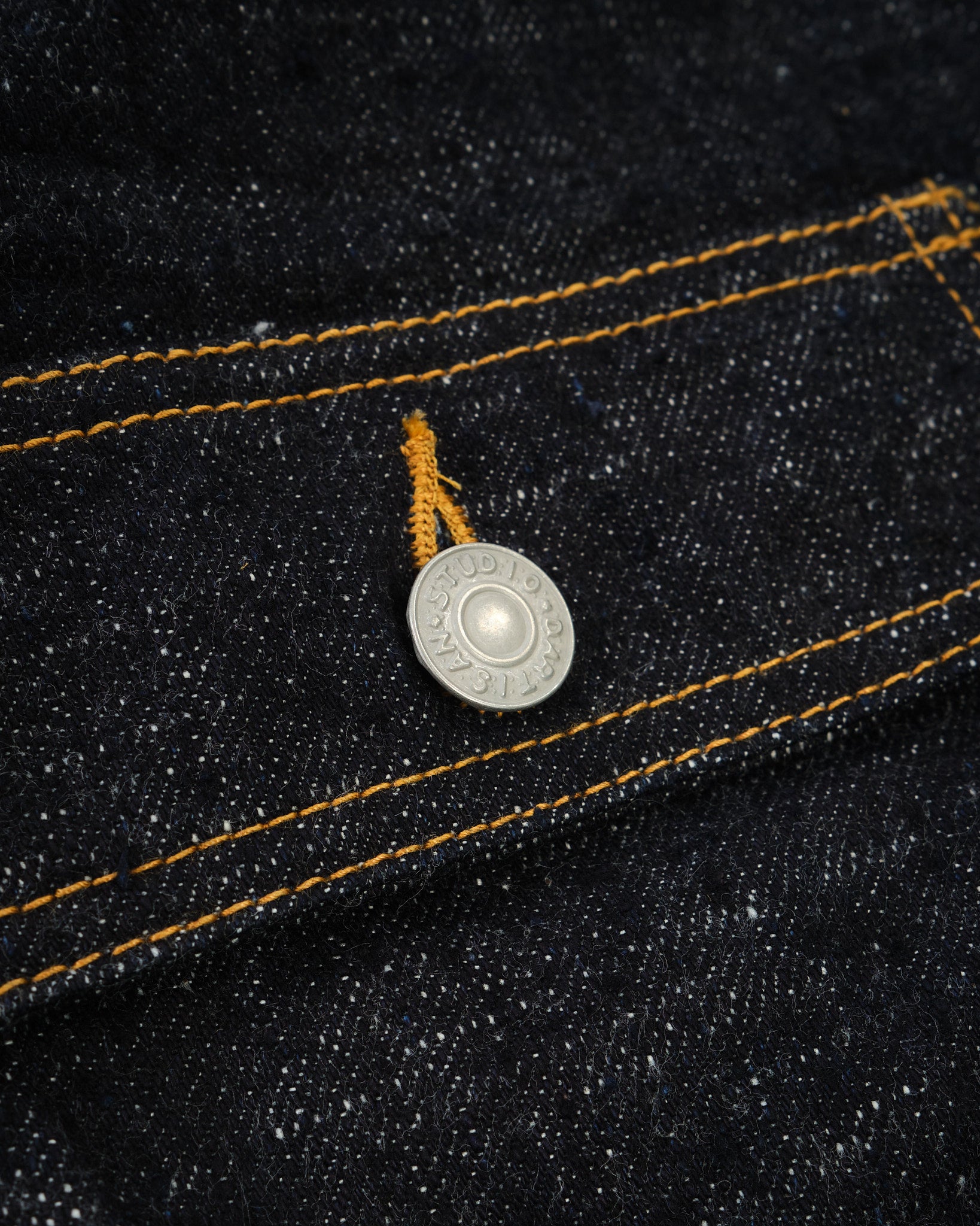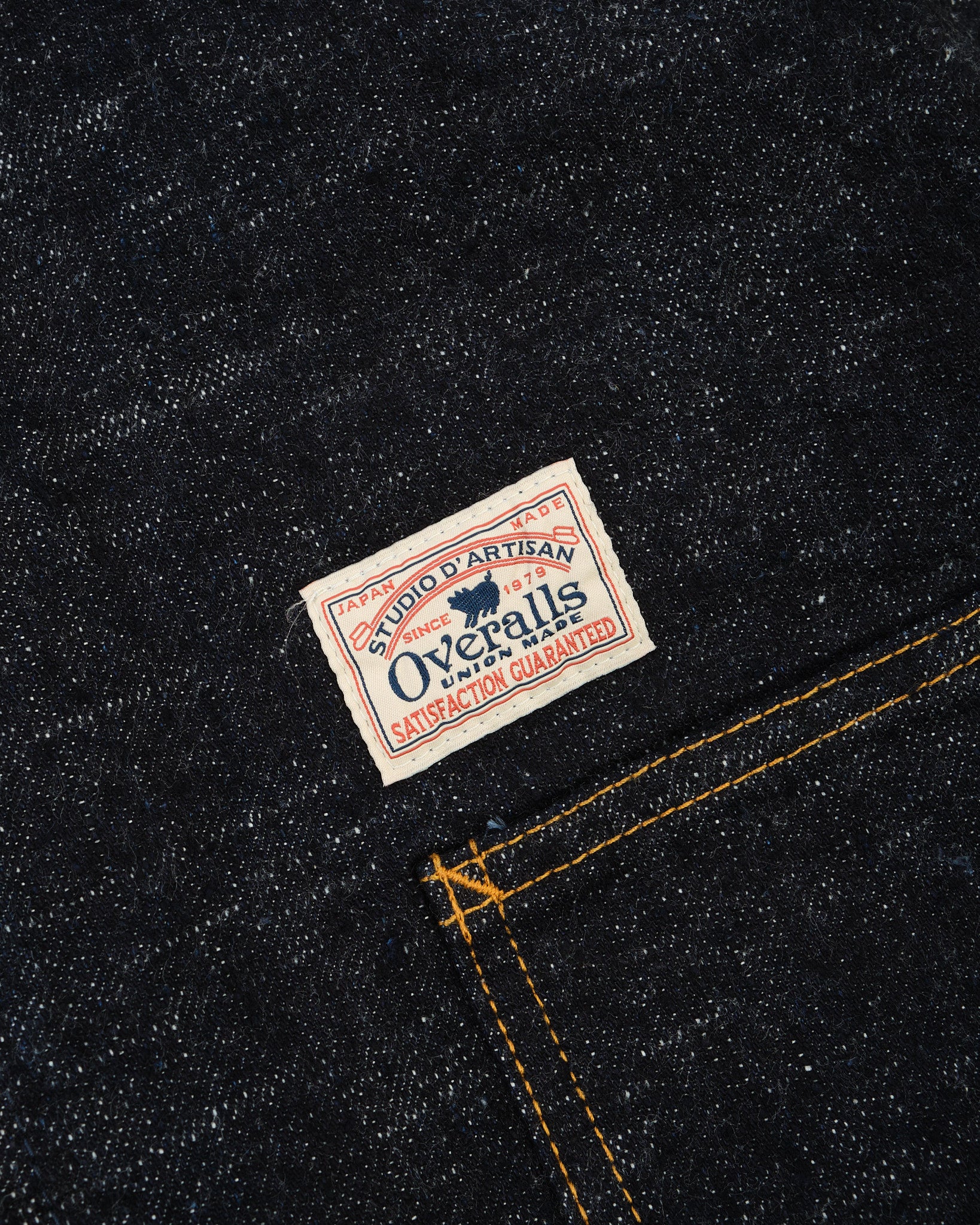 El STUDIO D'ARTISAN GL3 Denim Coverall (D4620) ejemplifica la dedicación de la marca a la artesanía tradicional y al desarrollo innovador de tejidos. Esta chaqueta tipo mono está meticulosamente confeccionada con denim GL3, un tejido exclusivo de 15oz producido en el histórico telar de lanzadera Toyoda G3, uno de los primeros telares mecánicos de Japón. Este telar confiere una textura desigual distintiva al tejido, recordando la ropa de trabajo vintage.