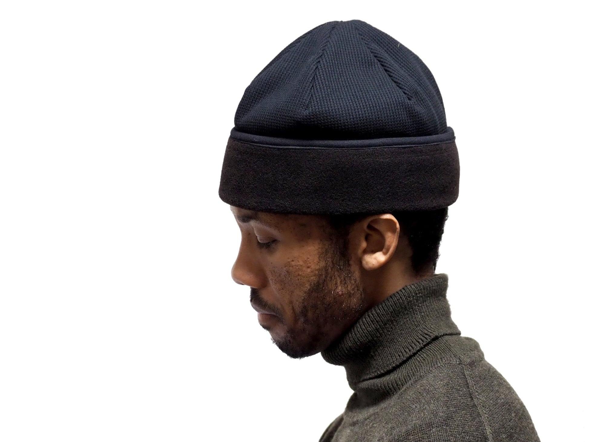 Gorro 2 Tonos Waffle Negro de Found Feather. Este gorro combina un exterior de tejido waffle 100% algodón con un forro de vellón polar suave para mantenerte cálido durante todo el otoño/invierno. Costuras en contraste en el ribete. Hecho en Japón.