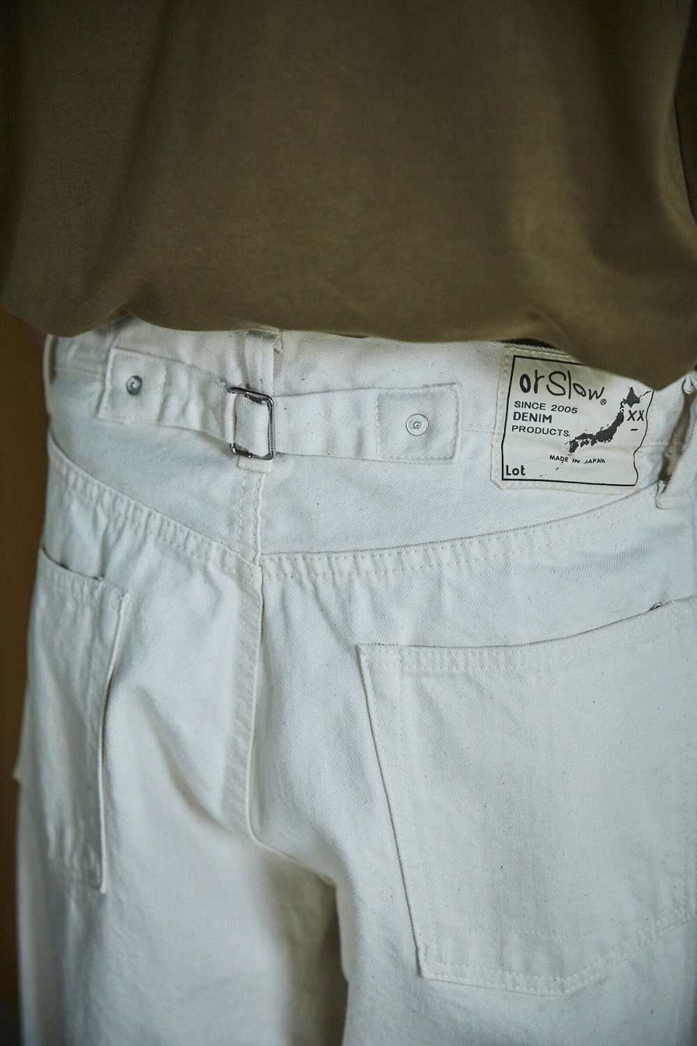 Elaborado en Japón con el denim de algodón original de orSlow en un tono crudo natural ecru, la tela lleva textura y carácter sin el uso de químicos agresivos. El acabado de un lavado le da un toque suave y desgastado desde el primer día. Los detalles de herencia incluyen una cintura con ajuste trasero (sin aguja), botones metálicos grabados, remaches traseros ocultos, y un bolsillo para monedas con orillo—cada uno un signo de autenticidad discreta.