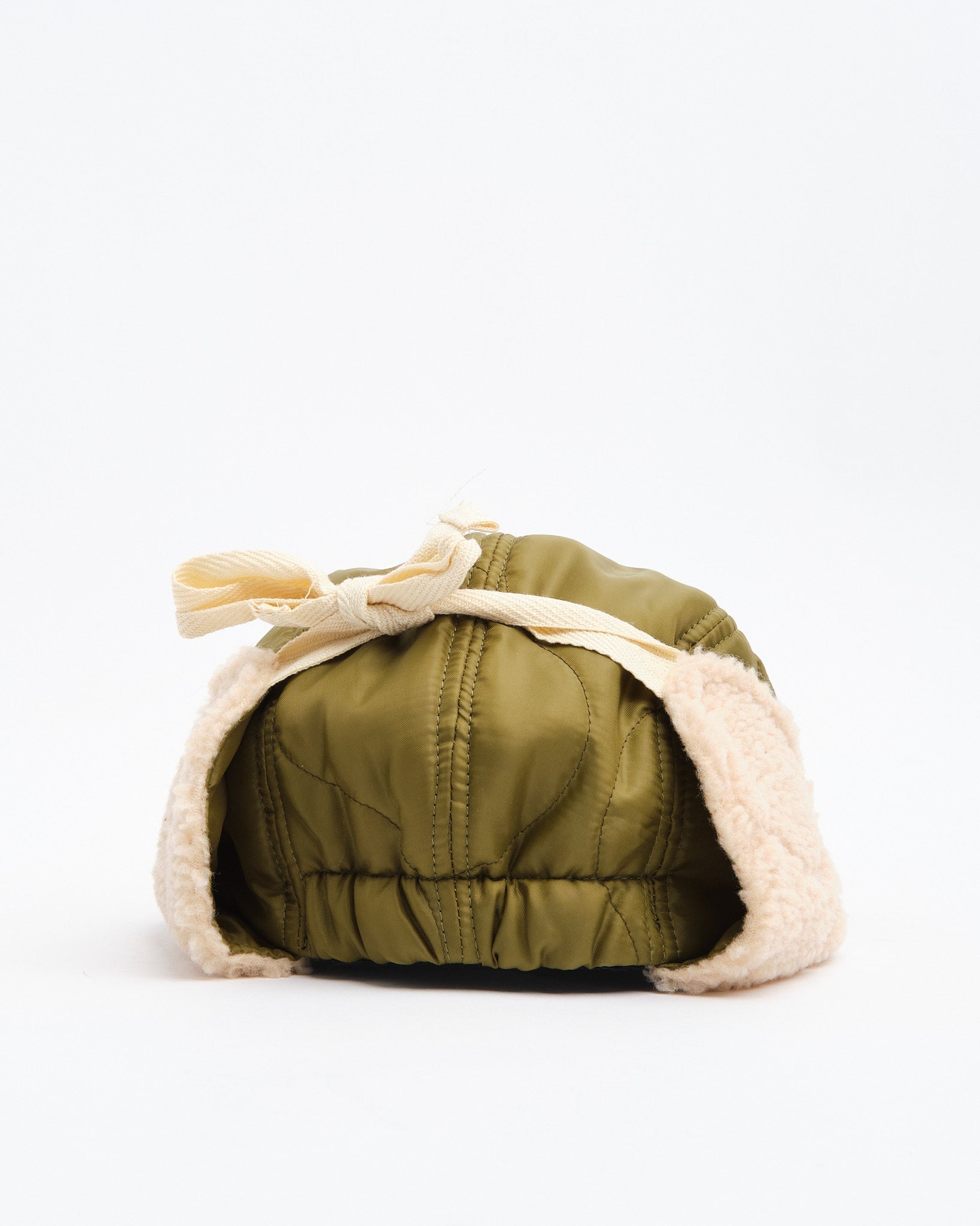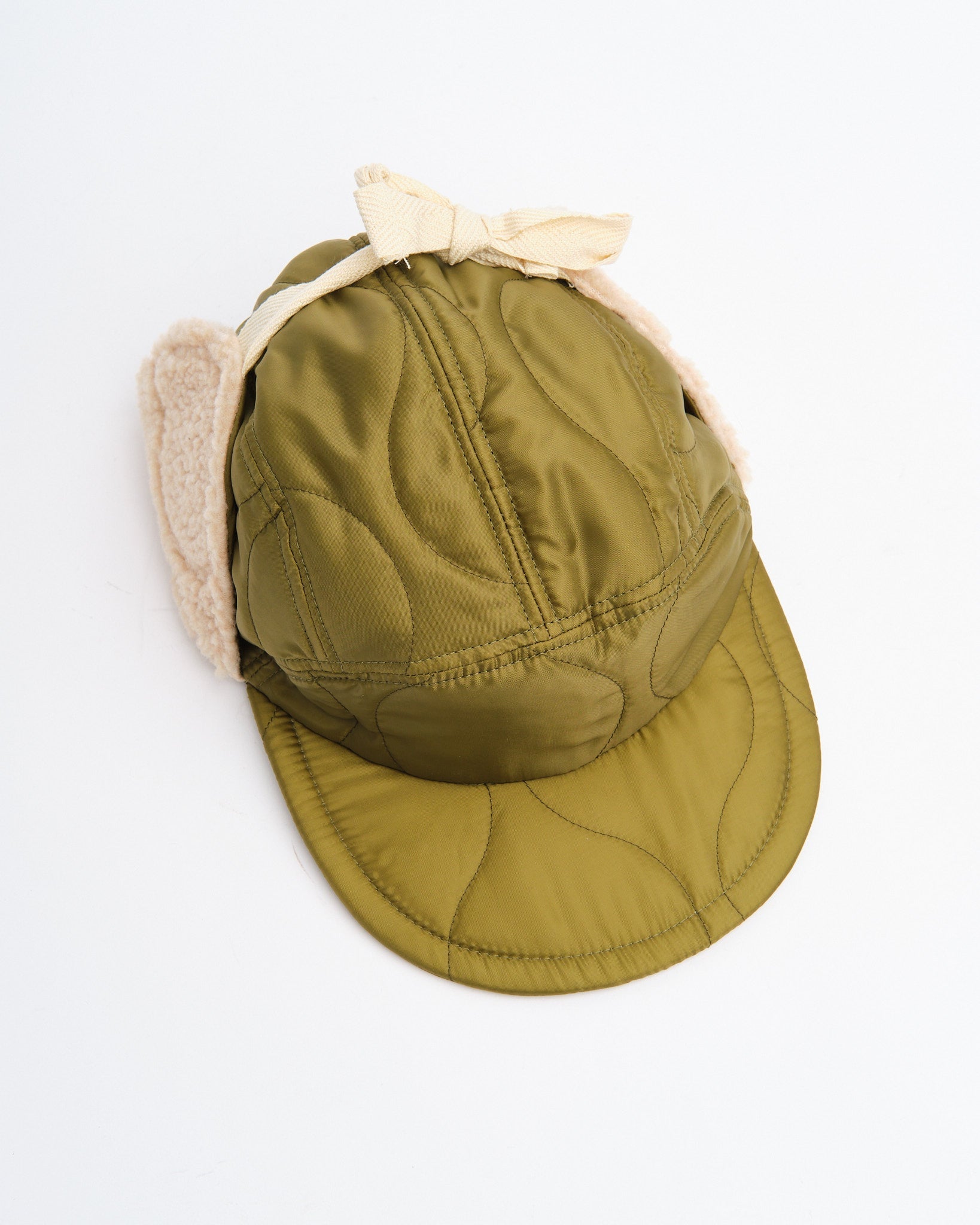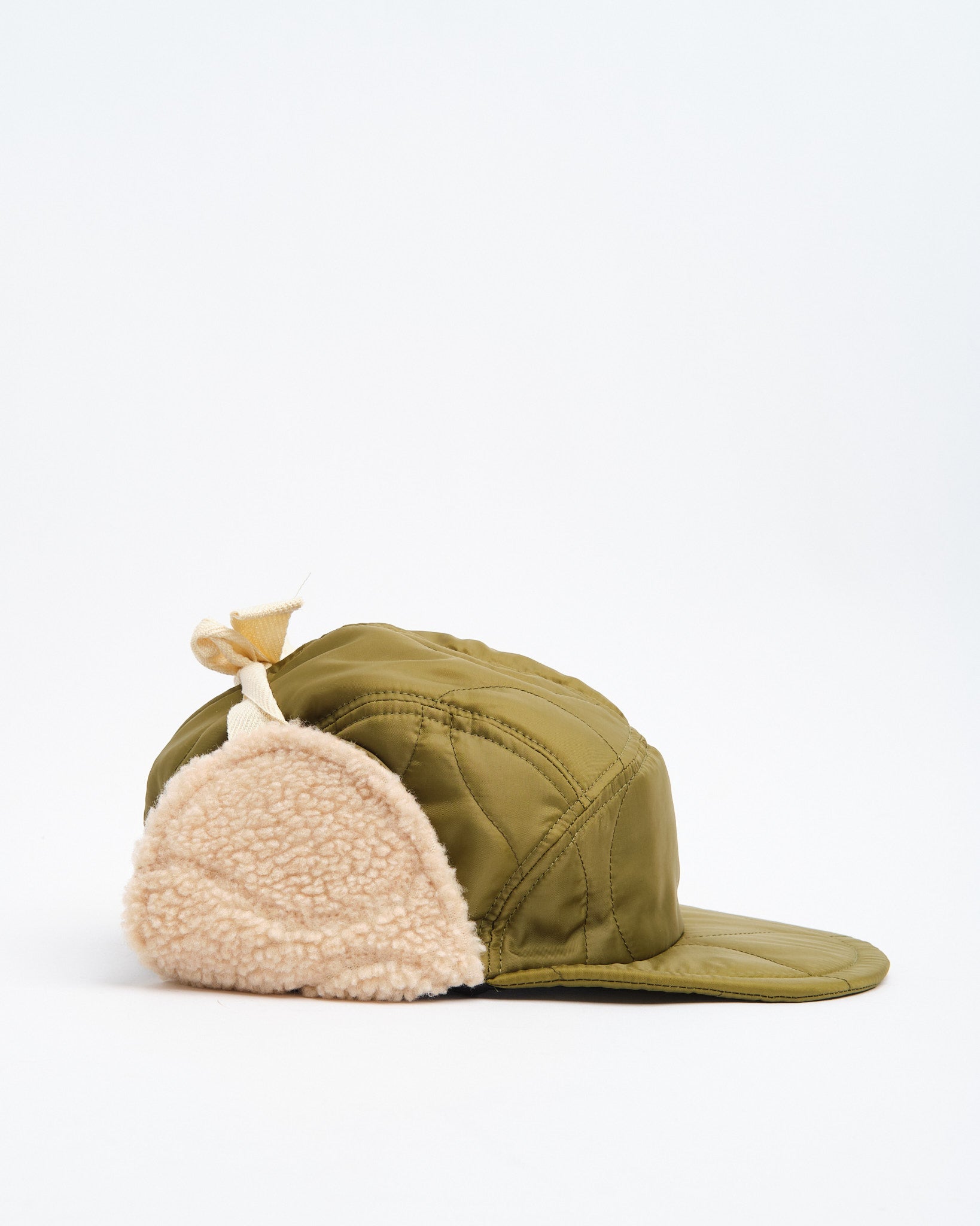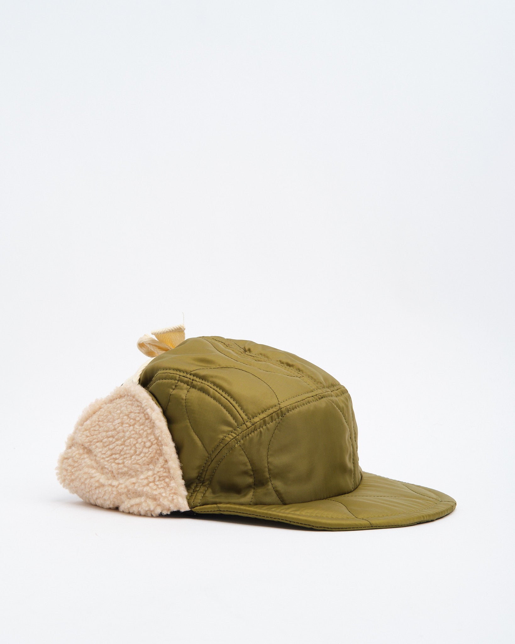 The Halfmoon Cap With Ears in Green by Found Feather is a military-inspired winter piece built for warmth and comfort. Made in Japan from a quilted nylon shell with polyester fill and soft boa fleece ear panels, this 4-panel cap is functional, lightweight, and thoughtfully detailed. A semi-wide soft EVA foam brim offers structure without bulk, while cotton flat laces and full-back elastic ensure a secure, flexible fit. Finished with hand-stamped details, cotton twill lining, and a QR-coded care label, it’s a utilitarian essential for cold-weather missions.