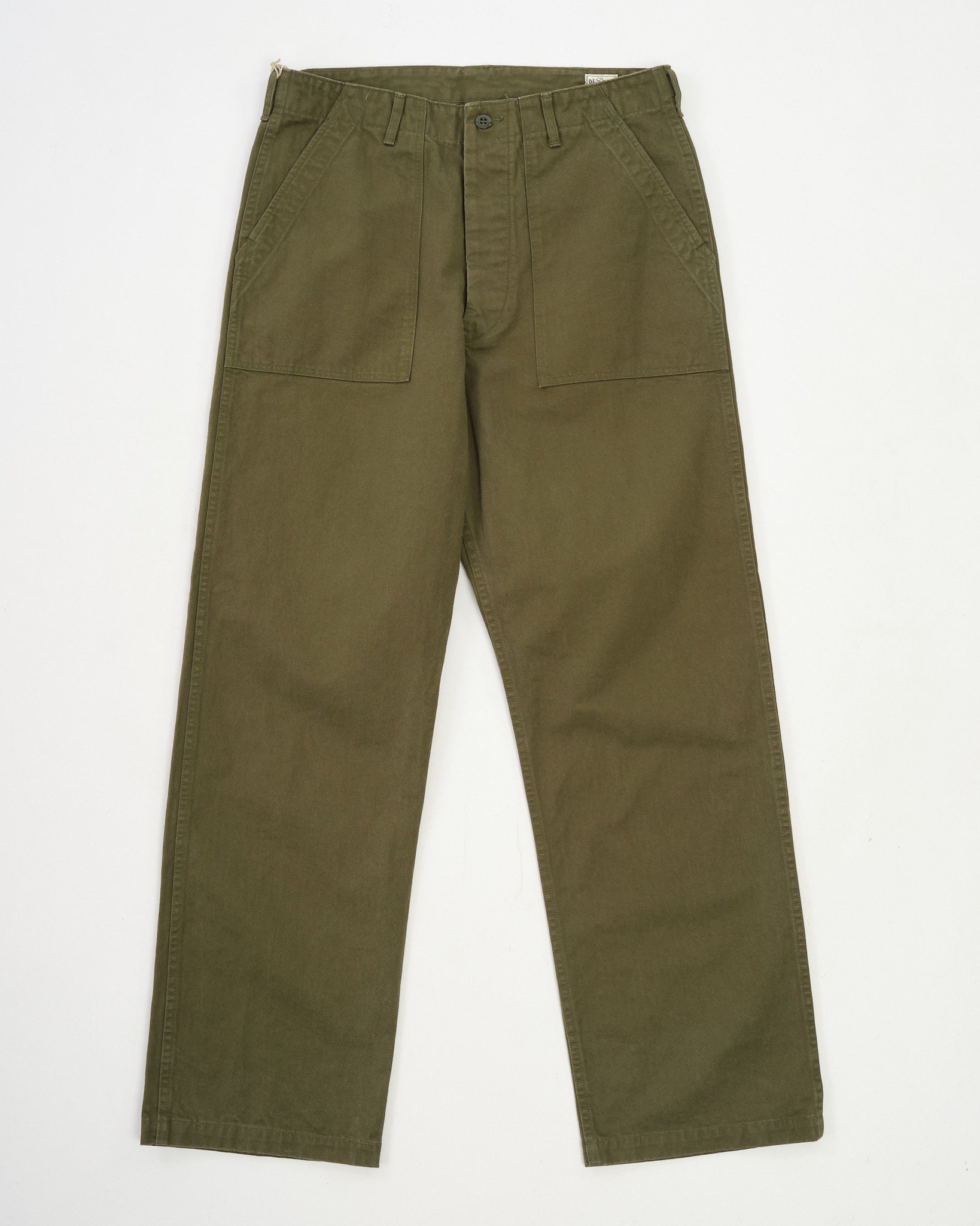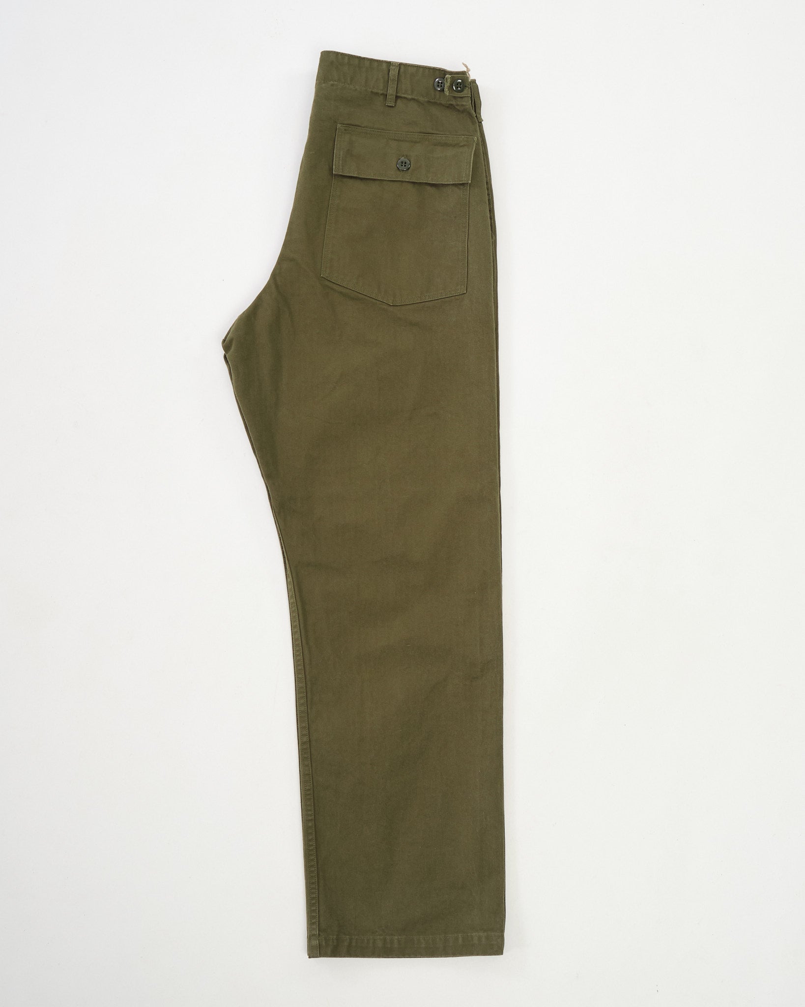 El ajuste se mantiene fiel al diseño de "Ajuste Vintage" de orSlow—amplio a través de la pierna, con un tiro profundo para un perfil relajado e inspirado en la herencia. Los detalles característicos de fatiga permanecen: bragueta de botones, tiras de ajuste laterales, bolsillos utilitarios grandes, y bolsillos con solapa reforzada en la parte trasera. El color verde militar es apagado y versátil, evolucionando con el uso a medida que la tejido texturizado se suaviza y desvanece.
