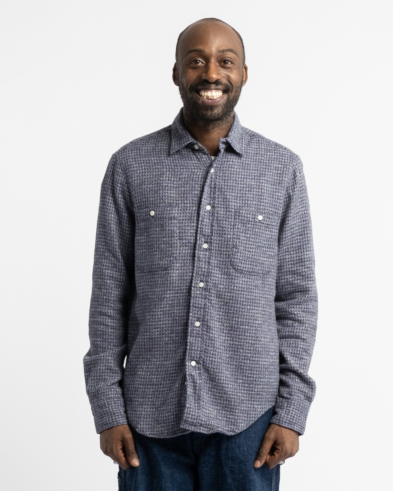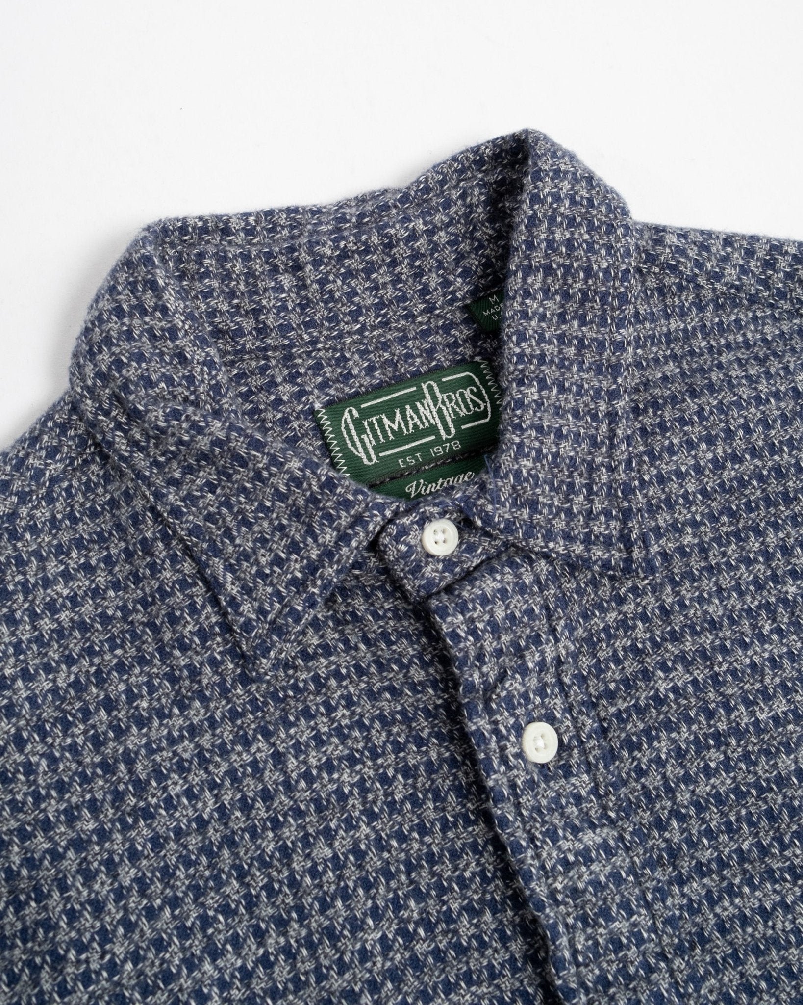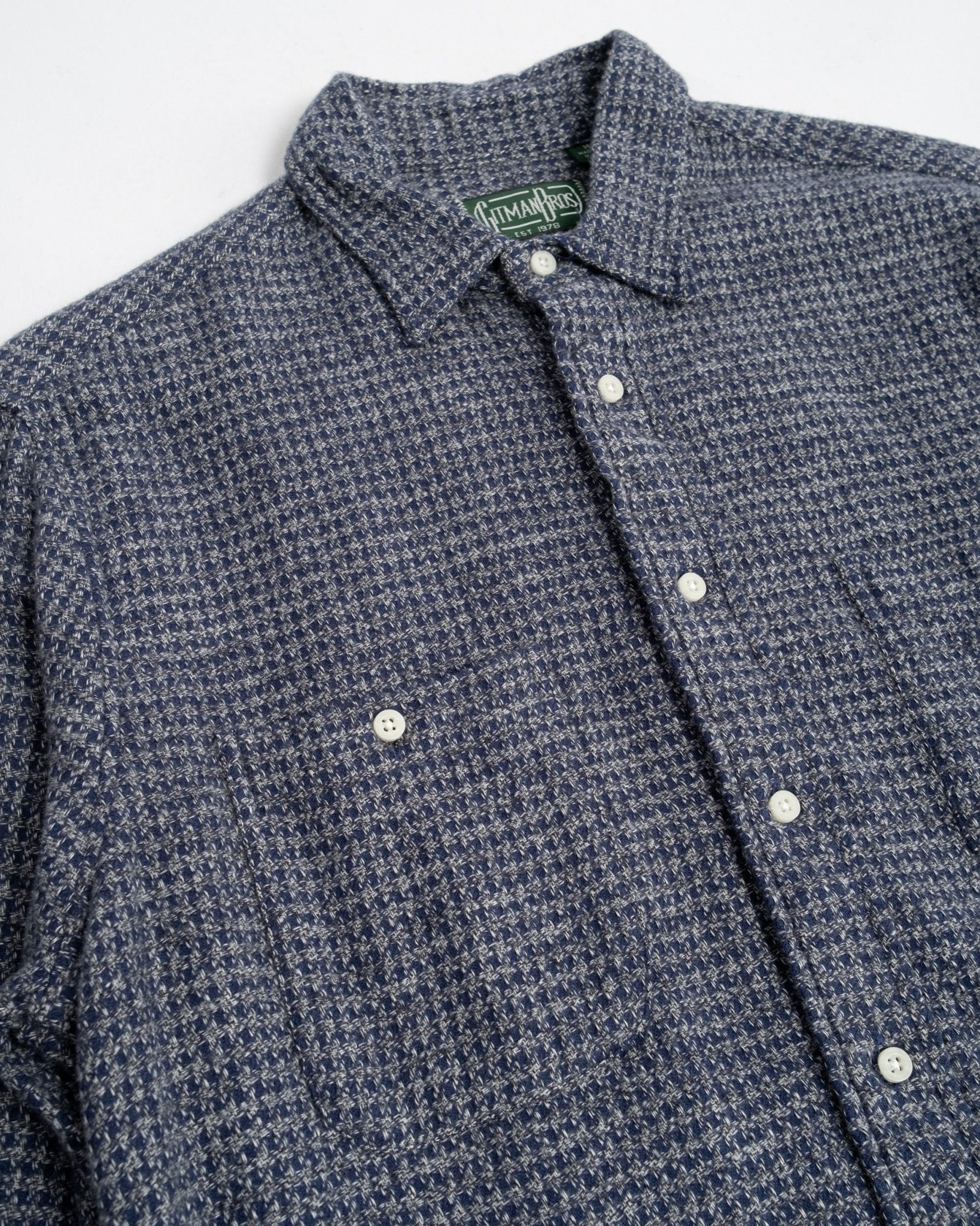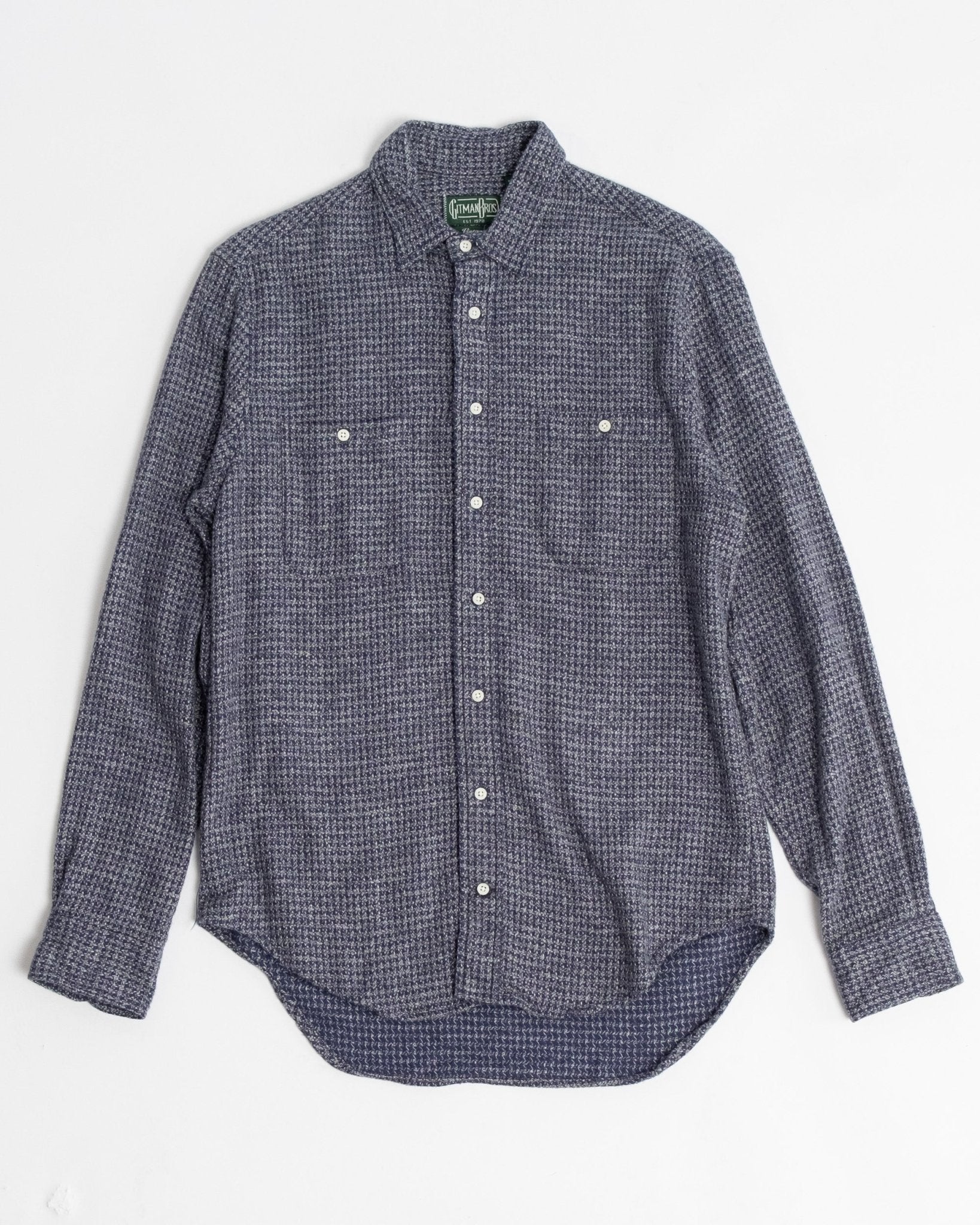 Camisa ultra suave de peso medio pesado de Gitman Vintage, el Hilo Triple Cepillado Navy. Viene con los bolsillos inspirados en la ropa de trabajo, ajuste relajado casual y superficie cepillada para esa sensación perfecta durante los meses más fríos. Hecha de 100% algodón, fabricada en EE.UU.