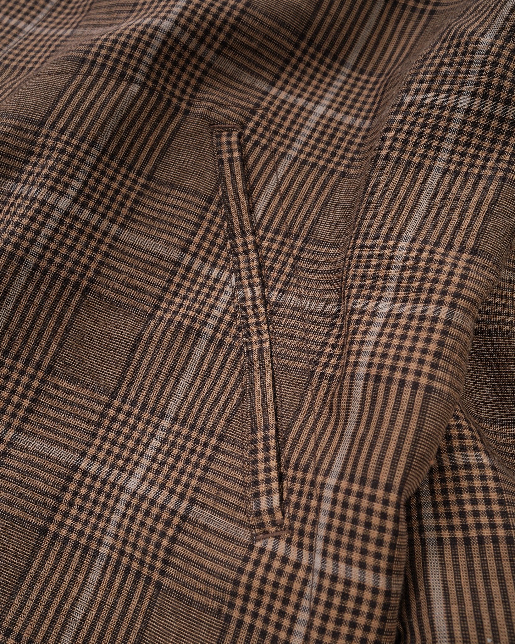 Action pleats improve mobility, while adjustable side straps allow for a slight adjustment of the silhouette. A rayon–cotton lining provides smooth comfort against the skin.