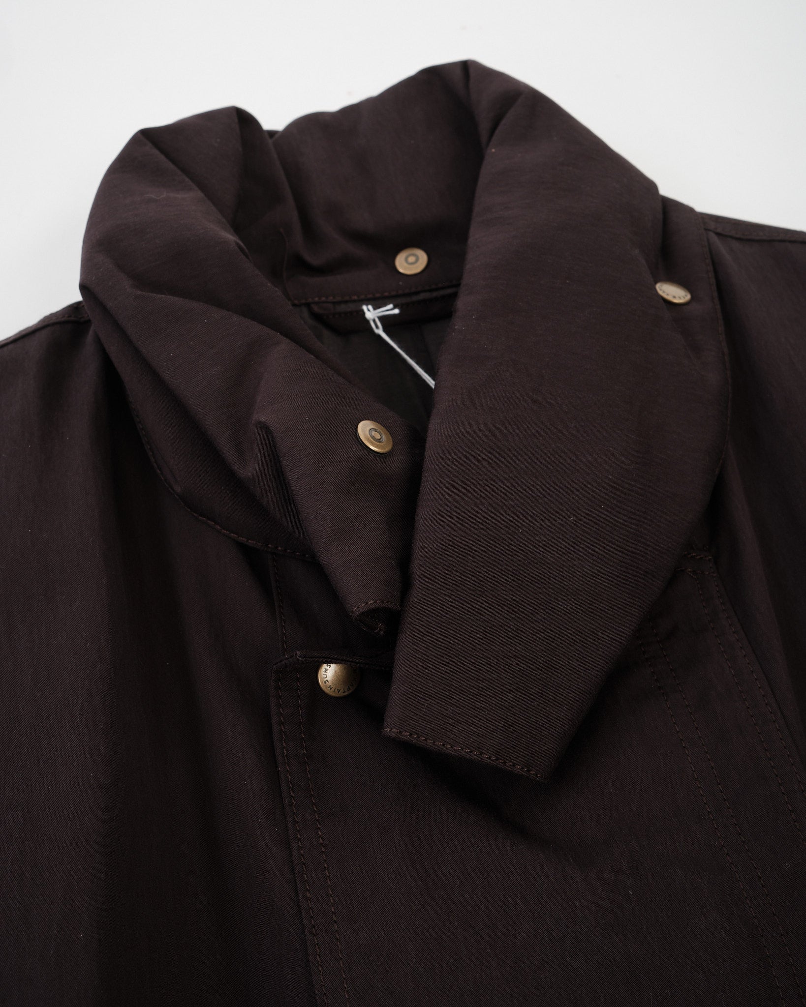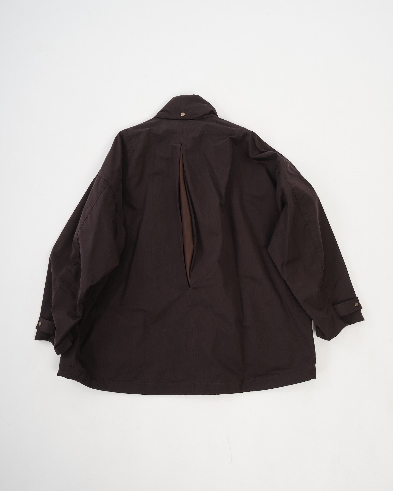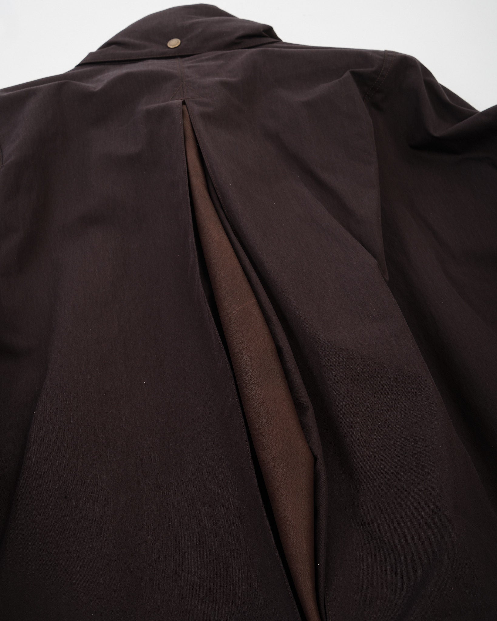 Functional details include a roll-in hood for adaptable weather protection, leather back pleats for improved movement, and leather trim that adds subtle structure and durability.