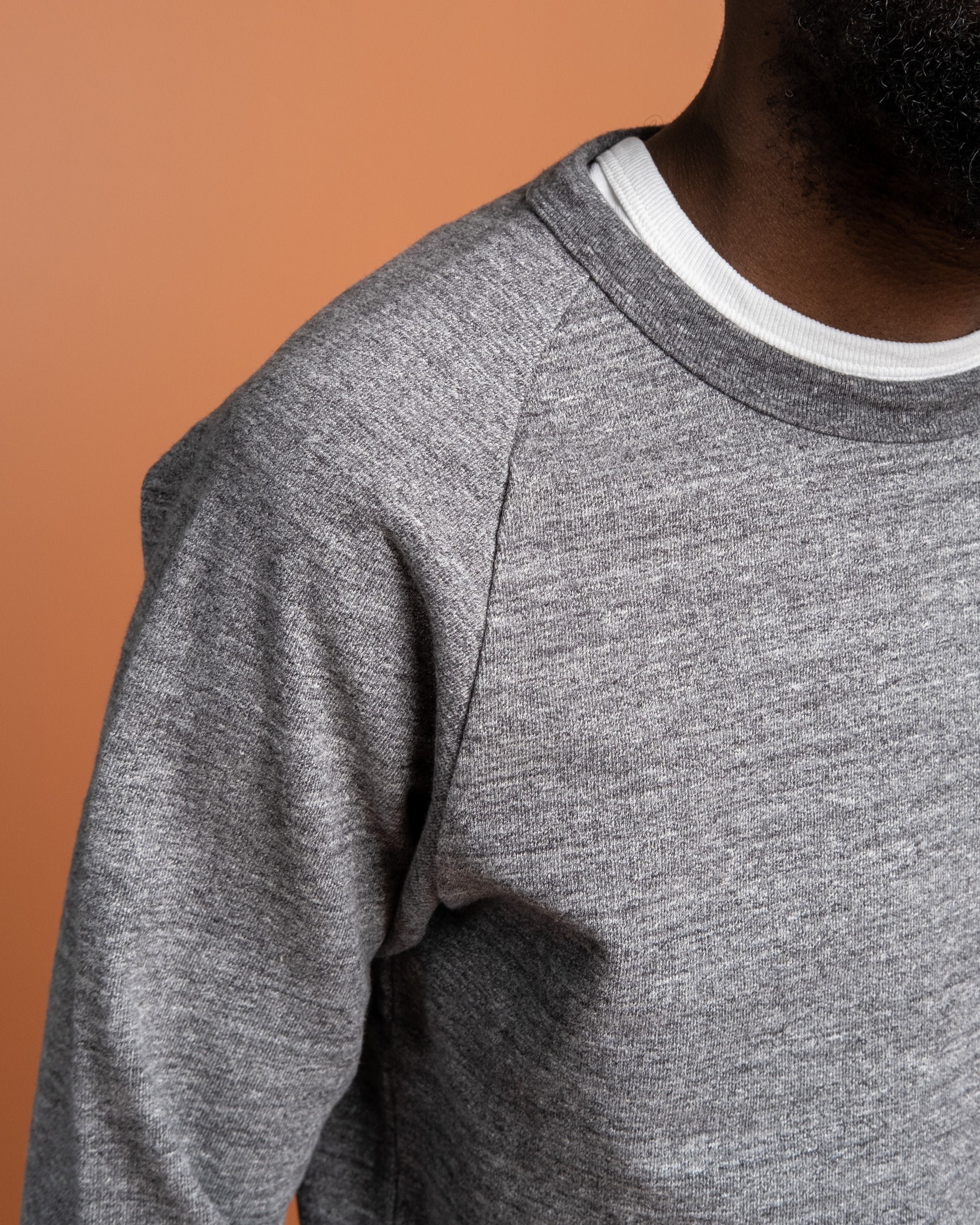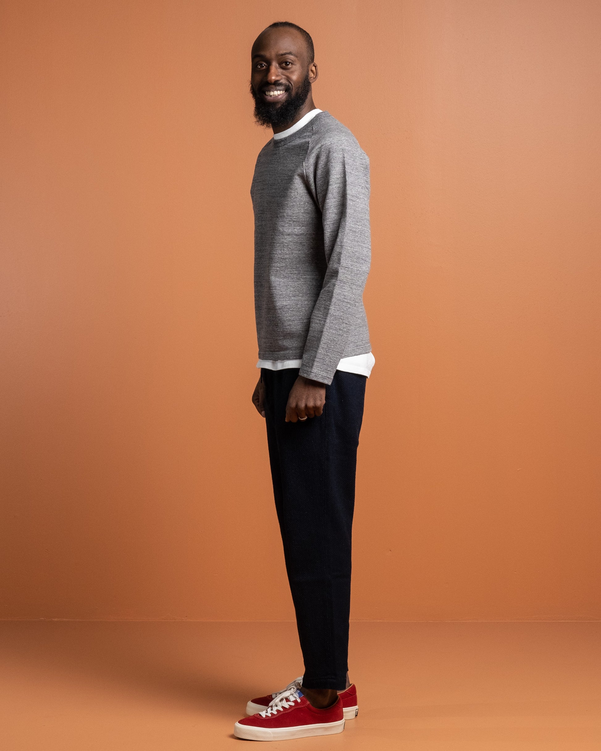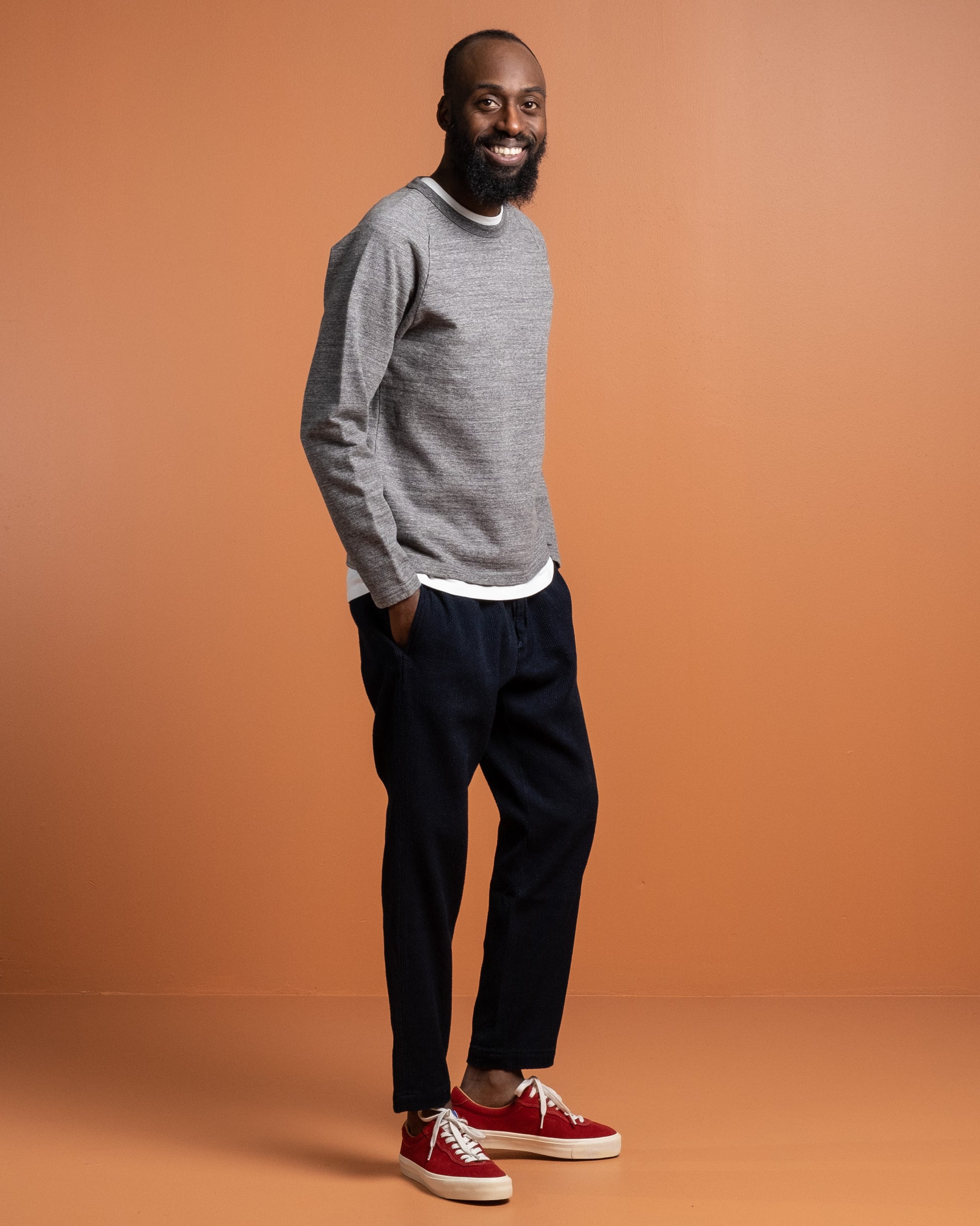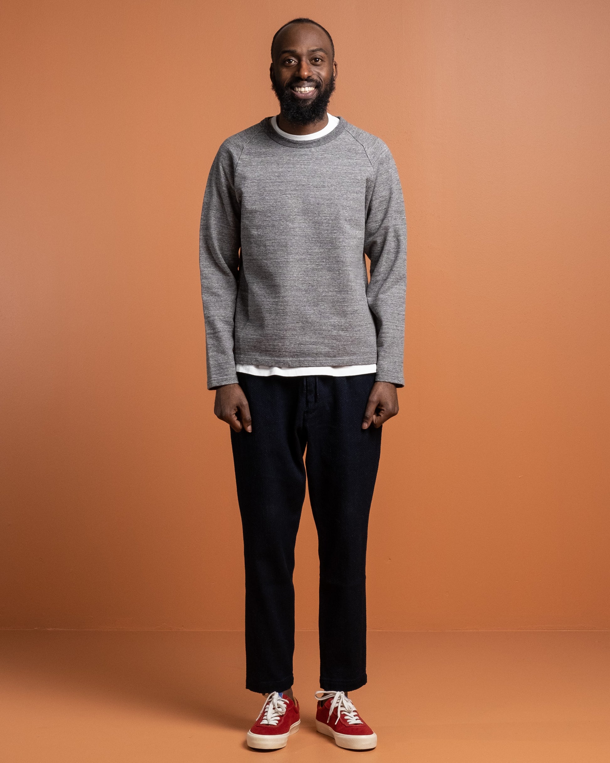 J6740J01 Camiseta de manga larga con incrustaciones de 16.5 Oz en Carbón de Japan Blue Jeans. Creada usando técnicas de tejido vintage y complejas. Preciosa tela de algodón de 16.5 oz con mangas raglán de estilo vintage. Hecho en Japón.