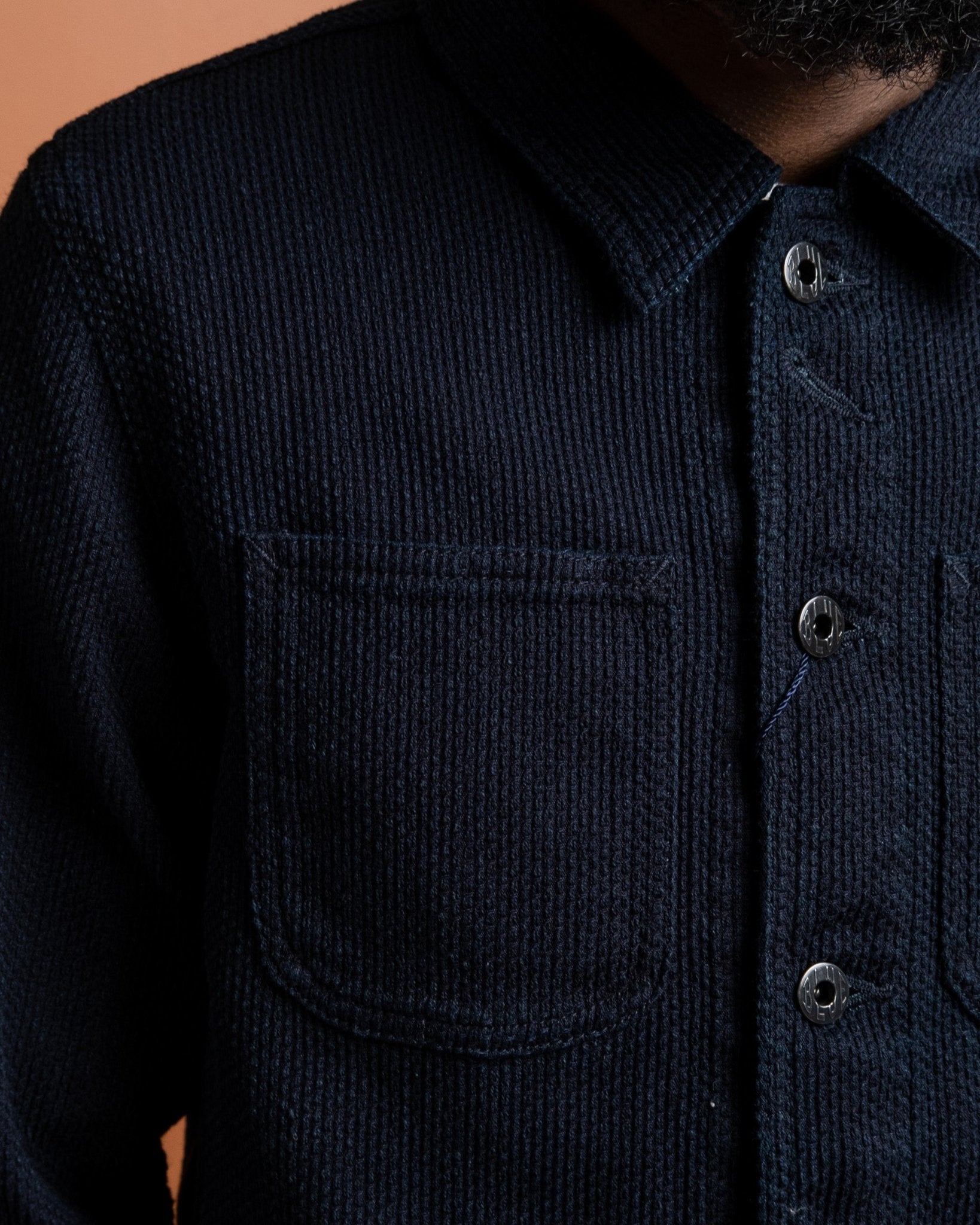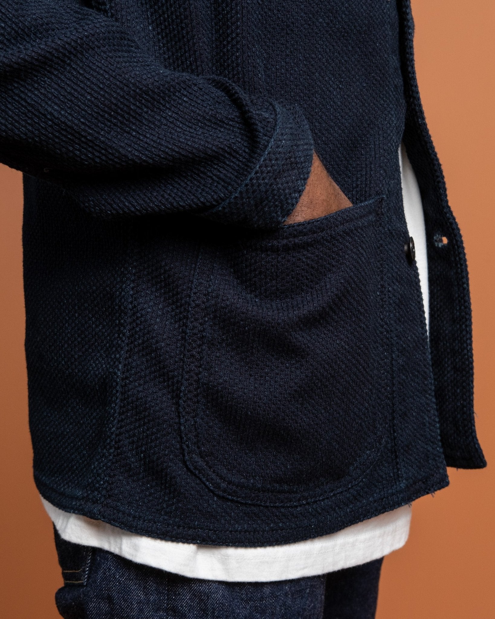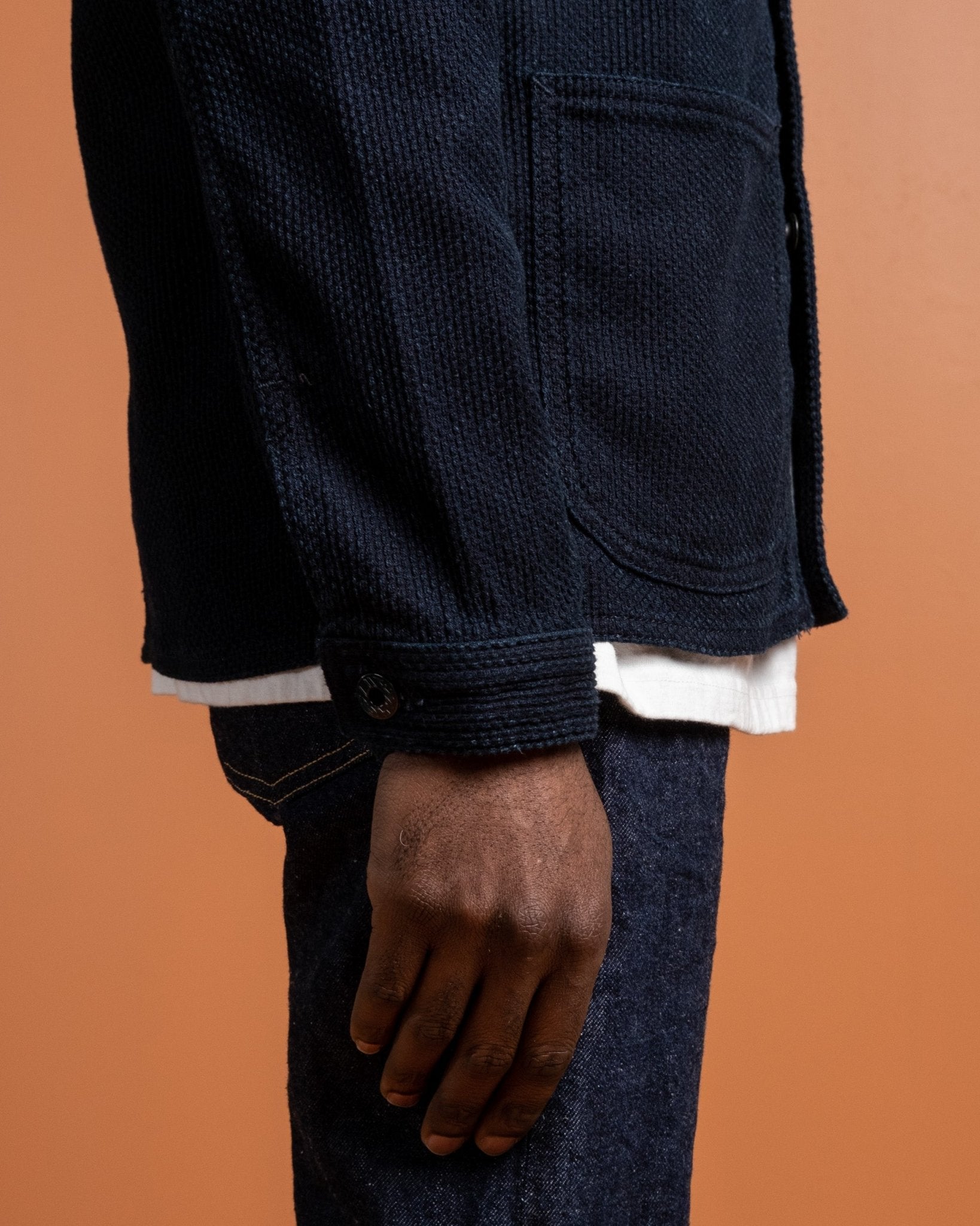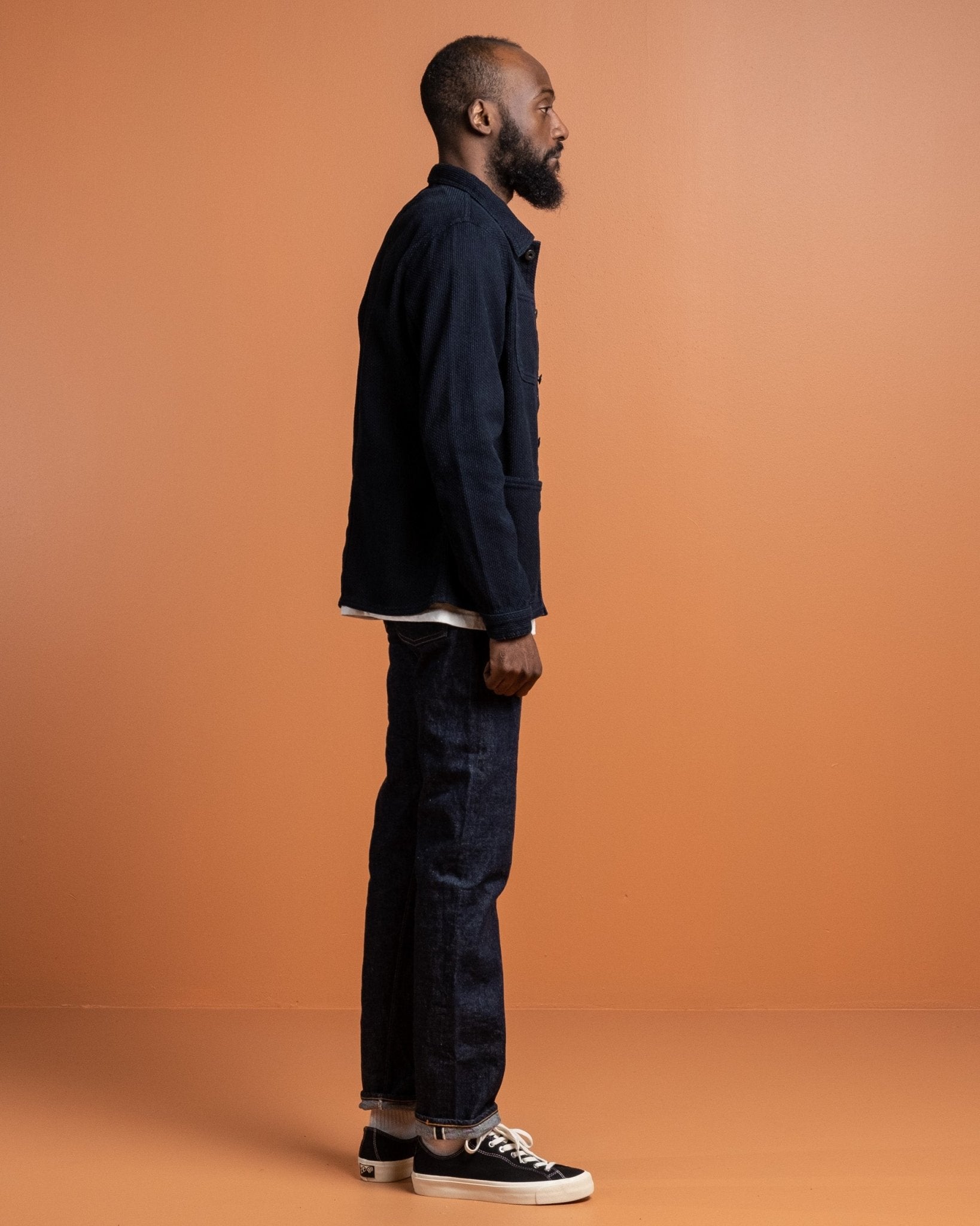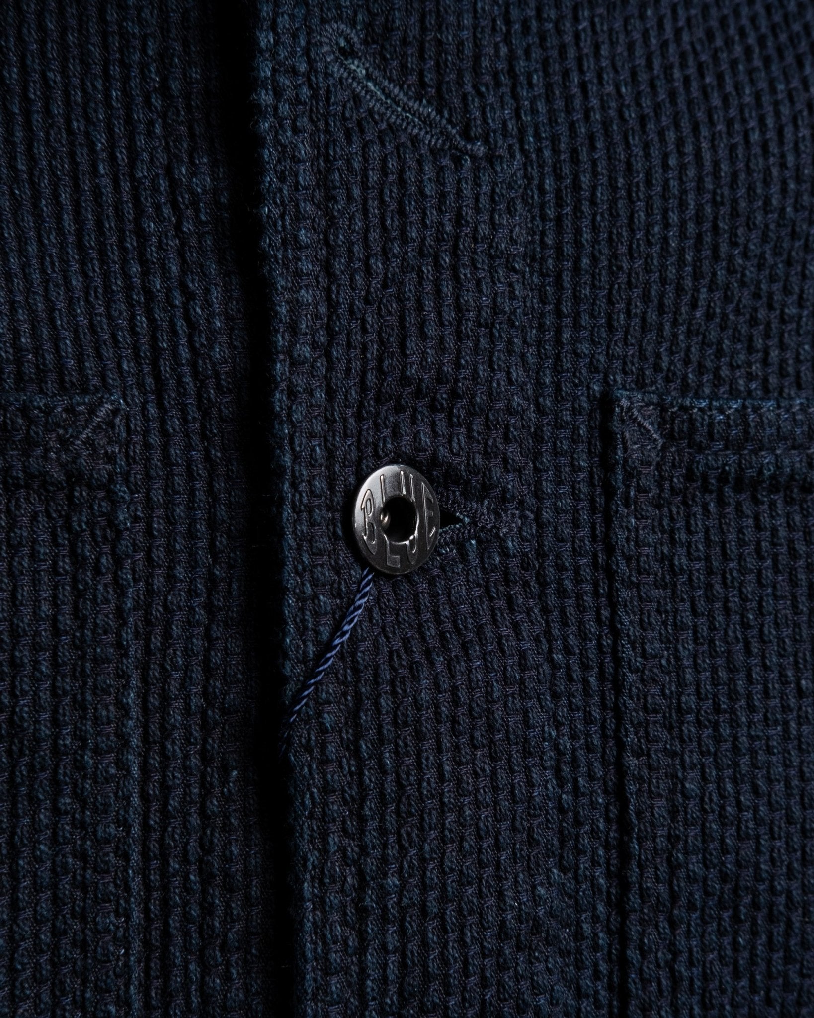 Sashiko Coverall Indigo de Japan Blue Jeans. Hecho de una tela japonesa Sashiko de 11 oz de 100% algodón. Dos bolsillos en el pecho, dos bolsillos inferiores y cierre de botón. Botones personalizados, puños ajustables y dobladillo. Hecho en Japón.
