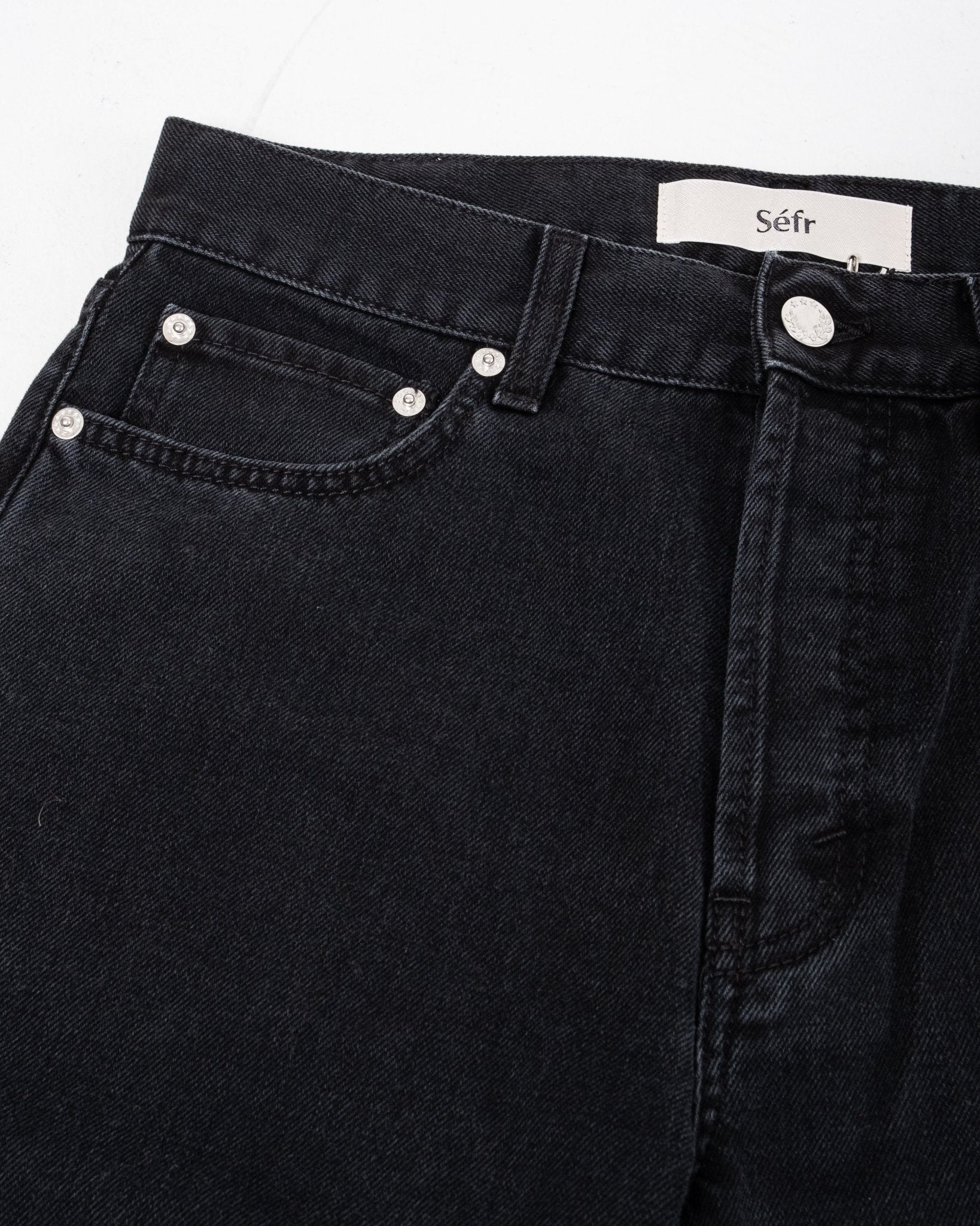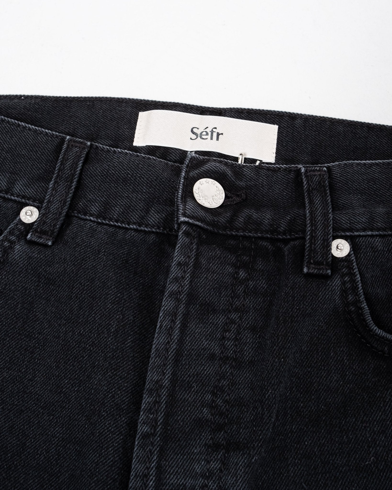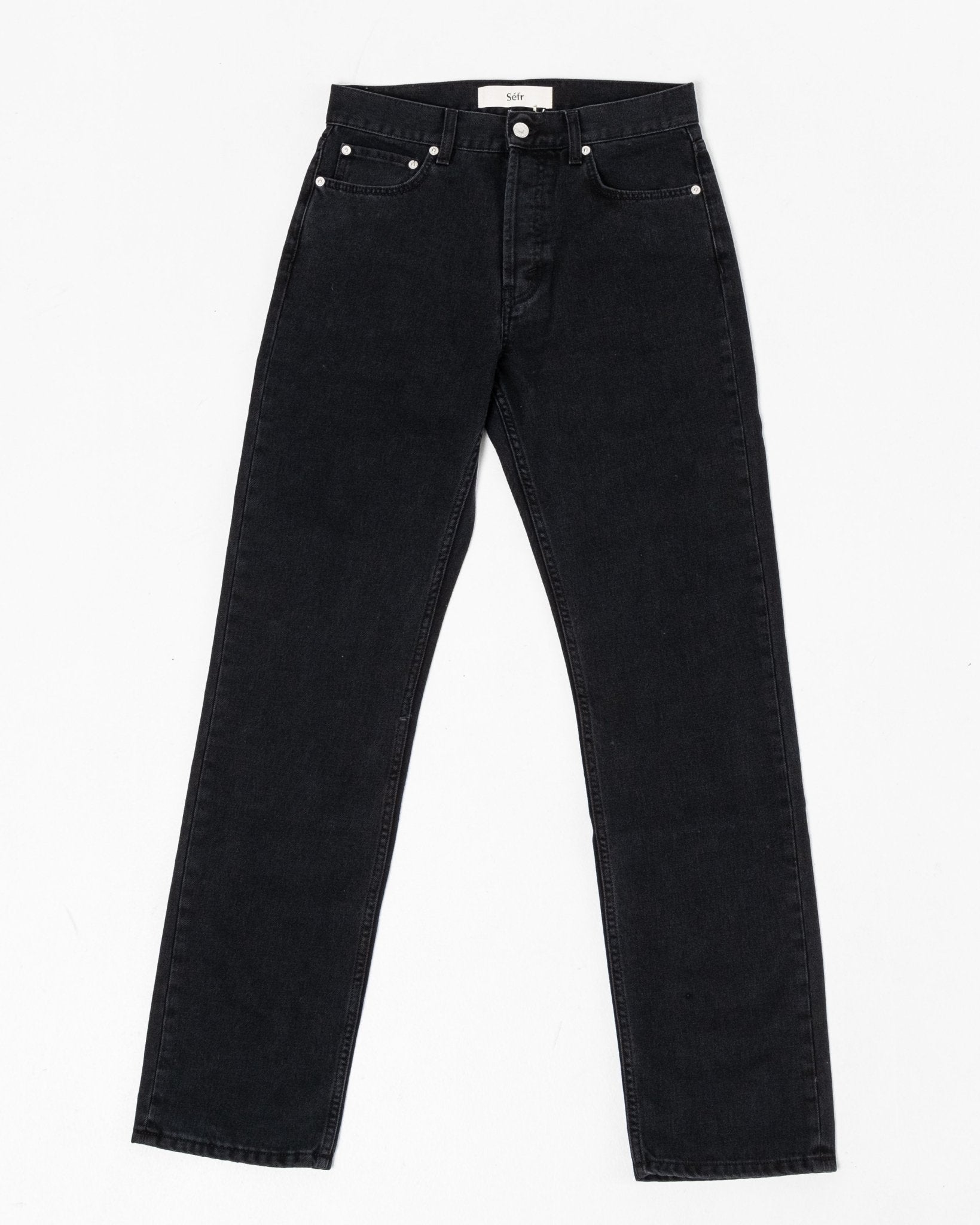 Jeans de Corte Recto en Negro Enjuagado de Séfr. Clásico jean de cinco bolsillos producido en algodón italiano de 13 oz. Cierre con botón frontal, corte recto y enjuagado una vez para un ajuste suave y cómodo desde el principio. Hecho en Letonia.