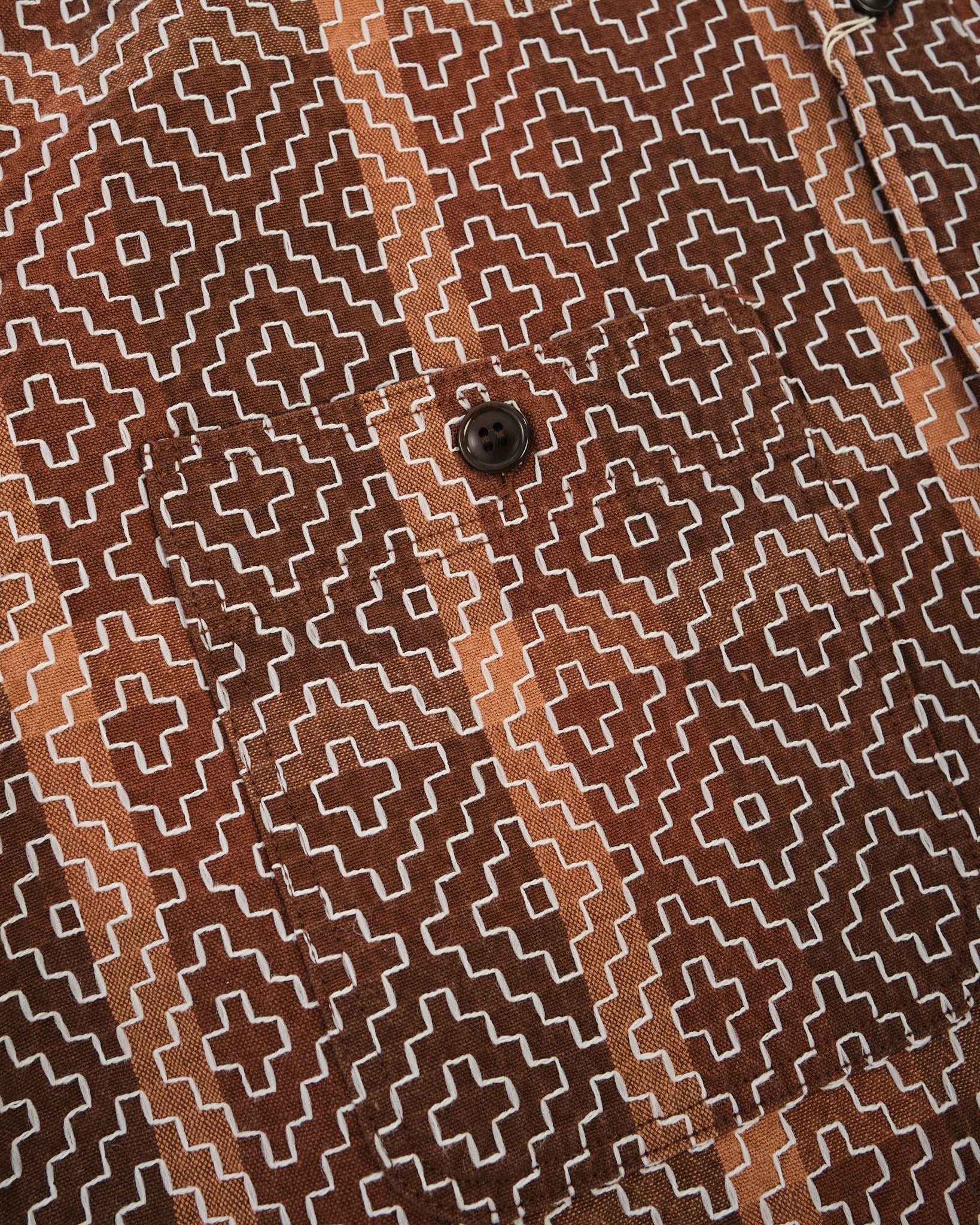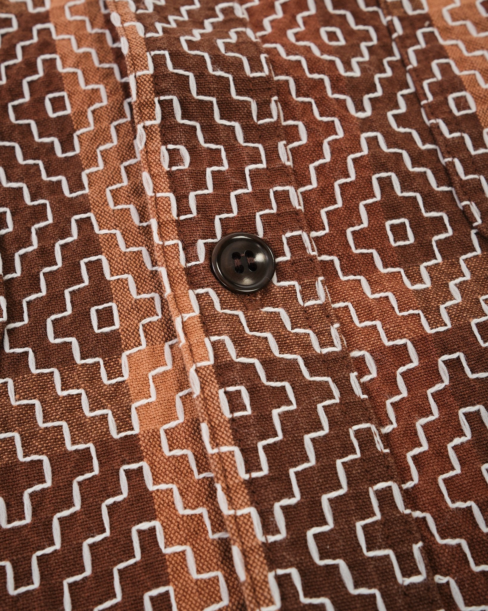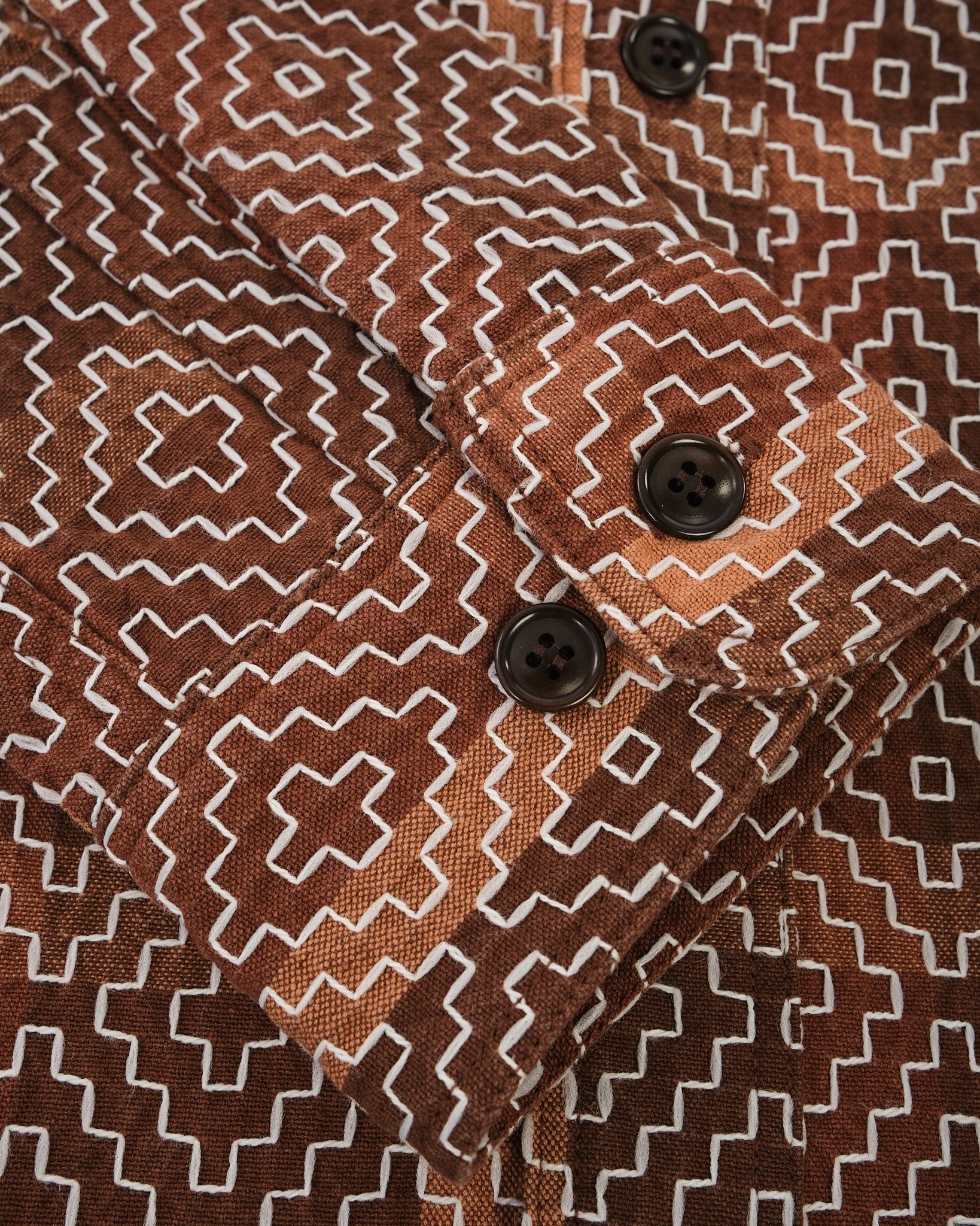 Sometida a un lavado a alta temperatura, la tela exhibe una textura única que recuerda al sashiko cosido a mano, resultado del encogimiento diferencial entre el conteo de hilos y el material. La camisa se termina con botones elaborados a partir de material de nuez natural, realzando su autenticidad y atractivo ecológico.