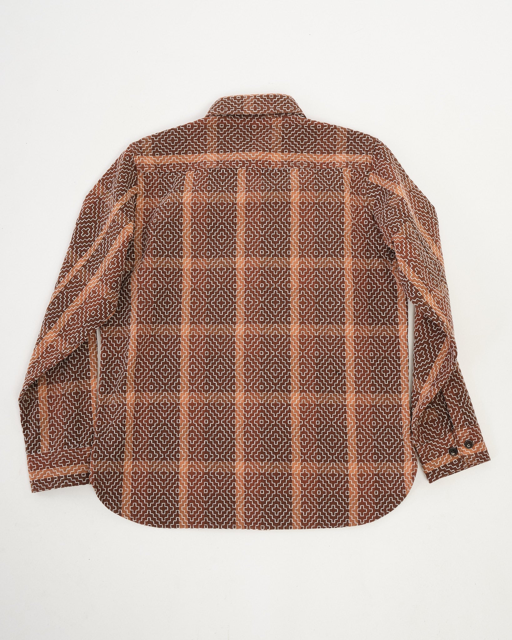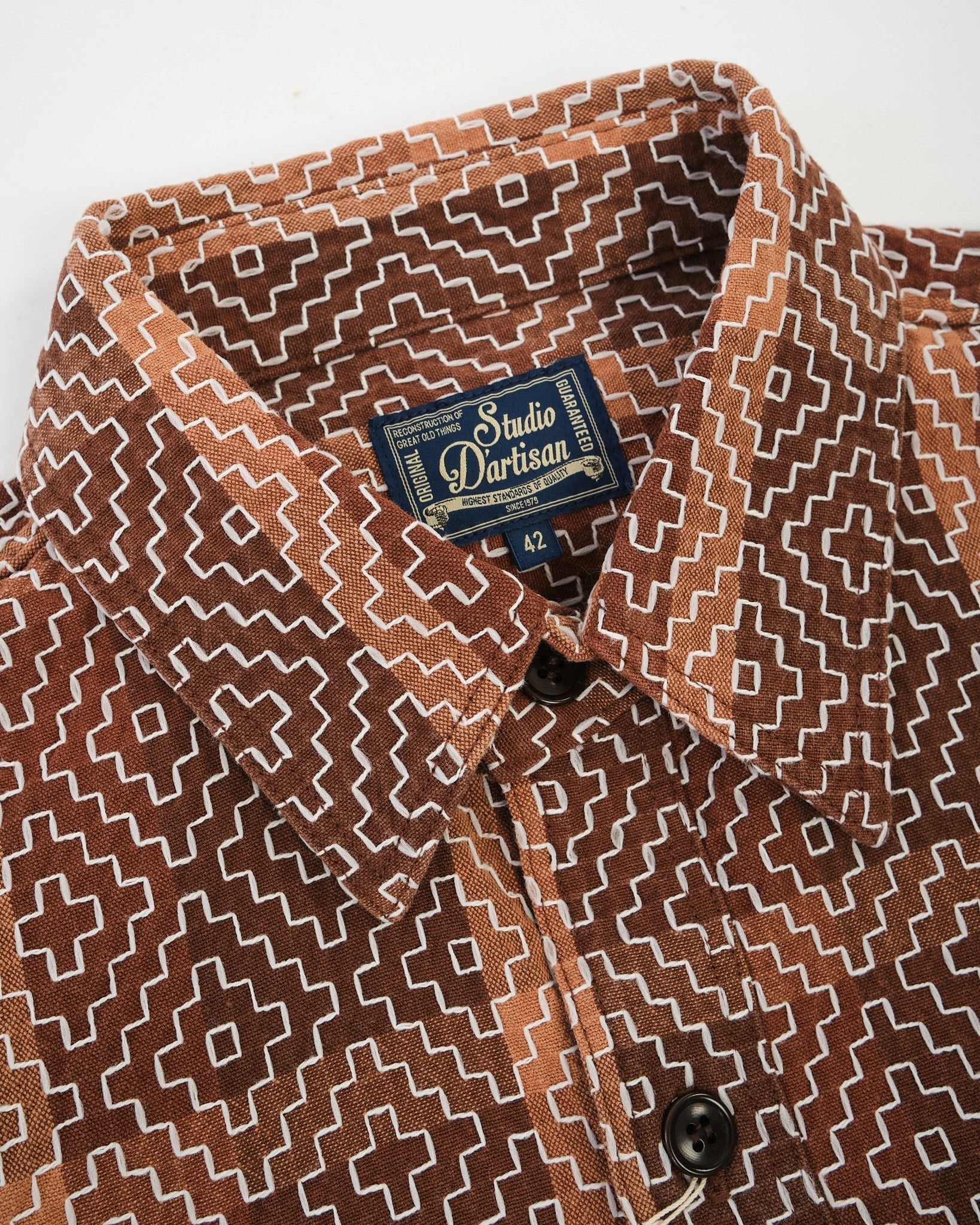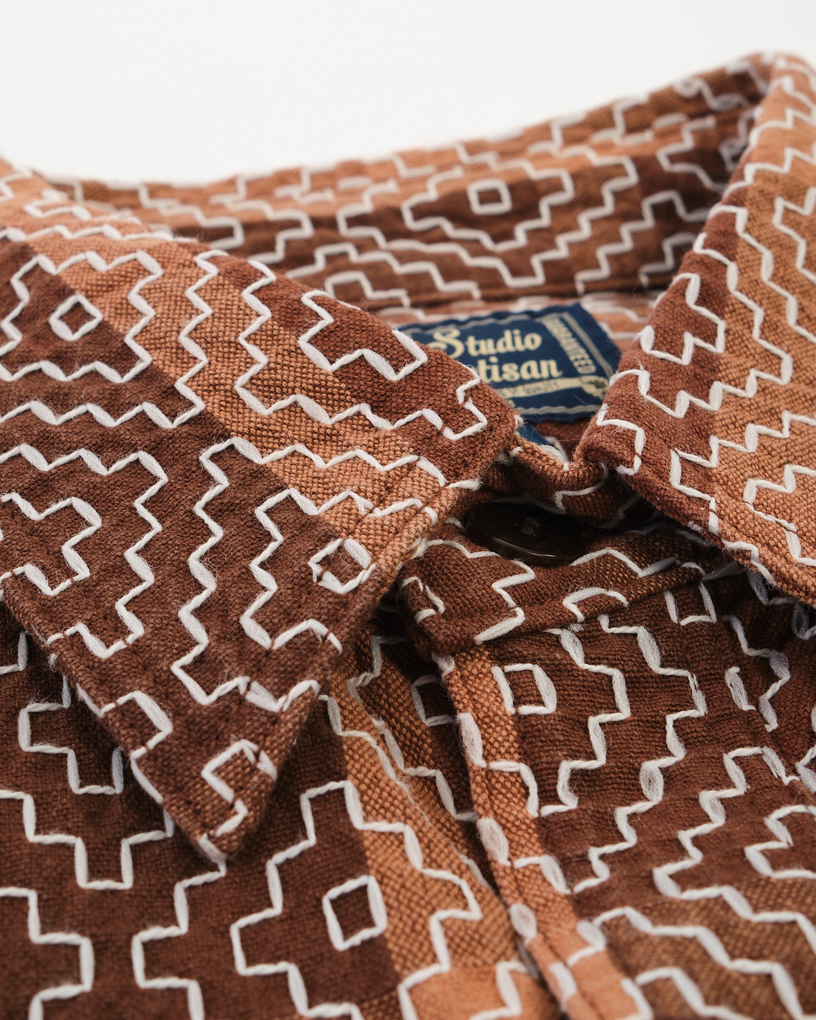La Camisa de Trabajo Sashiko Noragi Kakishibu de STUDIO D'ARTISAN (5726) ejemplifica la fusión de técnicas tradicionales japonesas de teñido con el diseño contemporáneo de ropa de trabajo. Esta camisa de trabajo está meticulosamente elaborada a partir del original tejido Kakishibu-zome Noragi Sashiko, donde se emplea el teñido con Kakishibu—un método que utiliza tanino de caqui—para lograr un patrón de cuadros distintivo mediante el uso de tres diferentes colores de hilo teñido. La costura sashiko vertical y horizontal presenta un diseño tradicional de hoja de caqui, añadiendo profundidad y significado cultural a la prenda.