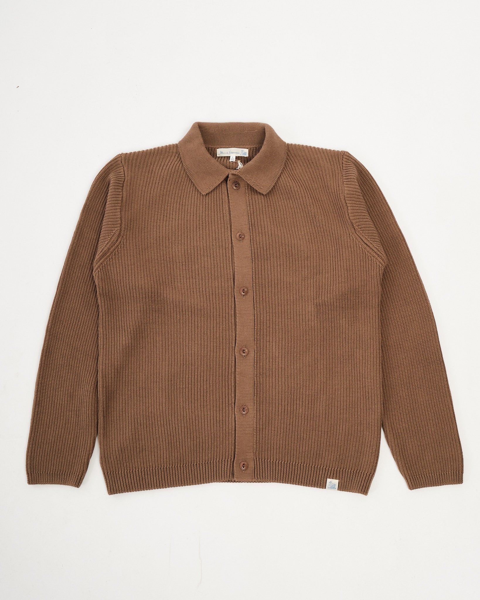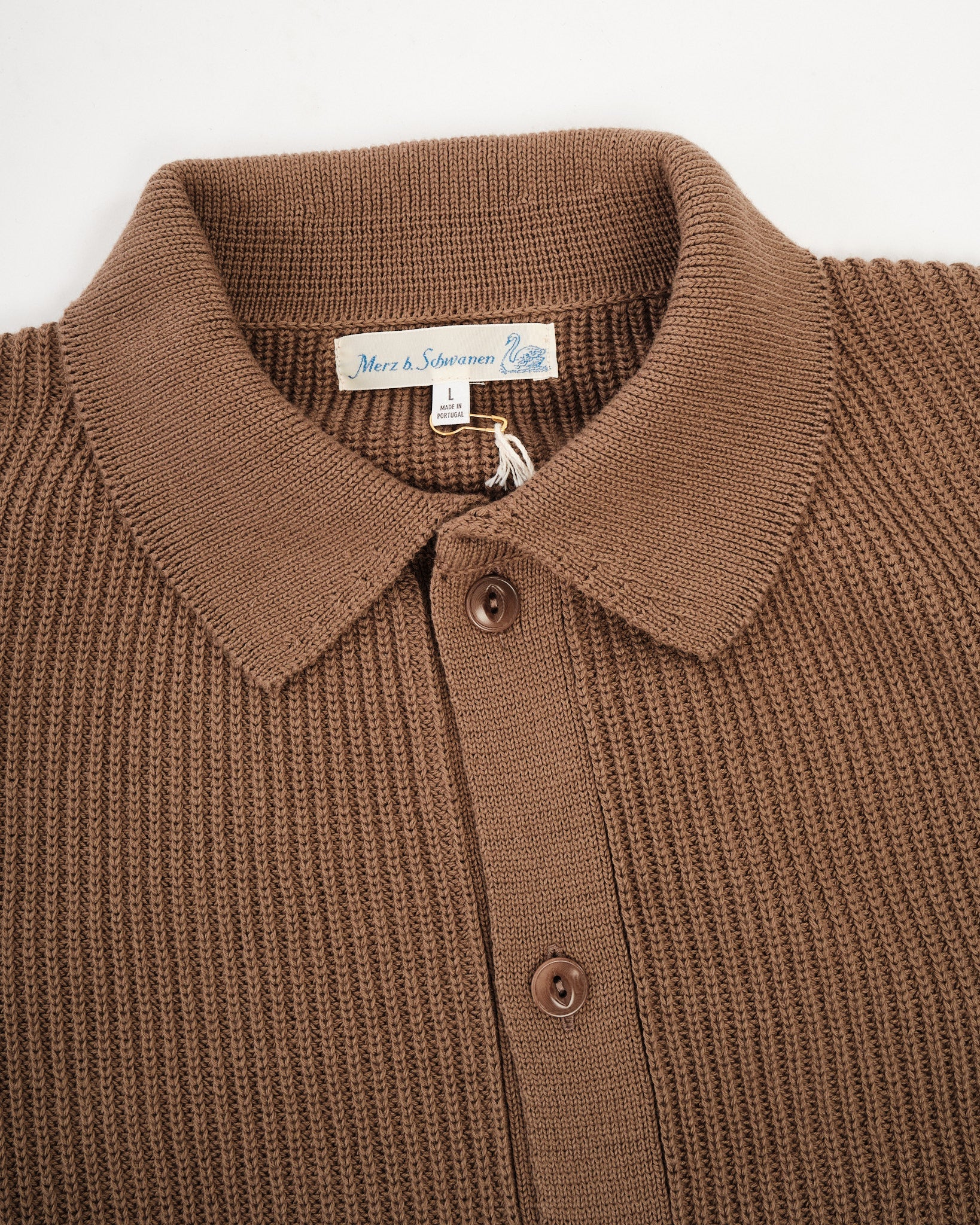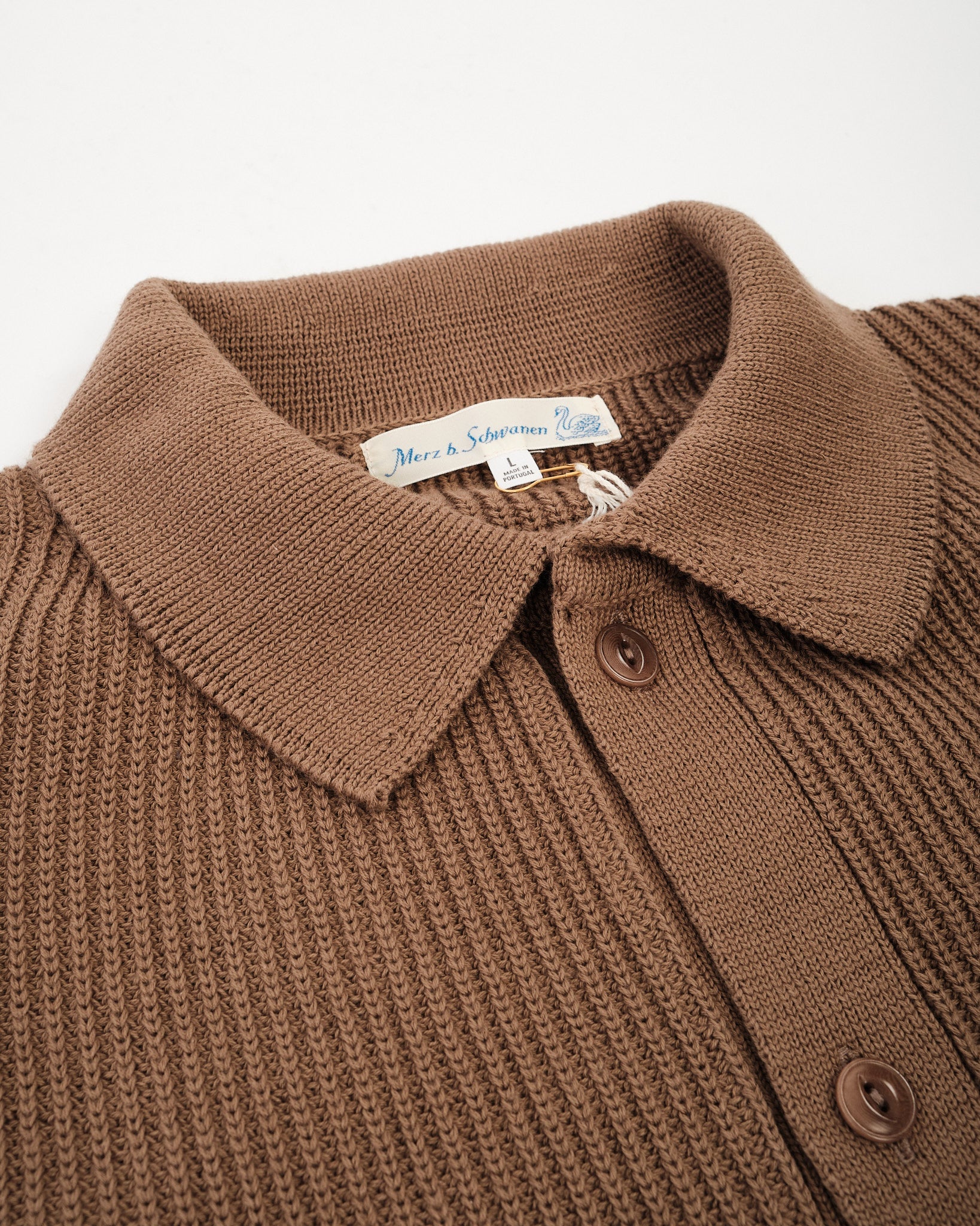 The KNITSHIRT05.06 by Merz b. Schwanen blends the comfort of a T-shirt with the texture of a fine knit. Made in Portugal from 100% organic cotton, it features a ribbed structure that gives the fabric a naturally elastic, breathable quality. The knitted collar and corozo nut buttons add subtle refinement, while the relaxed fit keeps it easy to wear. With its gentle retro touch and the signature swan loop label at the hem, it’s a versatile piece that moves effortlessly from casual to smart.