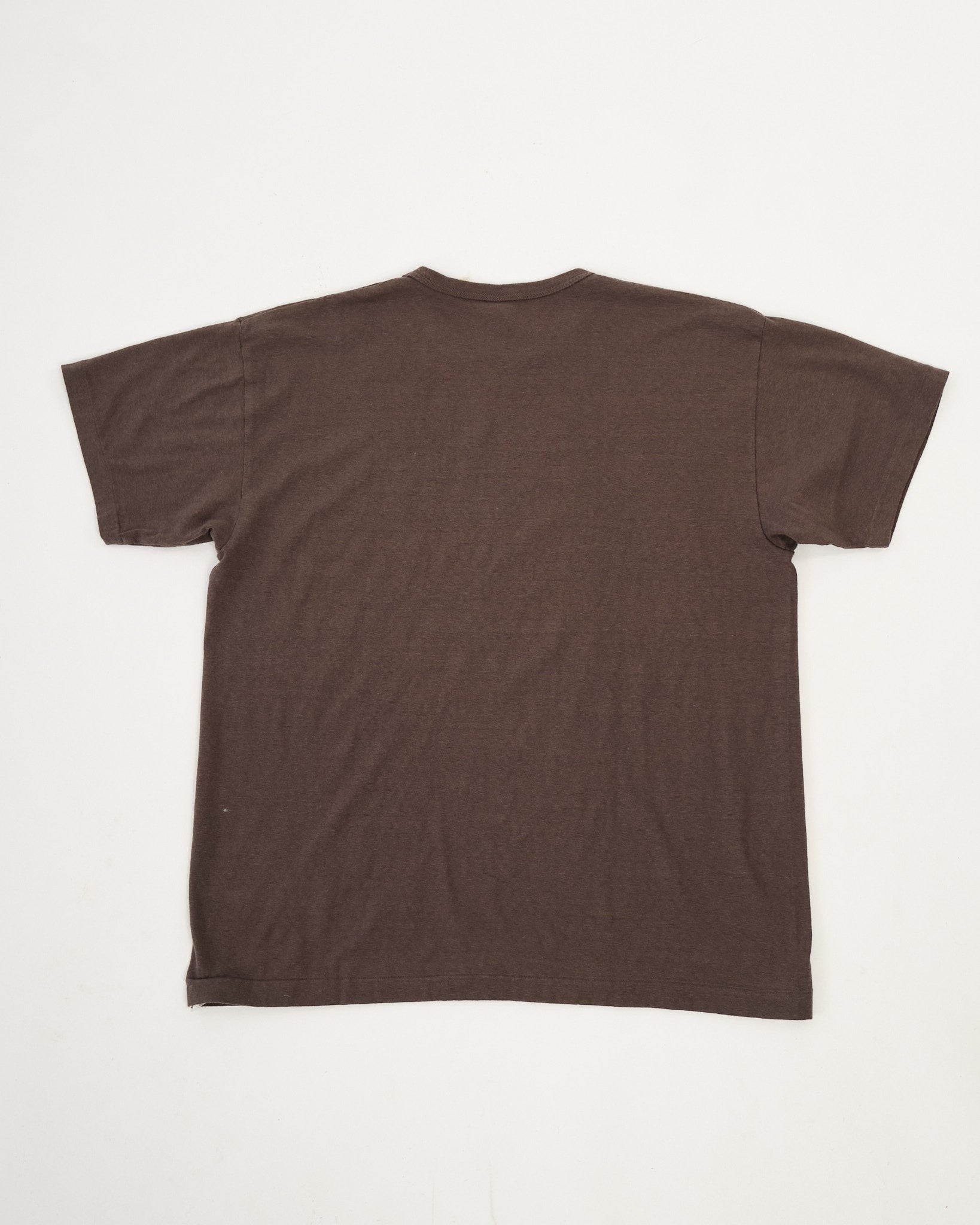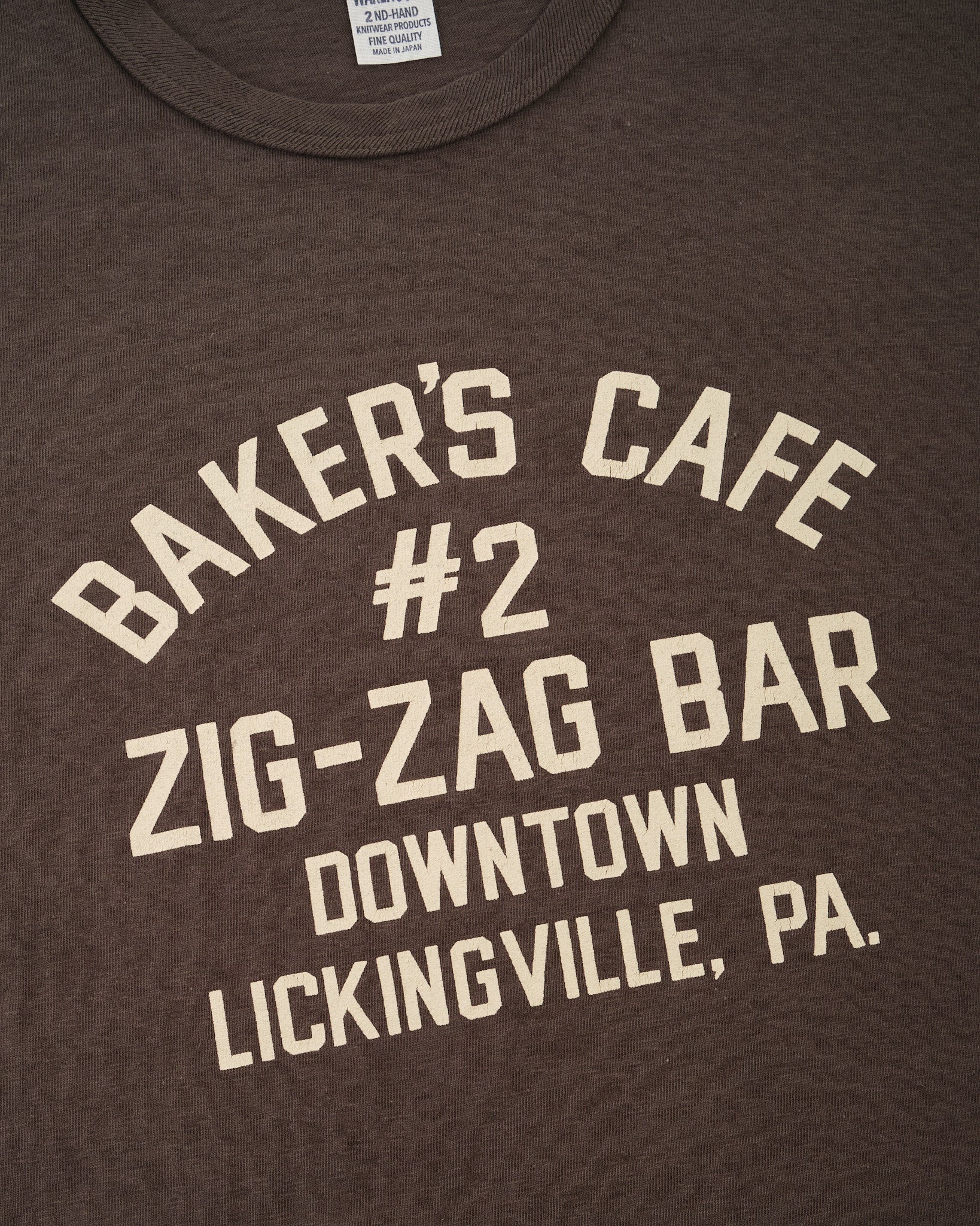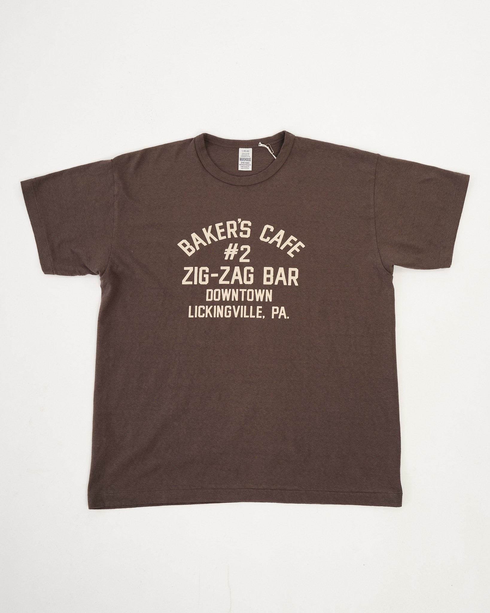 Los detalles incluyen un cuello moderadamente suelto, un cuerpo con un tono naturalmente descolorido y un estampado desgastado de “Zig-Zag Bar” que se siente perfectamente en su lugar en un original de mediados de siglo. El acabado cepillado suma a la textura desgastada, dando a la camiseta una auténtica sensación de segunda mano desde el primer día.
