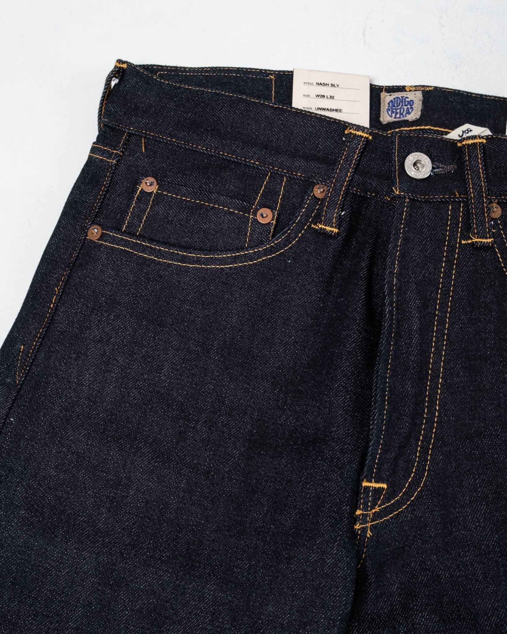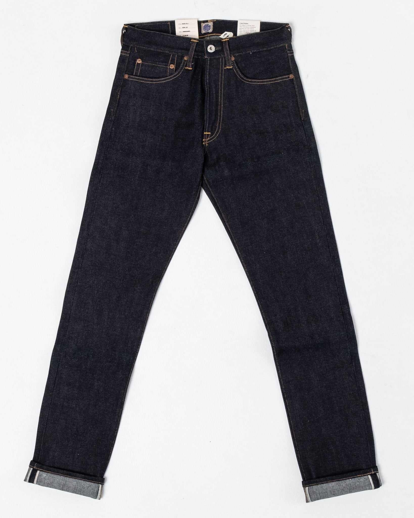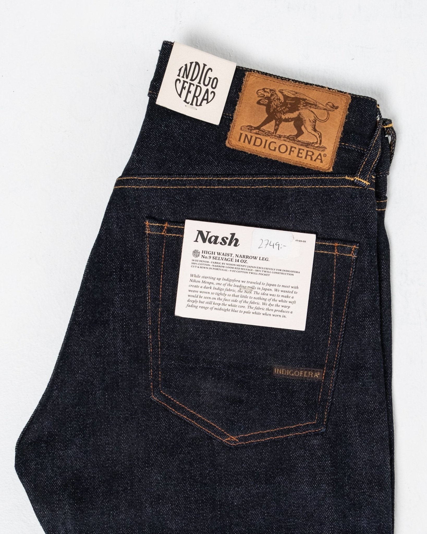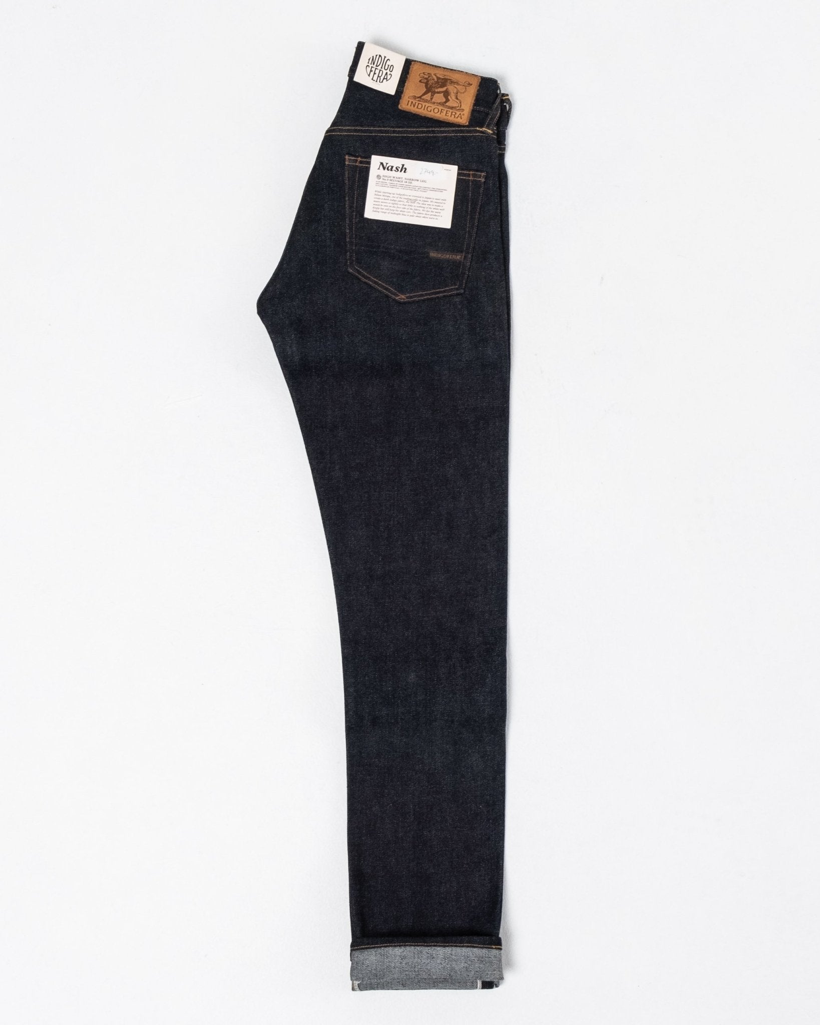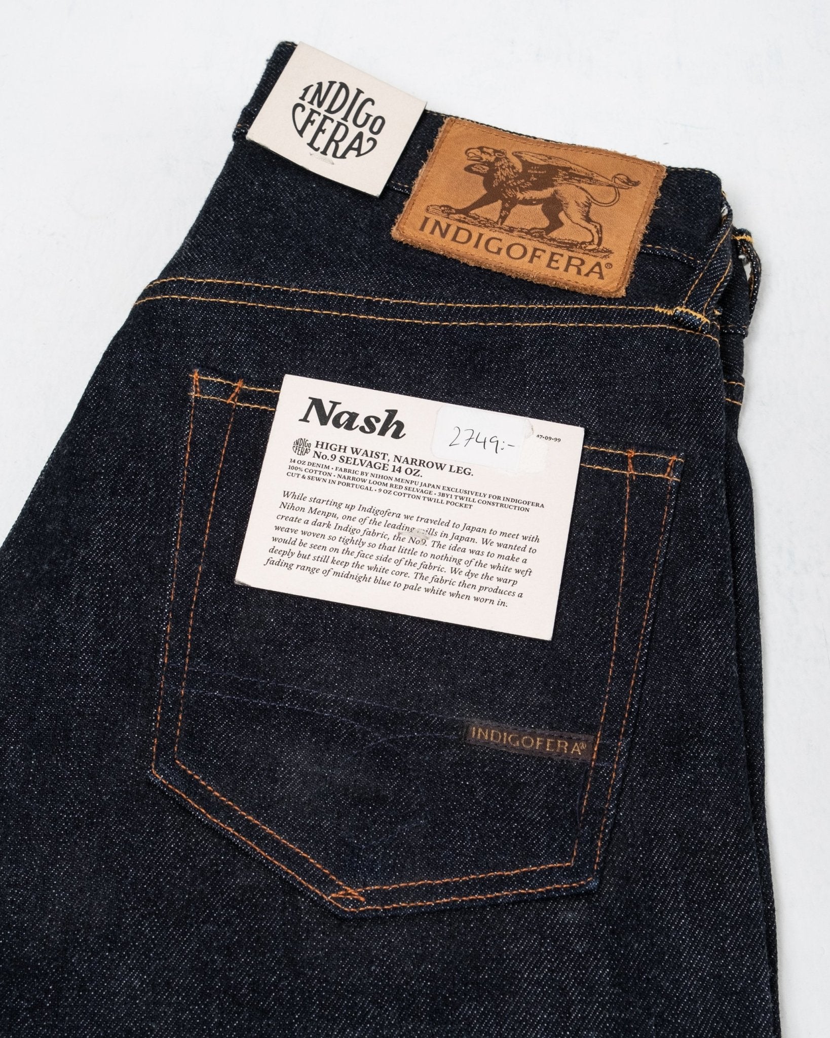 Un hermoso modelo delgado y cónico con cintura alta de la marca sueca de denim premium Indigofera Jeans. Talla normal. Hecho de un denim japonés de 14 oz de orillo, cosido en Portugal.