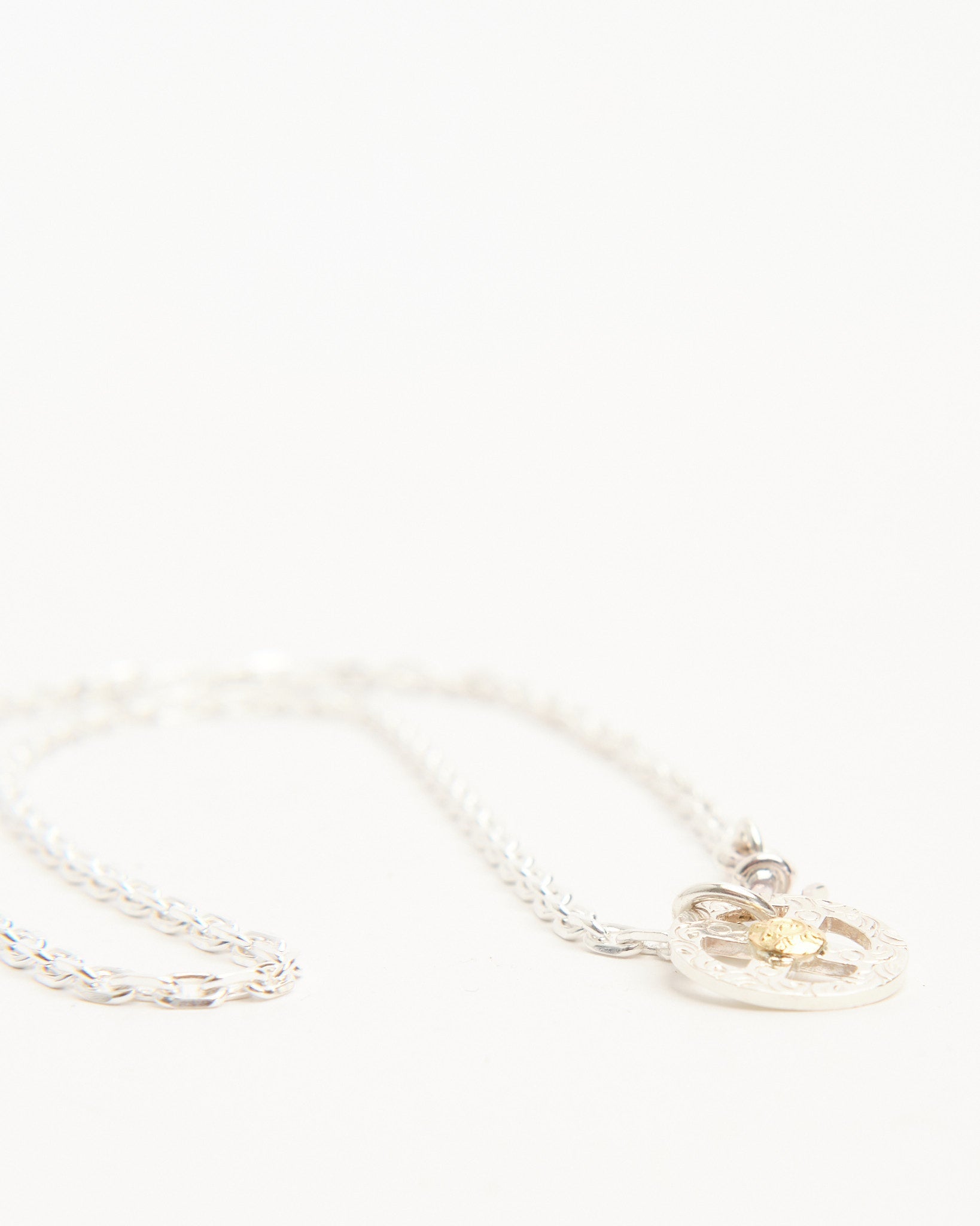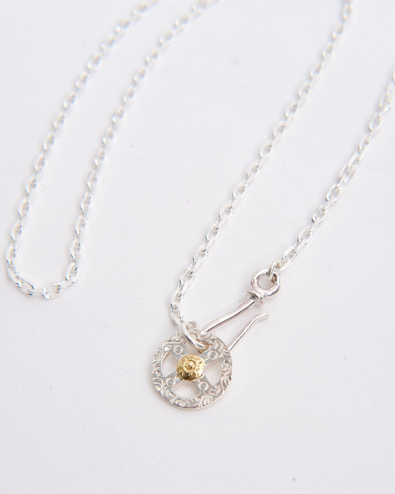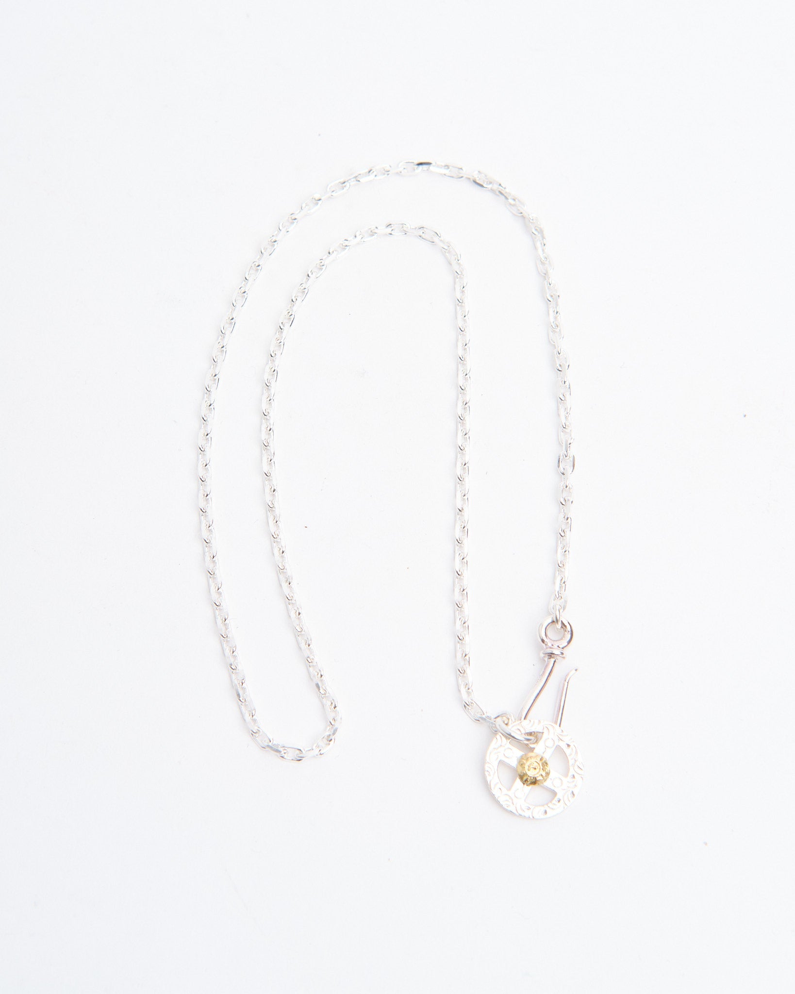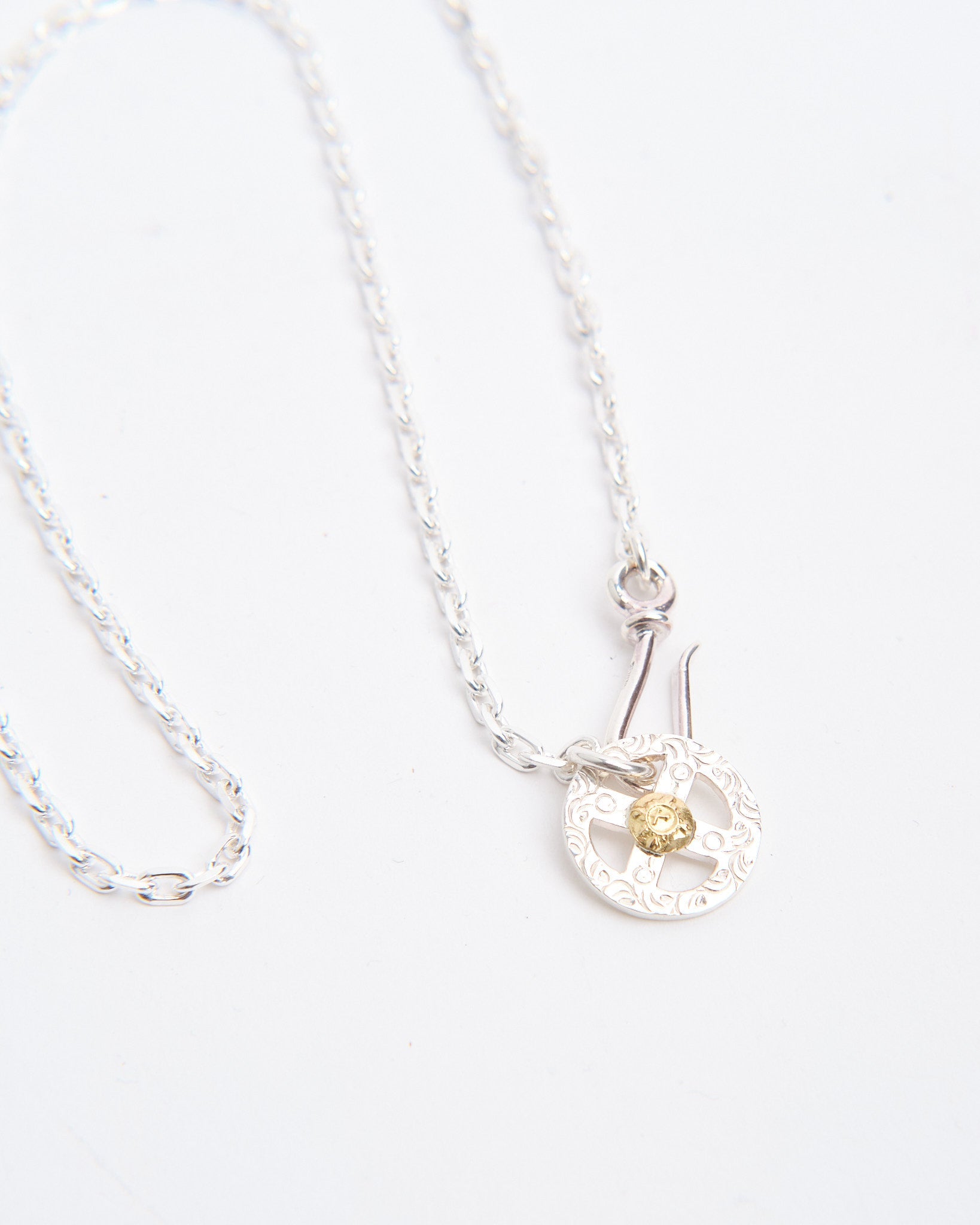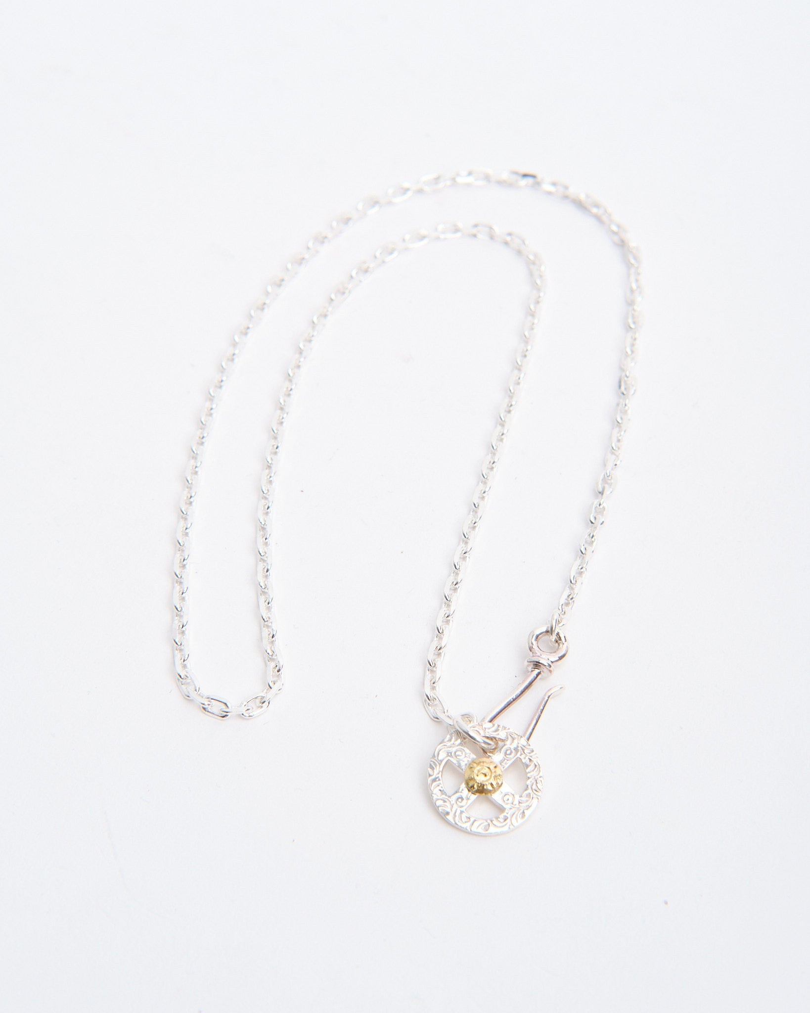The Chain S + Medicine Wheel with K18 (55cm) combines a symbolic pendant with a handcrafted silver chain, creating a complete ready-to-wear necklace. The Medicine Wheel is made in Japan from Britannia Silver 950 and finished with 18k yellow gold, representing harmony, balance, and protection. The contrast between silver and gold brings depth to the design and highlights the piece’s cultural inspiration. Attached to a 55cm silver chain, this necklace sits at a versatile length that works with both casual and refined looks. First Arrows strengthen their silver through a unique heat-treatment process, giving the piece durability while preserving its brightness. With time, the silver darkens and the gold shines warmer, making the necklace even more personal.