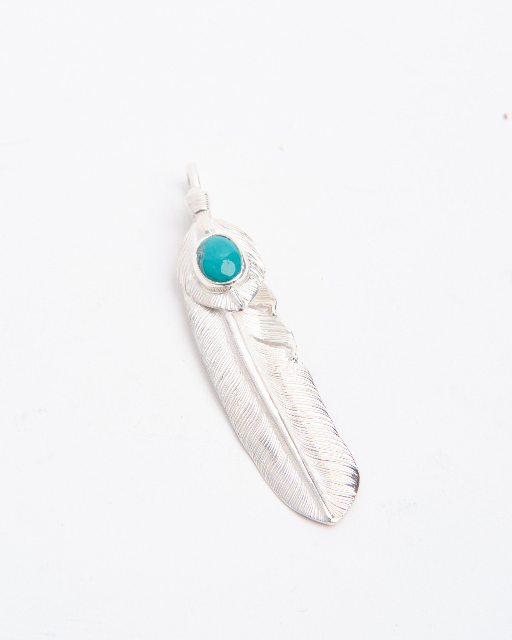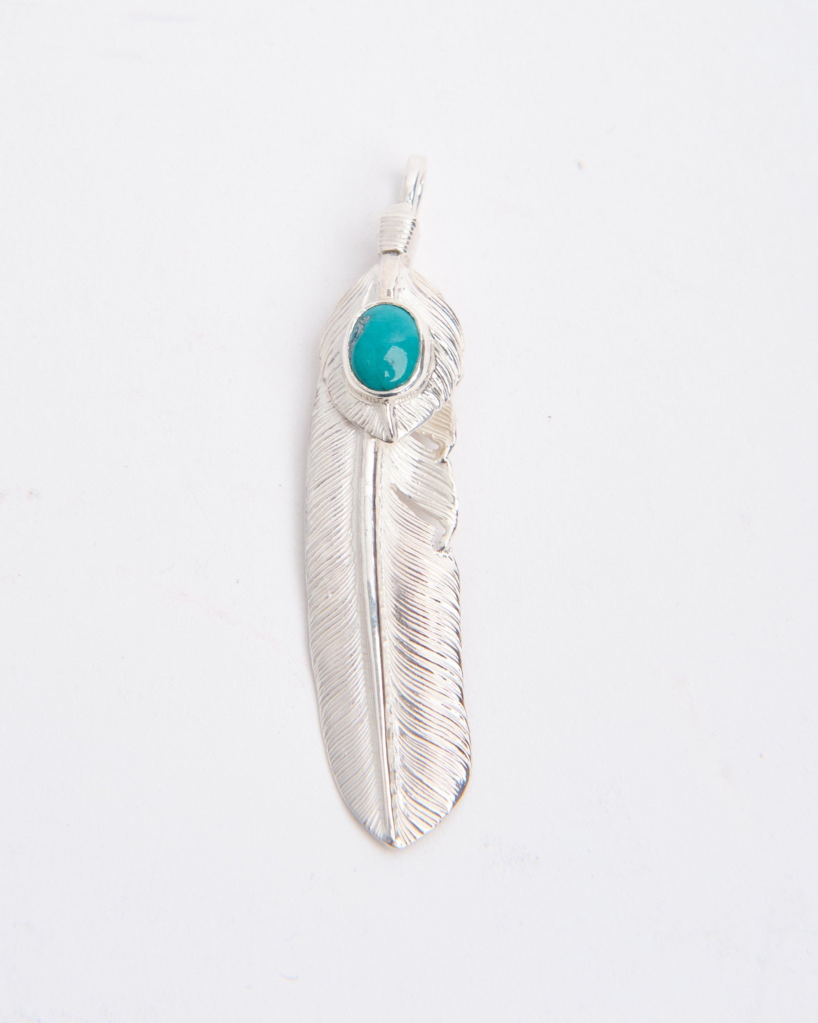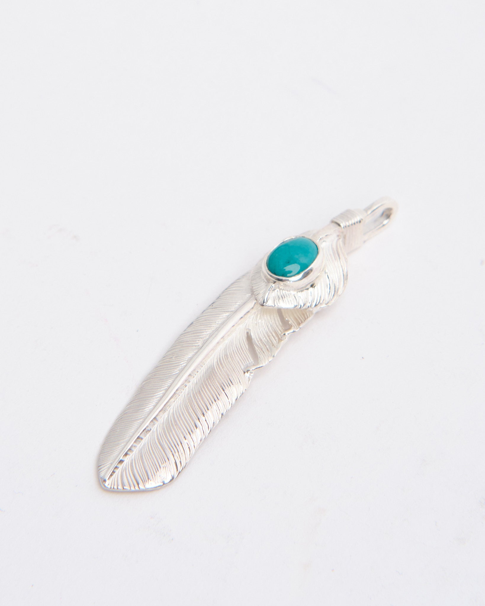 The Feather with Heartfeather with Turquoise (L) brings together two of First Arrows’ most iconic motifs in one powerful piece. Handcrafted in Japan from Britannia Silver 950, the large feather carries the meaning of freedom and positive spirit, while the heartfeather adds warmth and protection. At the center sits a genuine turquoise stone, each one unique in colour and pattern, long believed to offer strength and protection from misfortune. The silver is treated with First Arrows’ special heat process, making it durable while keeping its natural brilliance. Designed with Native American inspiration yet finished with modern refinement, this pendant is both meaningful and versatile, ready to be worn daily or layered with other treasures.
