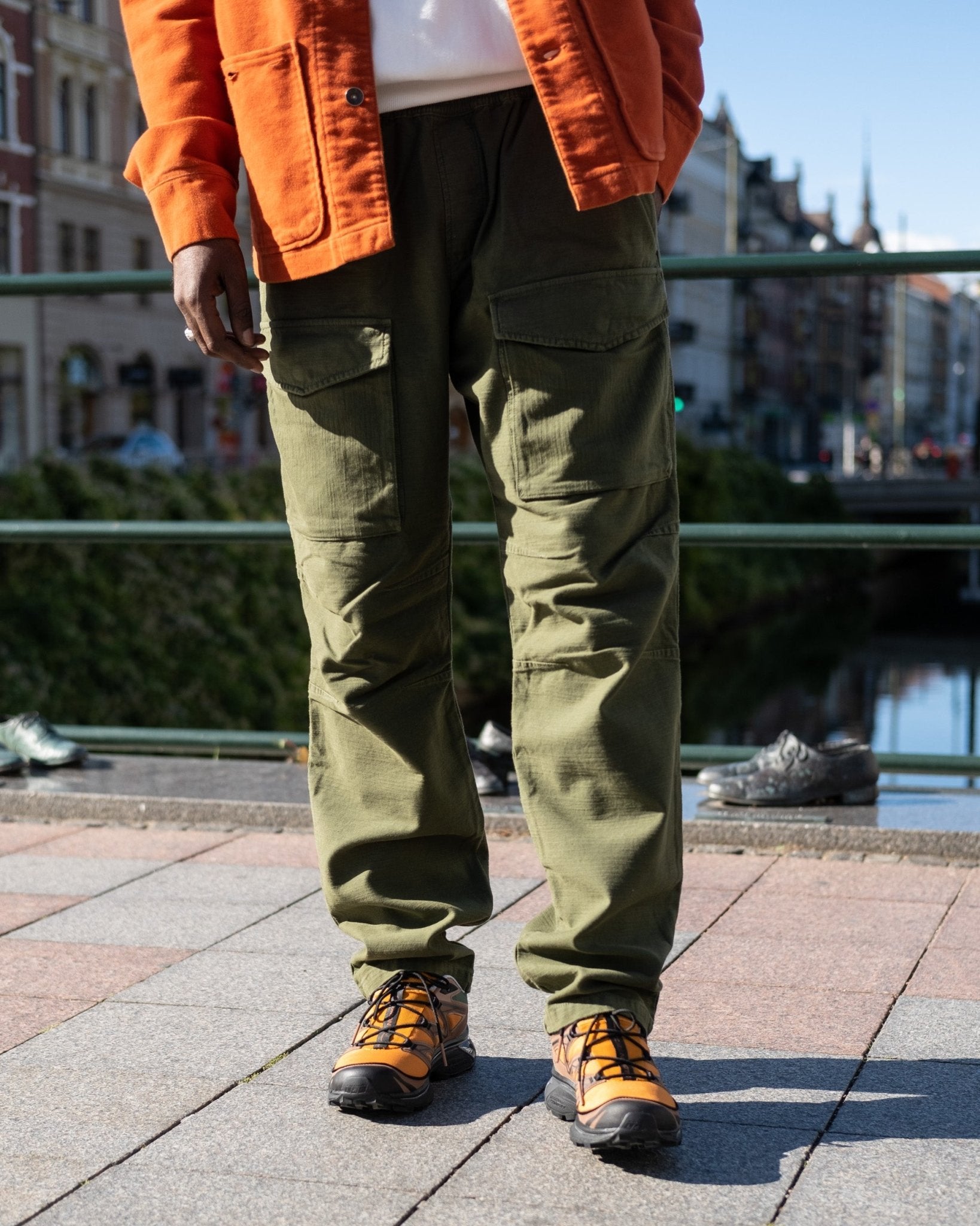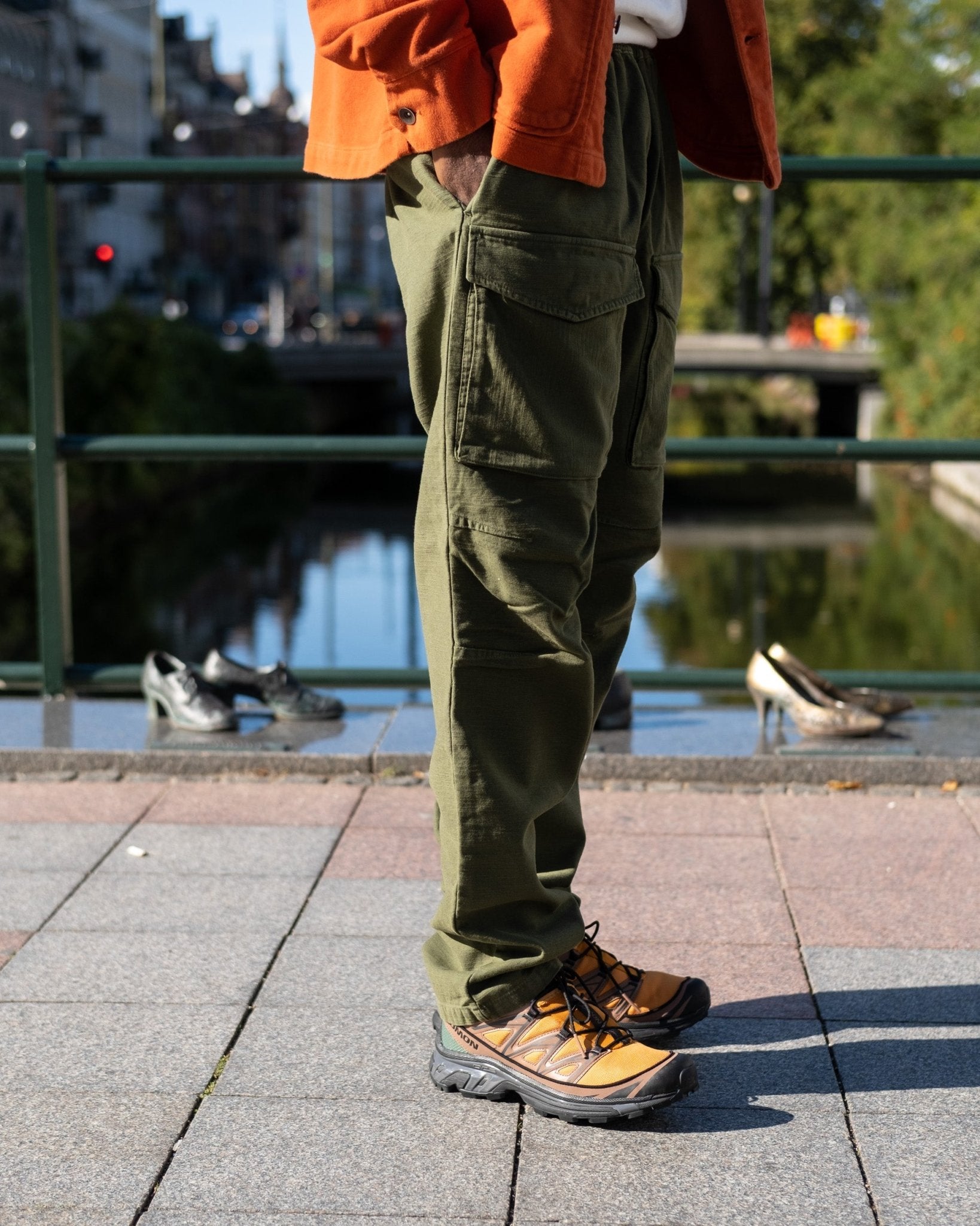 Easy Pant Sateen Olive de Tellason es un ajuste relajado y cónico hecho de un satén de algodón 100%. Cuenta con dos bolsillos laterales regulares y dos bolsillos en el muslo delantero con cierre de botón a presión. También tiene una cintura elástica que se ajusta con un cordón y una zona de la entrepierna reforzada para una durabilidad superior. Hecho en Italia.
