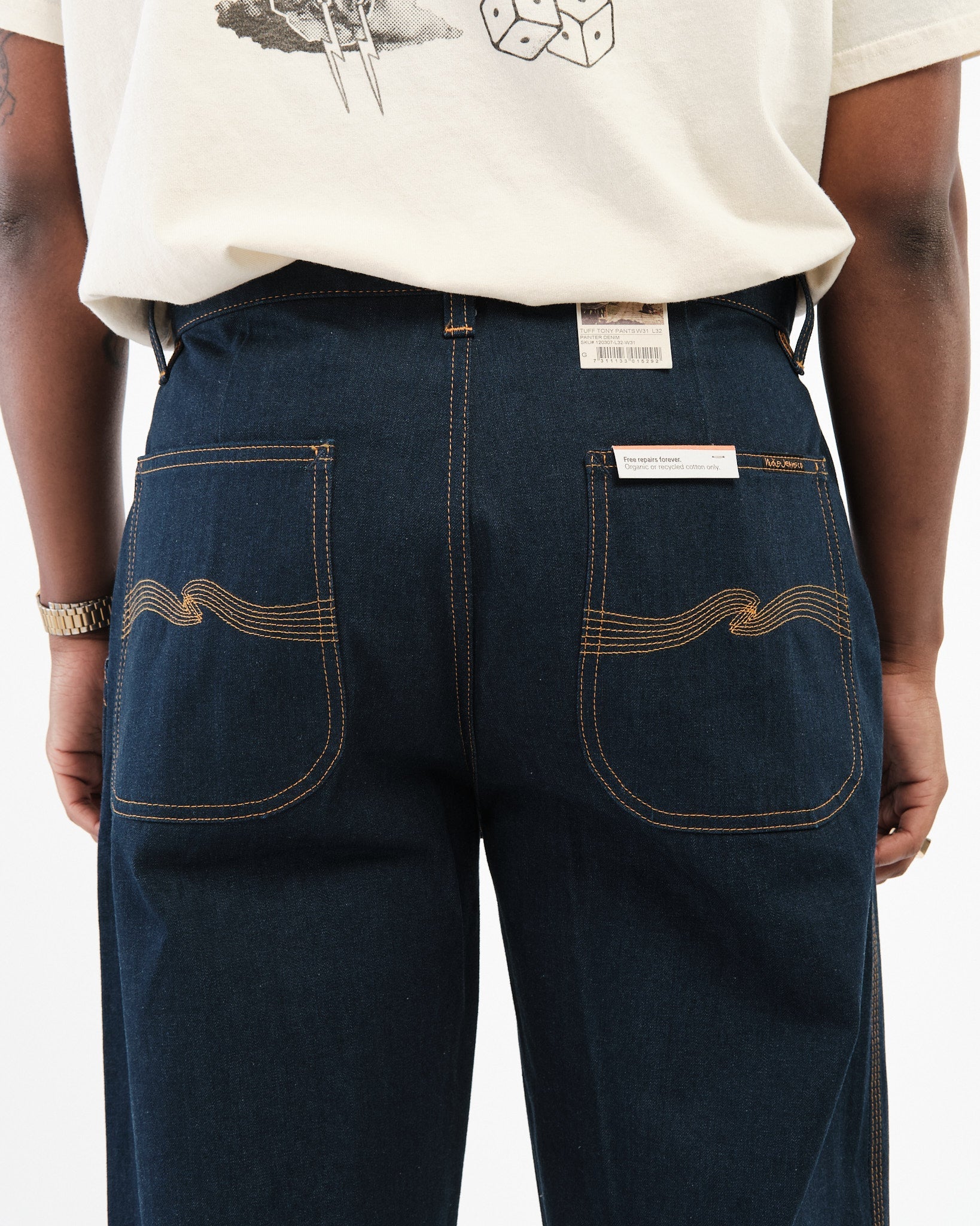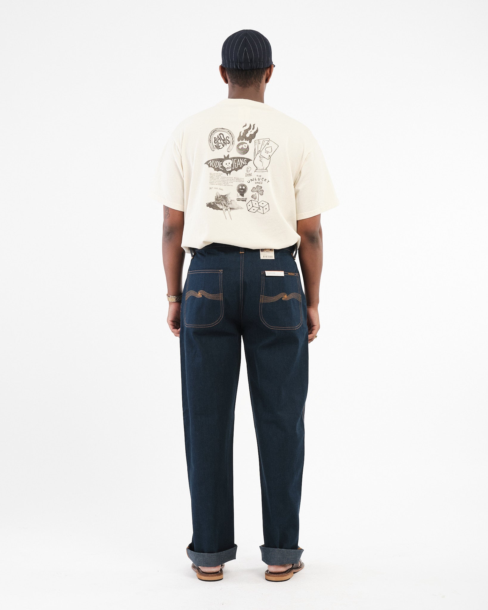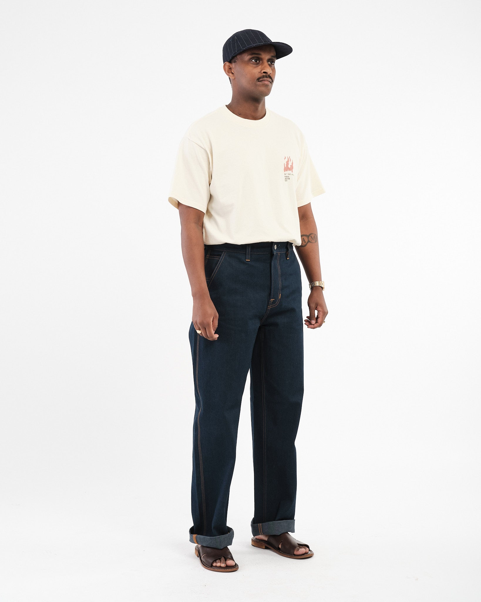 This is Tuff Tony reimagined as a classic work pant. Made from Nudie’s exclusive "Painter Denim" — a dense, 11.8 oz. organic 2/1 denim woven from irregular ring-spun yarns — these pants channel vintage workwear with depth and purpose. The indigo warp meets a grey-dyed weft for a deep, vibrant hue that breaks in beautifully over time. With a high waist, loose fit, and wide legs, they’re roomy where it counts. Stainless steel “donut” buttons, Nudie’s iconic orange thread, and a woven patch round it out. Built for movement, made to last, and guaranteed to age with grace.