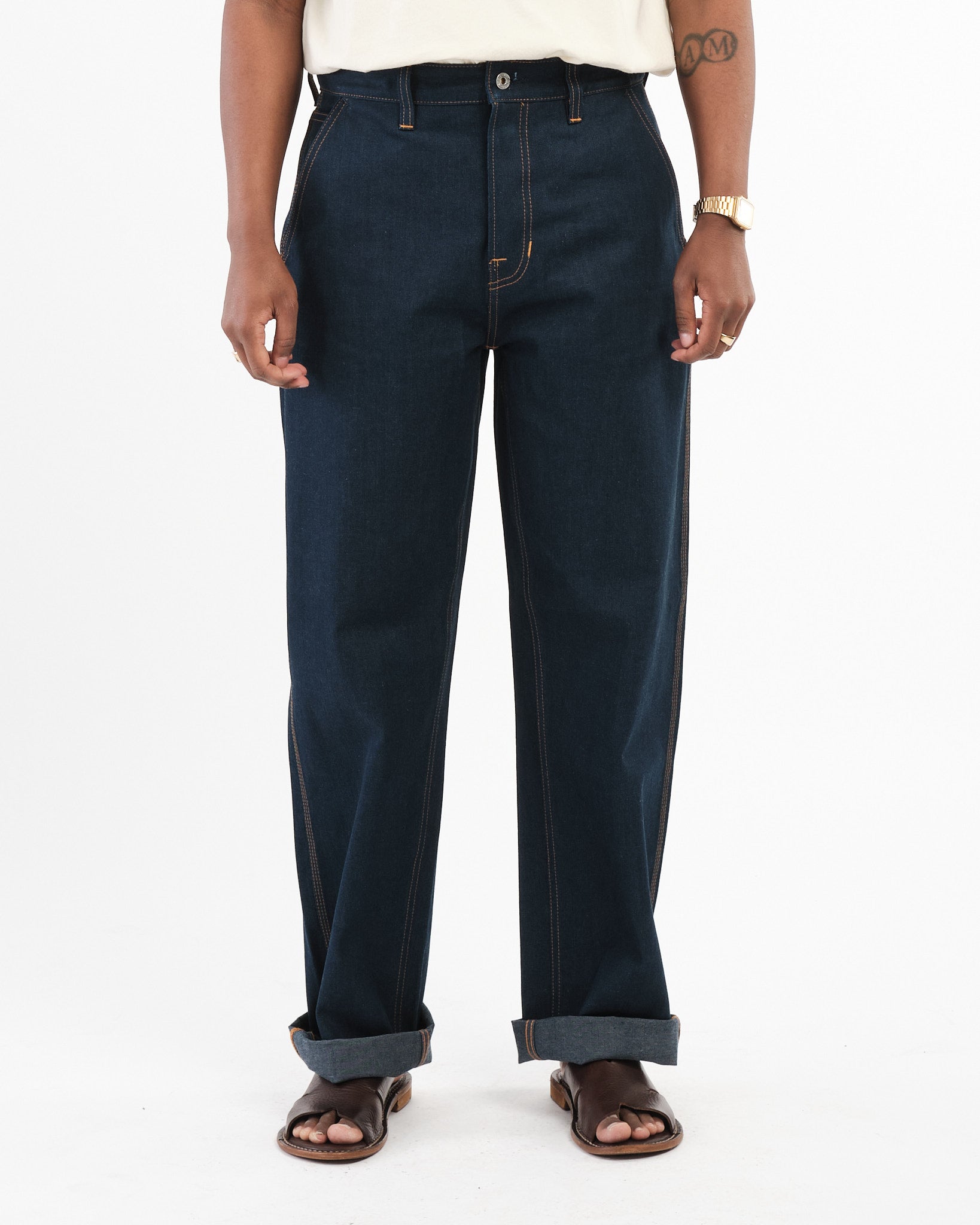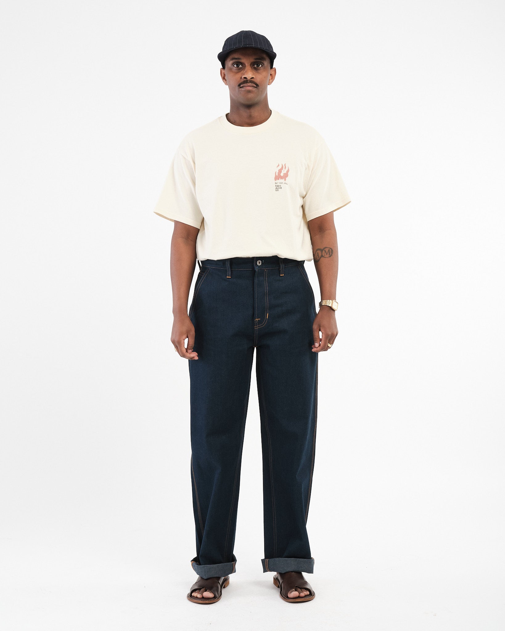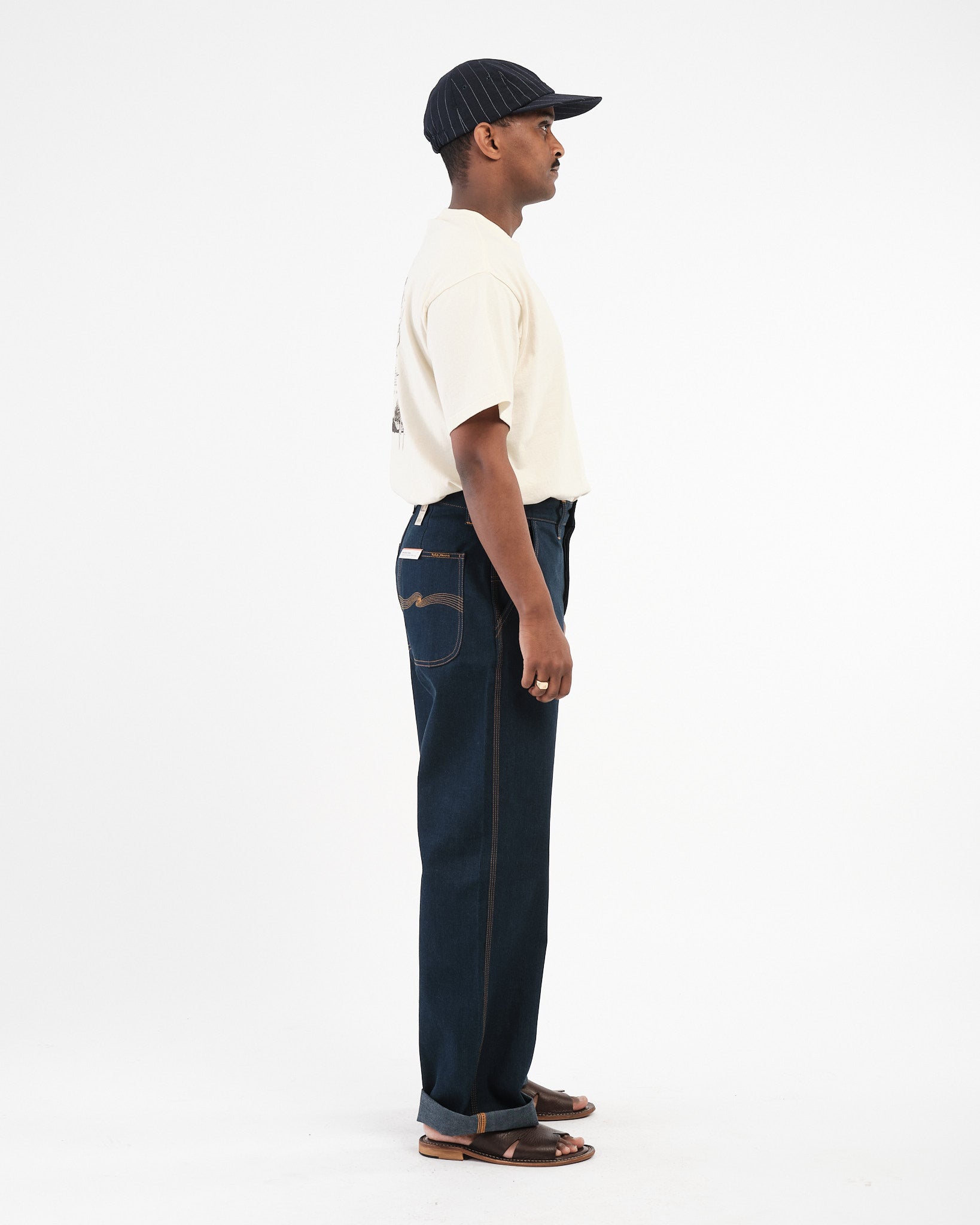 This is Tuff Tony reimagined as a classic work pant. Made from Nudie’s exclusive "Painter Denim" — a dense, 11.8 oz. organic 2/1 denim woven from irregular ring-spun yarns — these pants channel vintage workwear with depth and purpose. The indigo warp meets a grey-dyed weft for a deep, vibrant hue that breaks in beautifully over time. With a high waist, loose fit, and wide legs, they’re roomy where it counts. Stainless steel “donut” buttons, Nudie’s iconic orange thread, and a woven patch round it out. Built for movement, made to last, and guaranteed to age with grace.