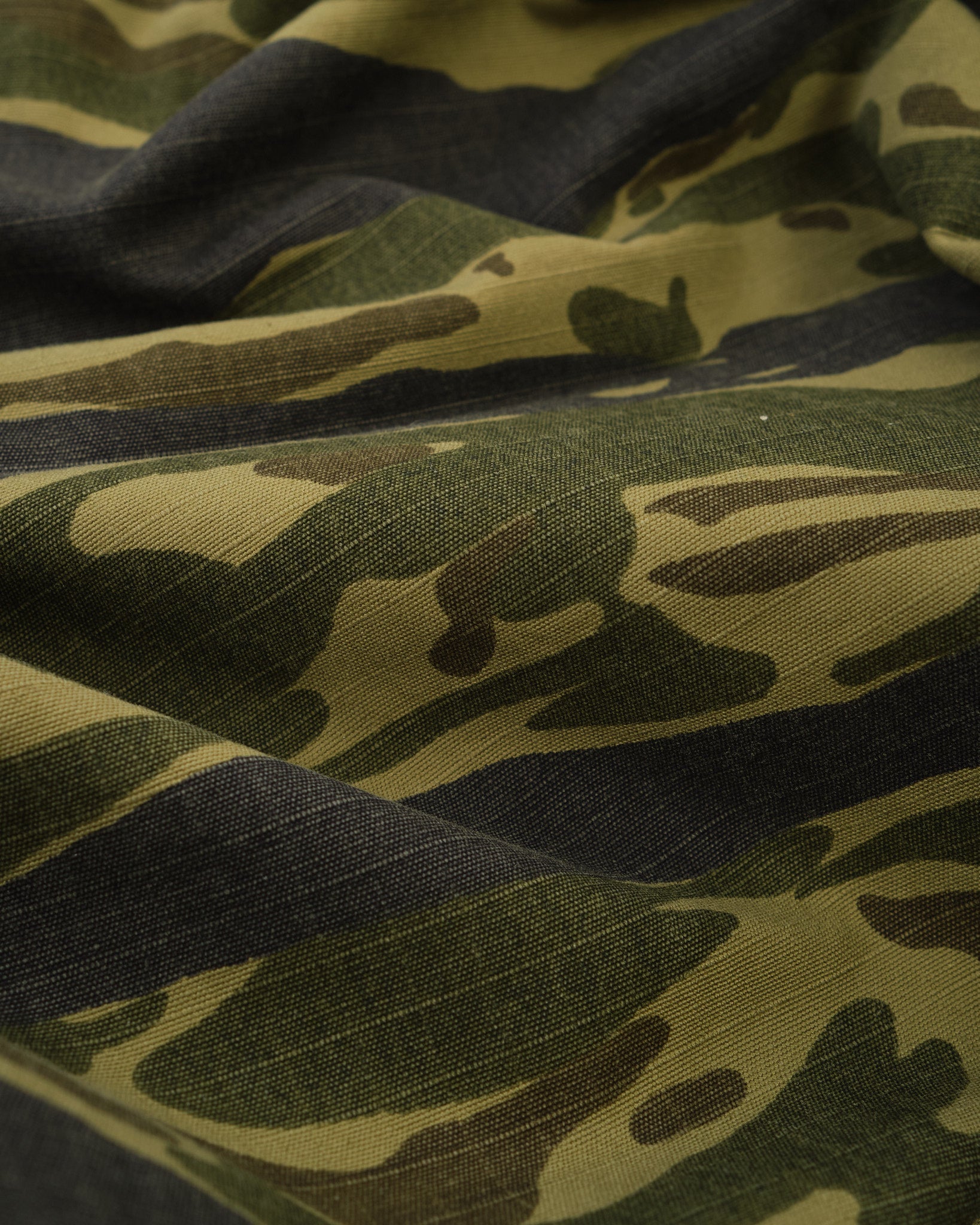 Lo destacado es el estampado de camuflaje de tigre, aplicado a un algodón texturizado que se suaviza con el uso mientras mantiene su forma. Un ajuste recto regular proporciona espacio a través del muslo con un ligero estrechamiento debajo de la rodilla para una silueta militar refinada. Ya sea usados largos o con dobladillo, estos son pantalones funcionales con un poco de actitud salvaje, clásicos de orSlow, con un giro de camuflaje.