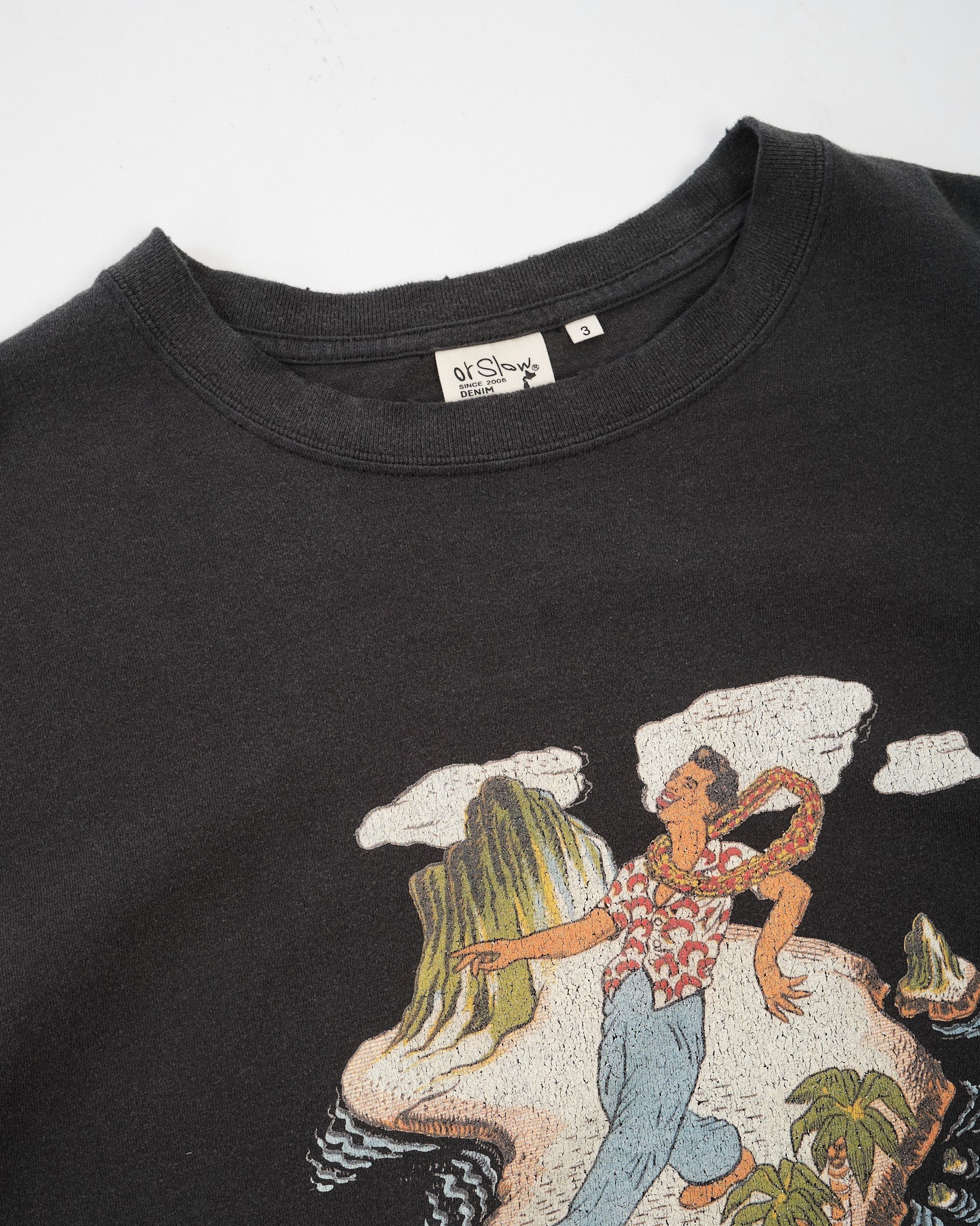 Hecha de jersey de algodón suave, la tela tiene un carácter naturalmente desgastado que complementa la impresión gráfica desvanecida. La obra de arte inspirada en Hawai está intencionalmente desgastada, creando una expresión auténtica y desgastada por el tiempo en lugar de un aspecto nítido y recién impreso.