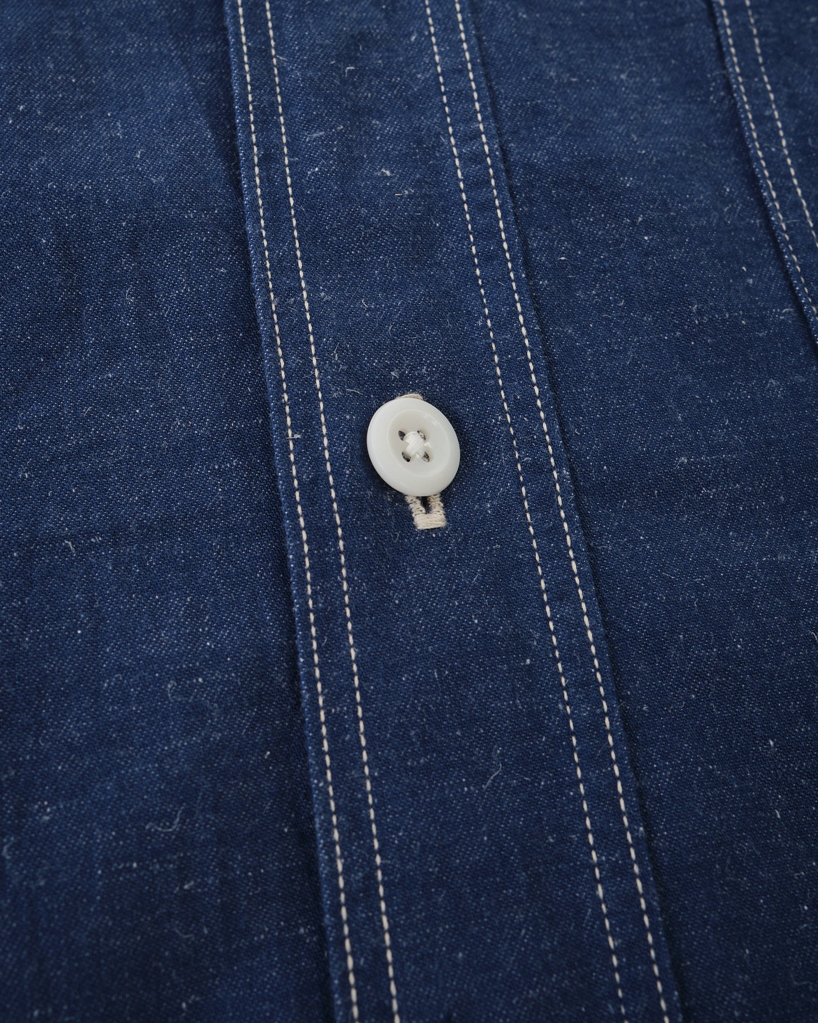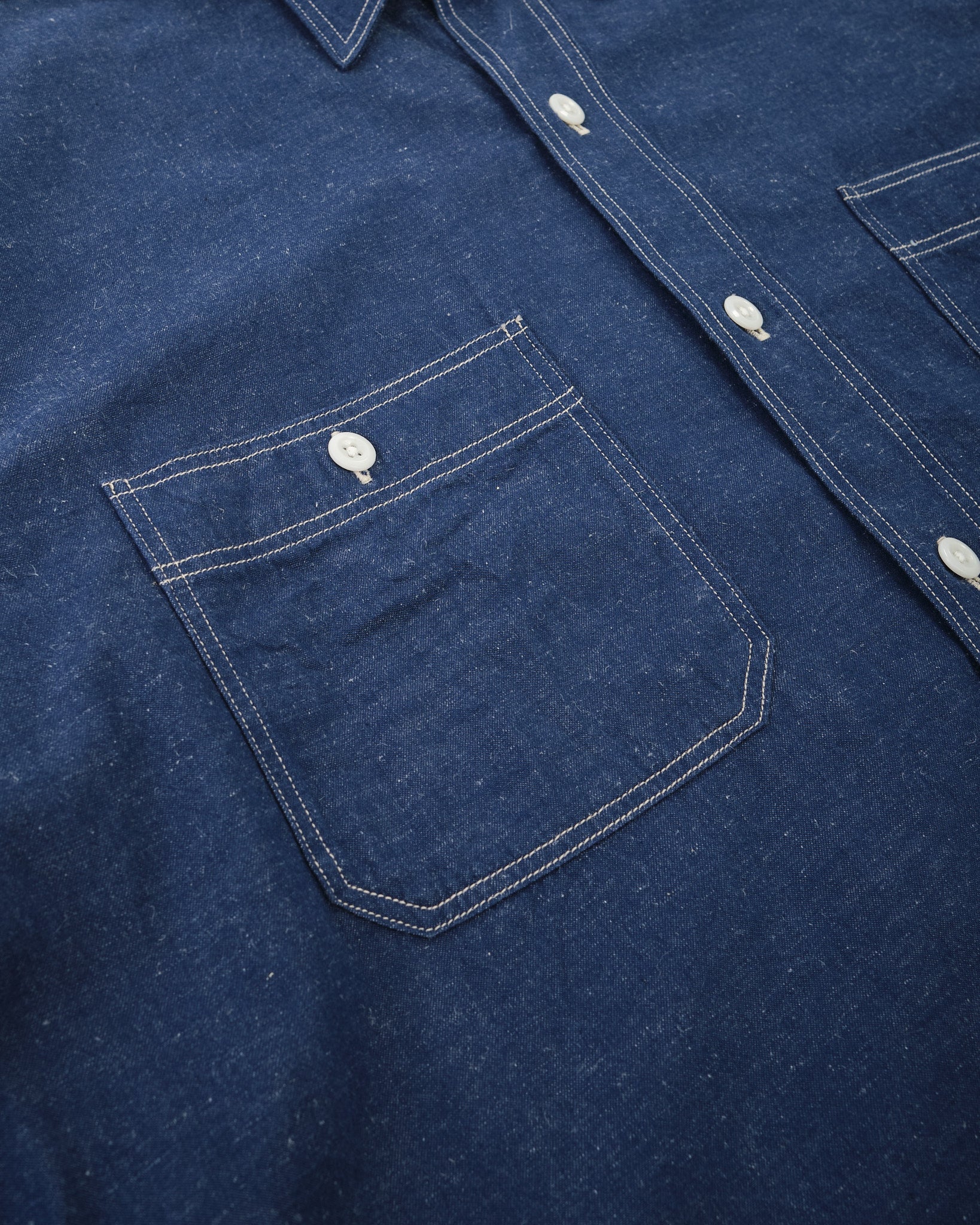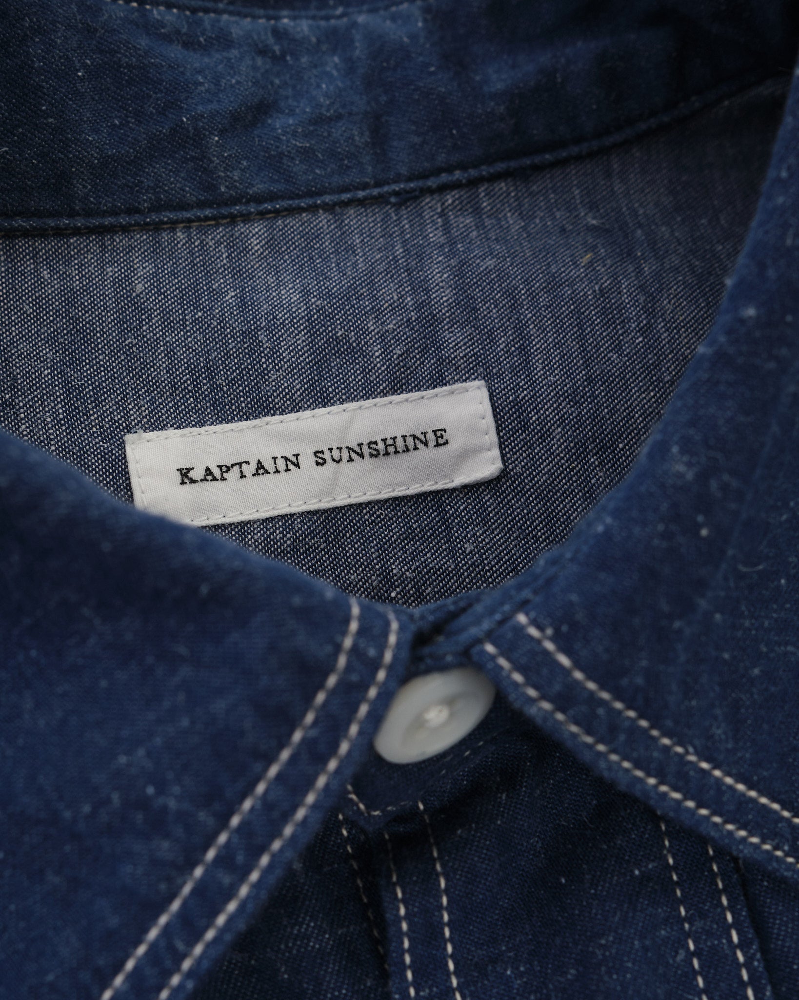 La Camisa de Trabajo KAPTAIN SUNSHINE (KSBSSH03) en Azul Índigo es un impresionante ejemplo de ropa de trabajo de alta calidad. Hecha con una mezcla de algodón Suvin de fibra extra larga y cáñamo, el hilo original es teñido con índigo, ofreciendo un color rico y profundo que envejece bellamente con el tiempo. Esta tela está tejida con alta densidad en un antiguo telar de lanzadera, incorporando lentamente aire en la trama para añadir textura y durabilidad. El resultado es un material que no solo luce genial sino que evoluciona con el uso, volviéndose aún más único a medida que pasa el tiempo.
