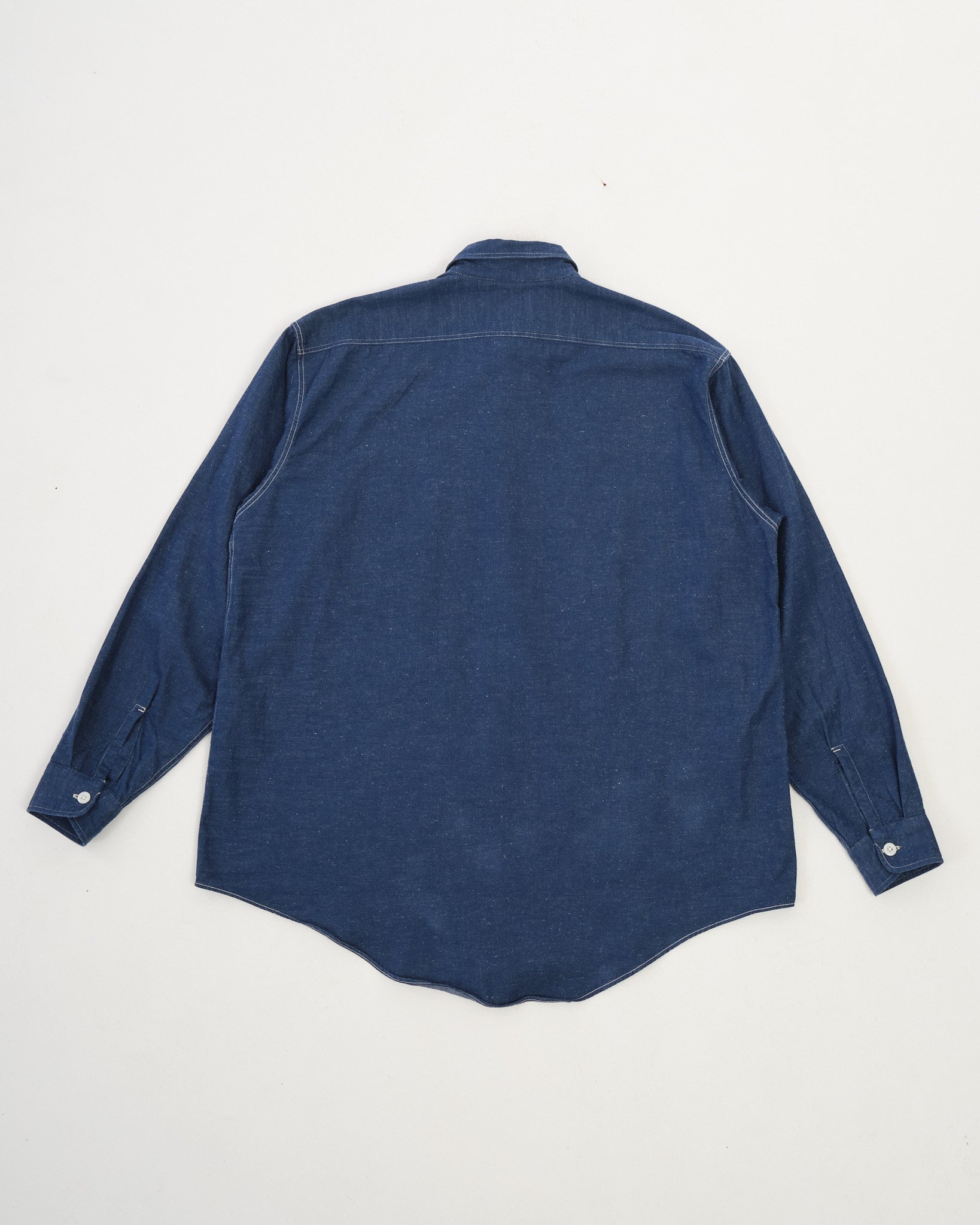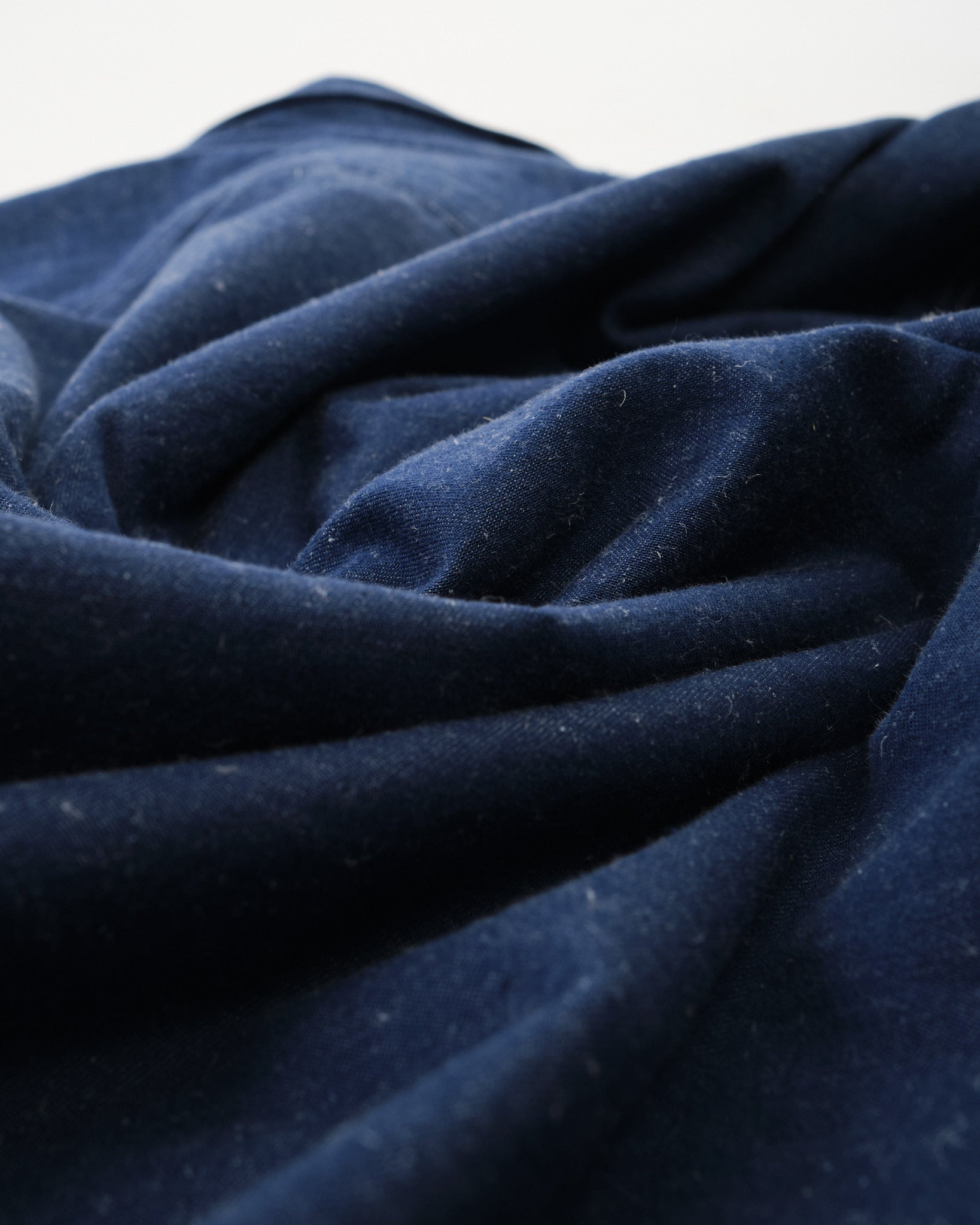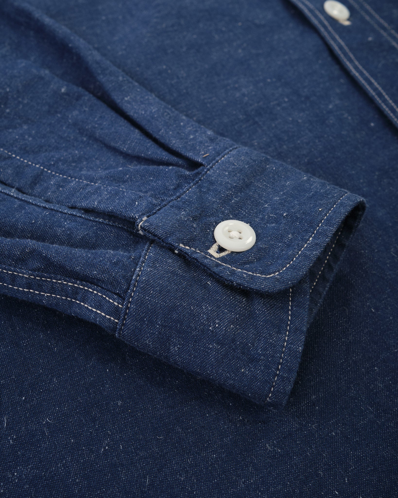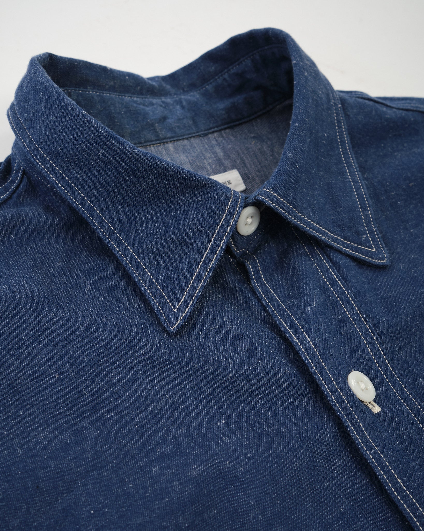 La Camisa de Trabajo KAPTAIN SUNSHINE (KSBSSH03) en Azul Índigo es un impresionante ejemplo de ropa de trabajo de alta calidad. Hecha con una mezcla de algodón Suvin de fibra extra larga y cáñamo, el hilo original es teñido con índigo, ofreciendo un color rico y profundo que envejece bellamente con el tiempo. Esta tela está tejida con alta densidad en un antiguo telar de lanzadera, incorporando lentamente aire en la trama para añadir textura y durabilidad. El resultado es un material que no solo luce genial sino que evoluciona con el uso, volviéndose aún más único a medida que pasa el tiempo.